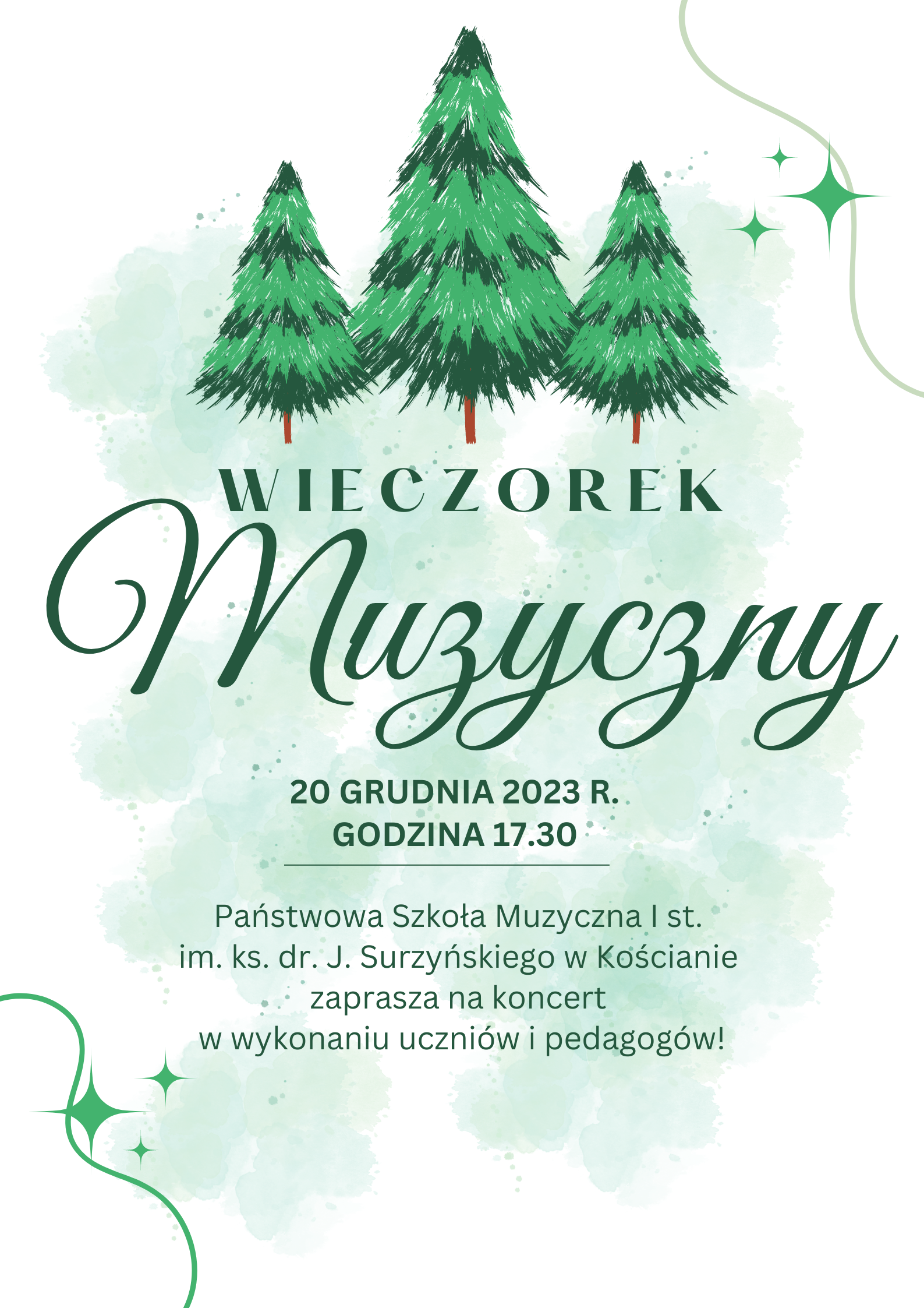 Zapraszamy na Wieczorek Muzyczny, który odbędzie się 20 grudnia 2023 r. o godz. 17:30 w sali koncertowej szkoły. Wystąpią uczniowie i nauczyciele.