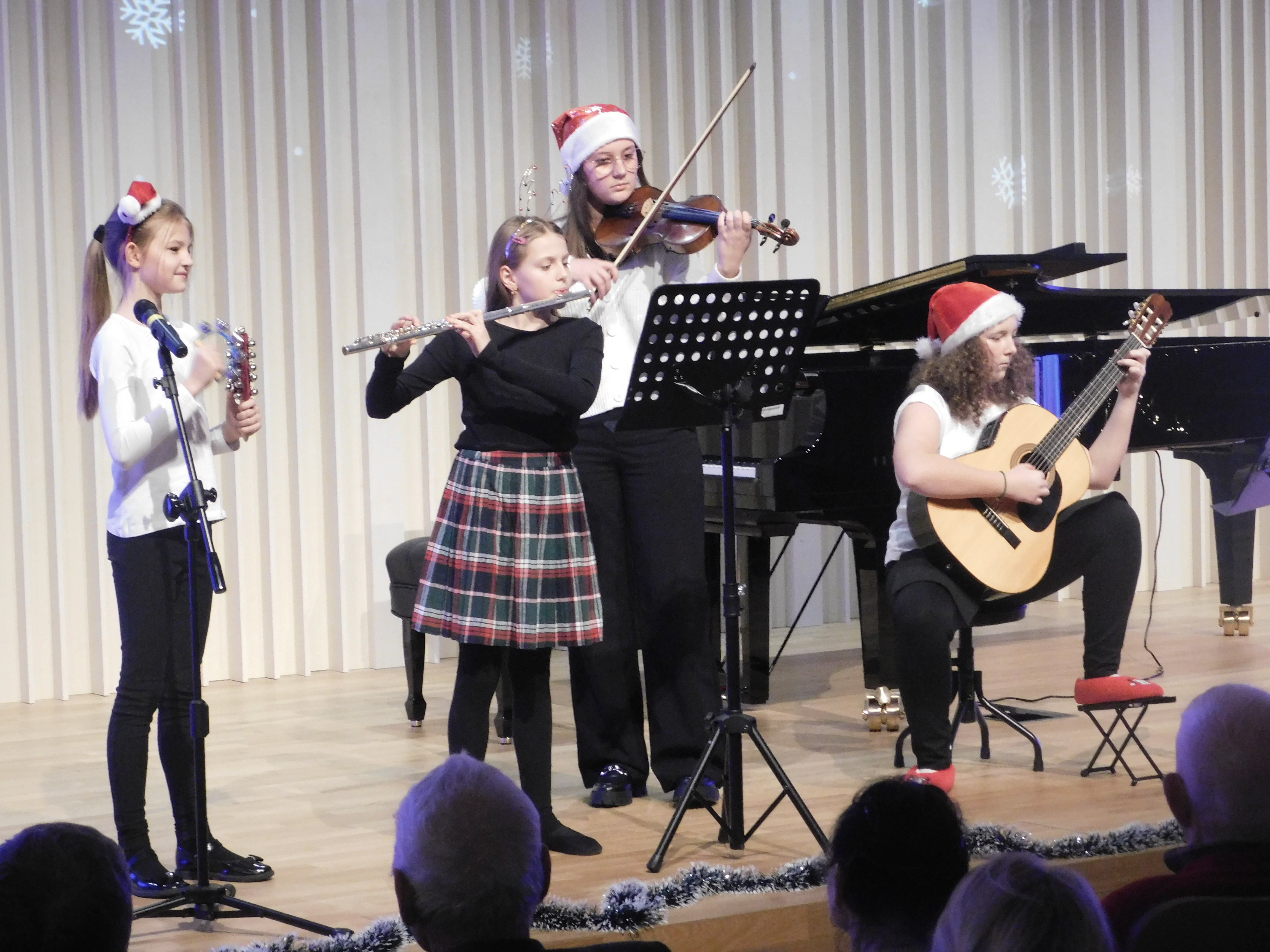Święta Bożego Narodzenia to czas, w którym szczególnie odczuwamy potrzebę bliskości, rodzinnego ciepła i miłości. Tegoroczne święta zbliżają się wielkimi krokami. Z tej okazji w czwartek 21 grudnia 2023 r. odbył się Koncert Bożonarodzeniowy w wykonaniu uczniów naszej szkoły. Na scenie zaprezentowali się uczniowie takich specjalności, jak: fortepian, organy, akordeon, skrzypce, gitara, perkusja, flet, klarnet, trąbka. Na zakończenie uroczystości wystąpił chór Liceum Ogólnokształcącego w Kościerzynie przygotowany przez Pana Tomasza Chyłę. O akompaniament zadbał Pan Jakub Stosik, a na cajonie zagrał Pan Paweł Daszkowski. Najpiękniejsze melodie, kolędy, pastorałki i bożonarodzeniowe piosenki przeniosły zgromadzoną widownię do magicznego czasu i świata, do którego tęsknimy cały rok. Podziękowania kierujemy do nauczycieli odpowiedzialnych za organizację uroczystości- Pani Klary Jachimczak i Pana Miłosza Janiaka. Dziękujemy również pozostałych nauczycielom, którzy przygotowali naszych młodych muzyków. W galerii udostępniamy zdjęcia z Koncertu Bożonarodzeniowego. Zapraszamy również do wysłuchania fragmentów koncertu. Na zakończenie życzymy wszystkim WESOŁYCH ŚWIĄT!