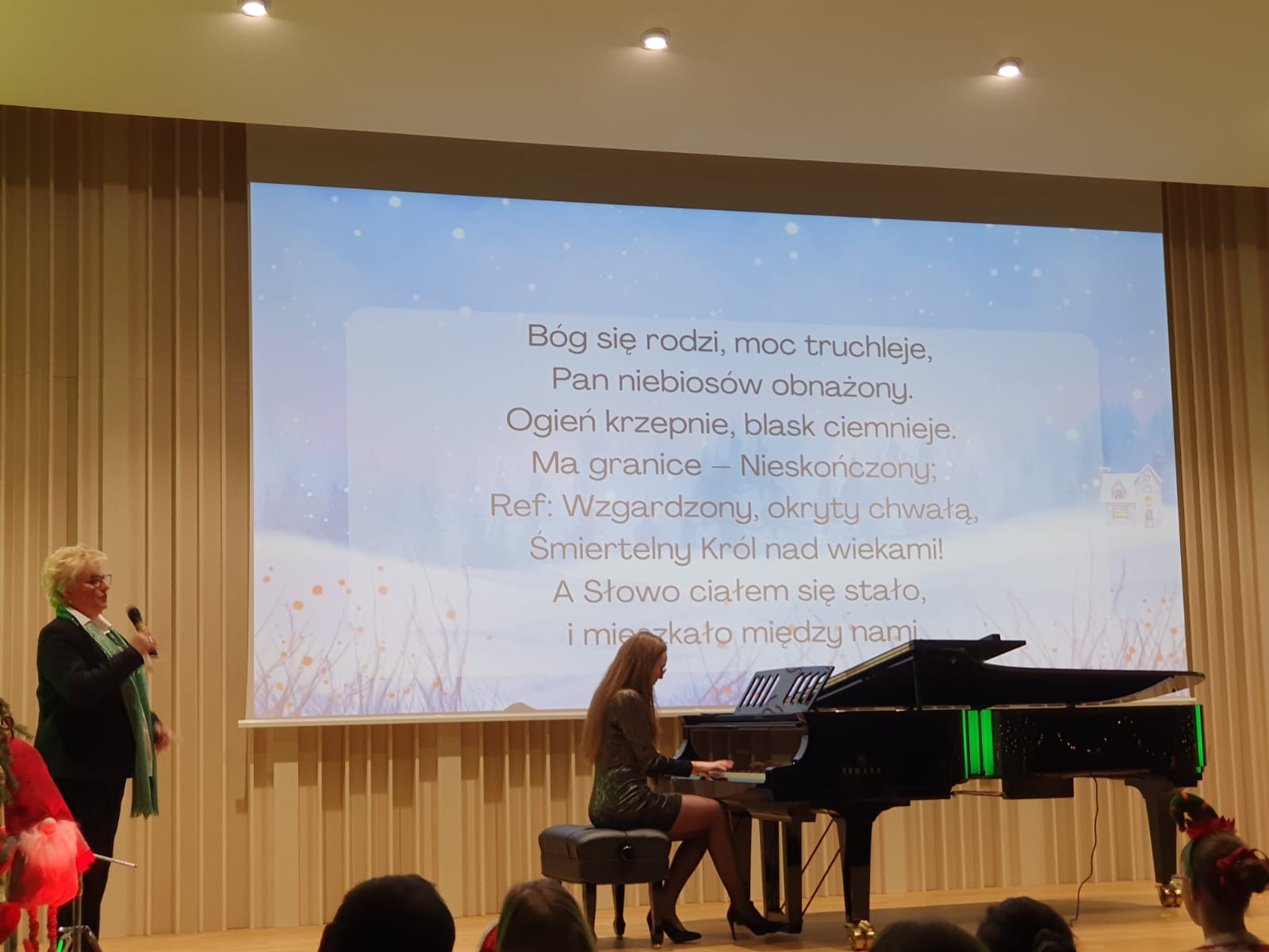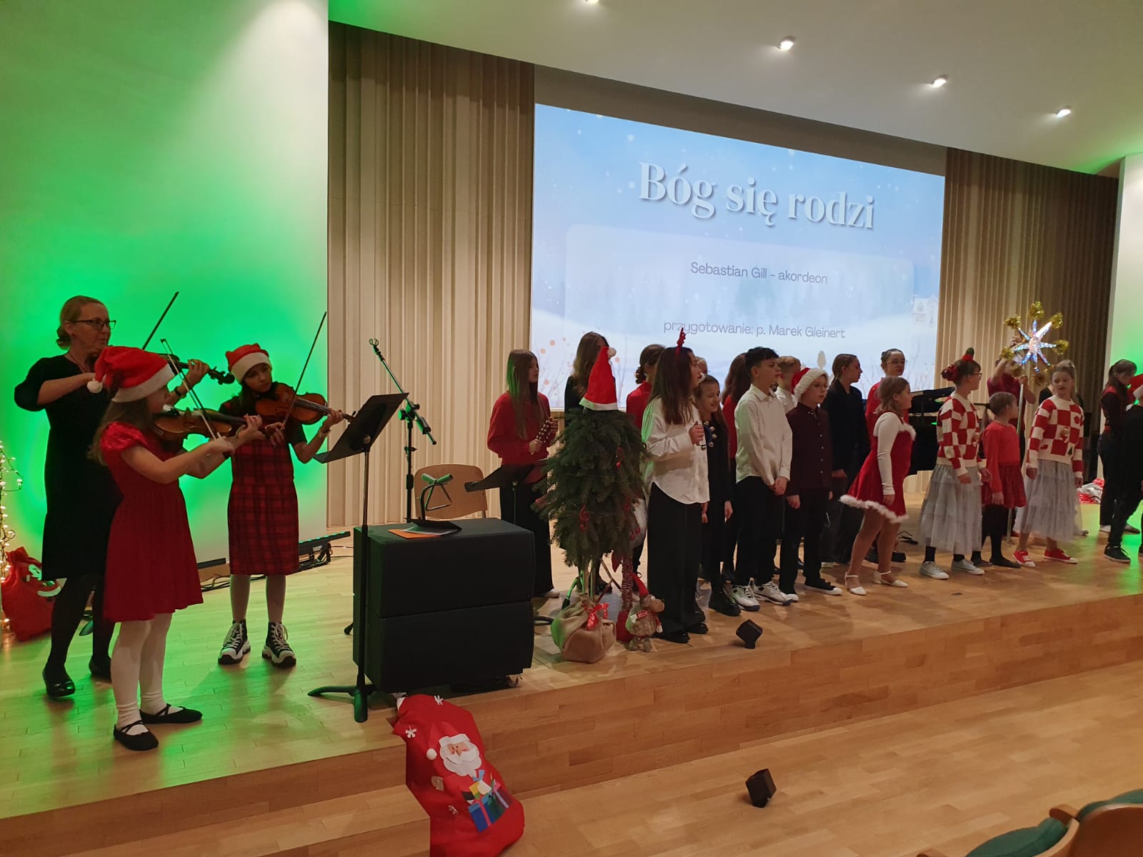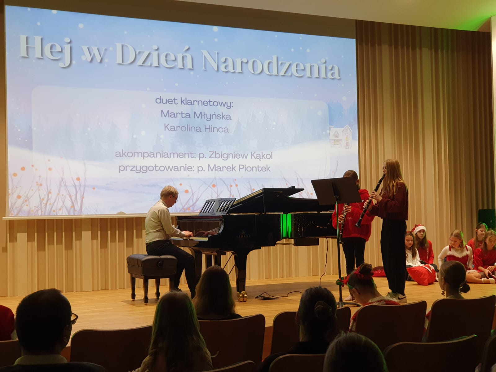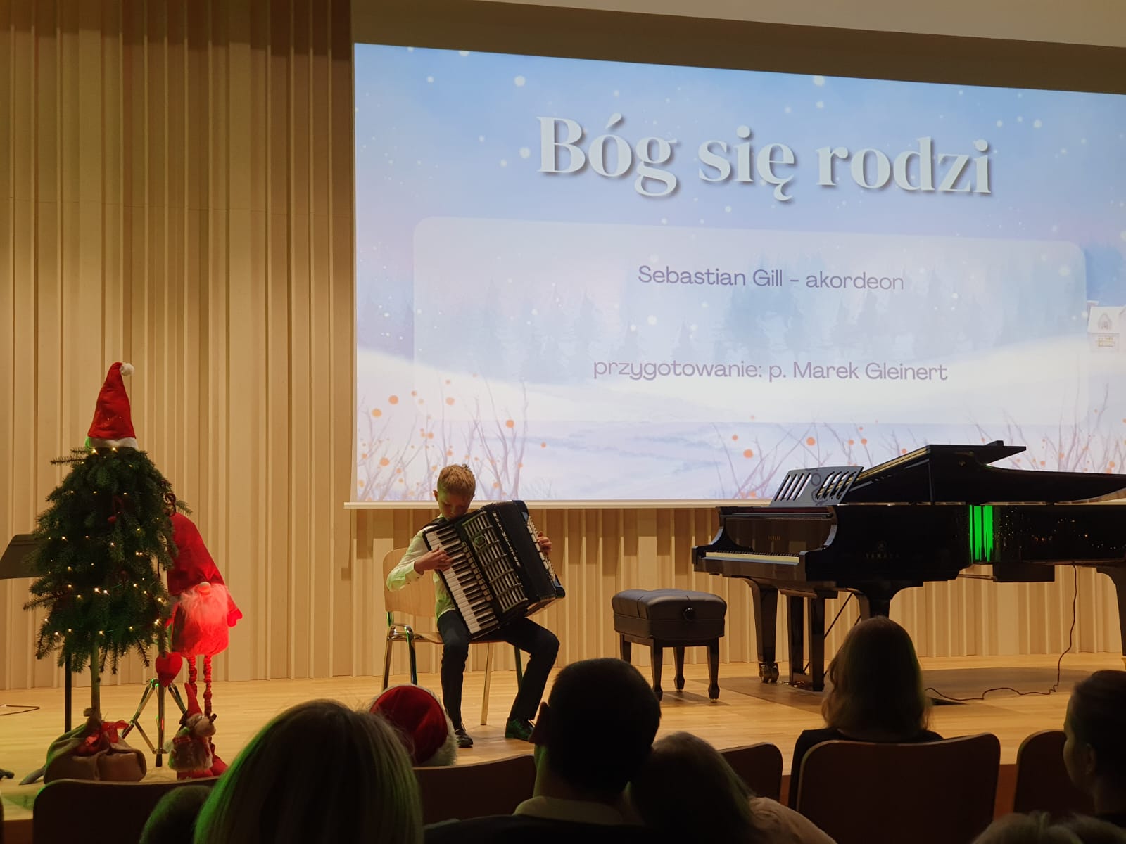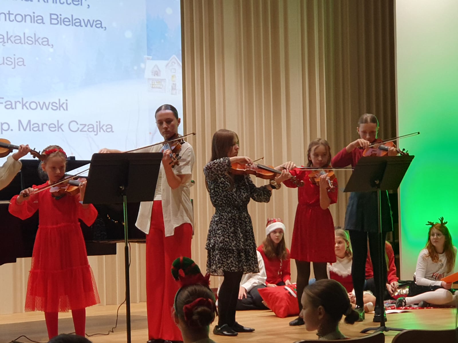 17 grudnia w naszej szkole odbył się wyjątkowy koncert kolęd w wykonaniu uczniów i nauczycieli. Wydarzenie miało miejsce w szkolnej sali koncertowej, która na tę okazję została świątecznie udekorowana. W trakcie koncertu uczniowie nie tylko grali, ale także recytowali krótkie opowiadania o tematyce bożonarodzeniowej, które wprowadziły nas w świąteczny klimat. Koncert kolęd był wspaniałą okazją, by poczuć magię nadchodzących Świąt Bożego Narodzenia. Na zakończenie wszyscy zgromadzeni w sali, uczniowie, nauczyciele i rodzice, połączyli swoje głosy, śpiewając wspólnie kolędę „Bóg się rodzi”.