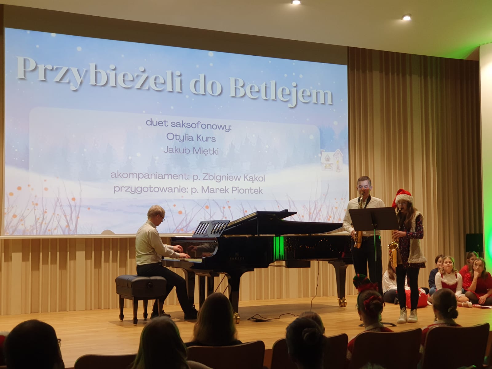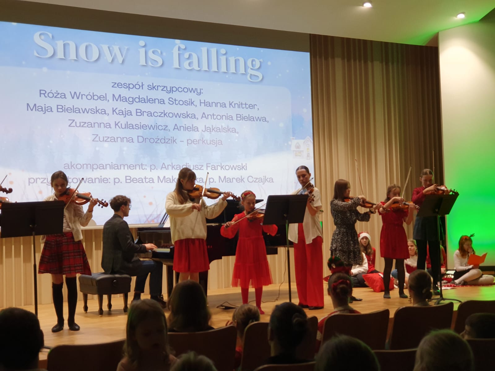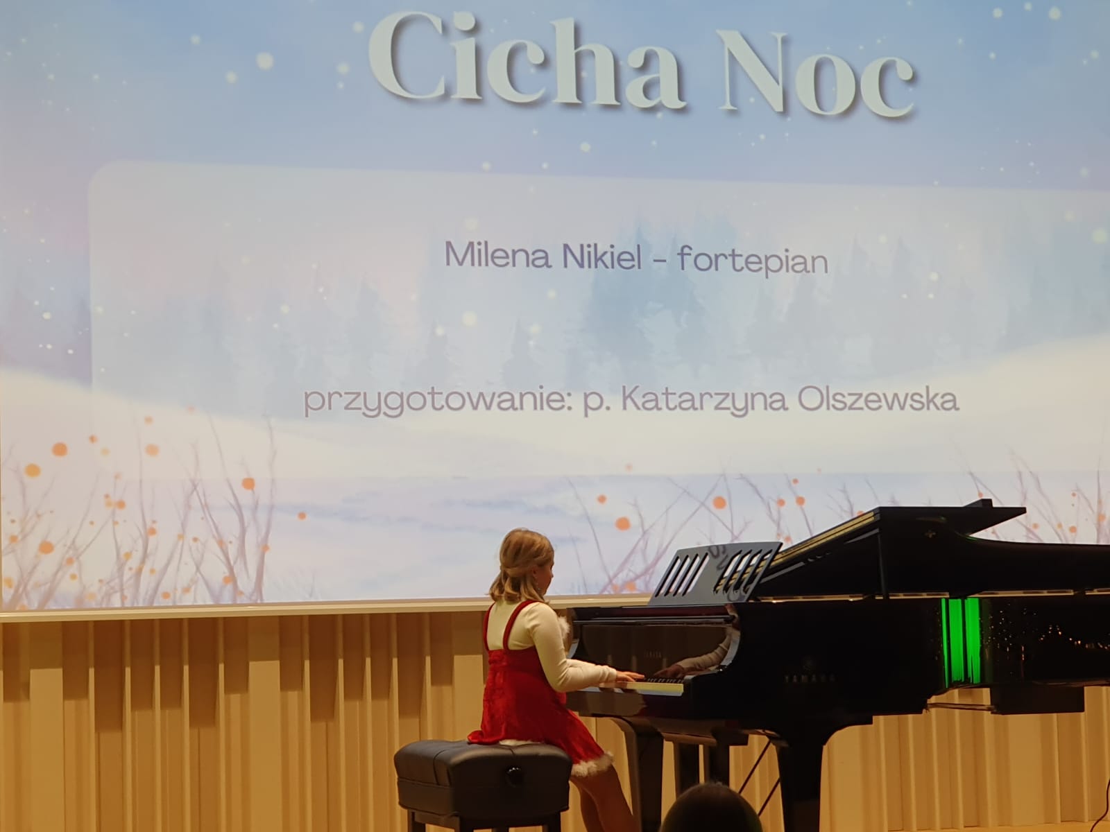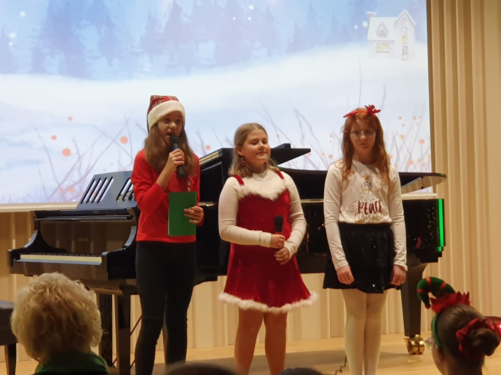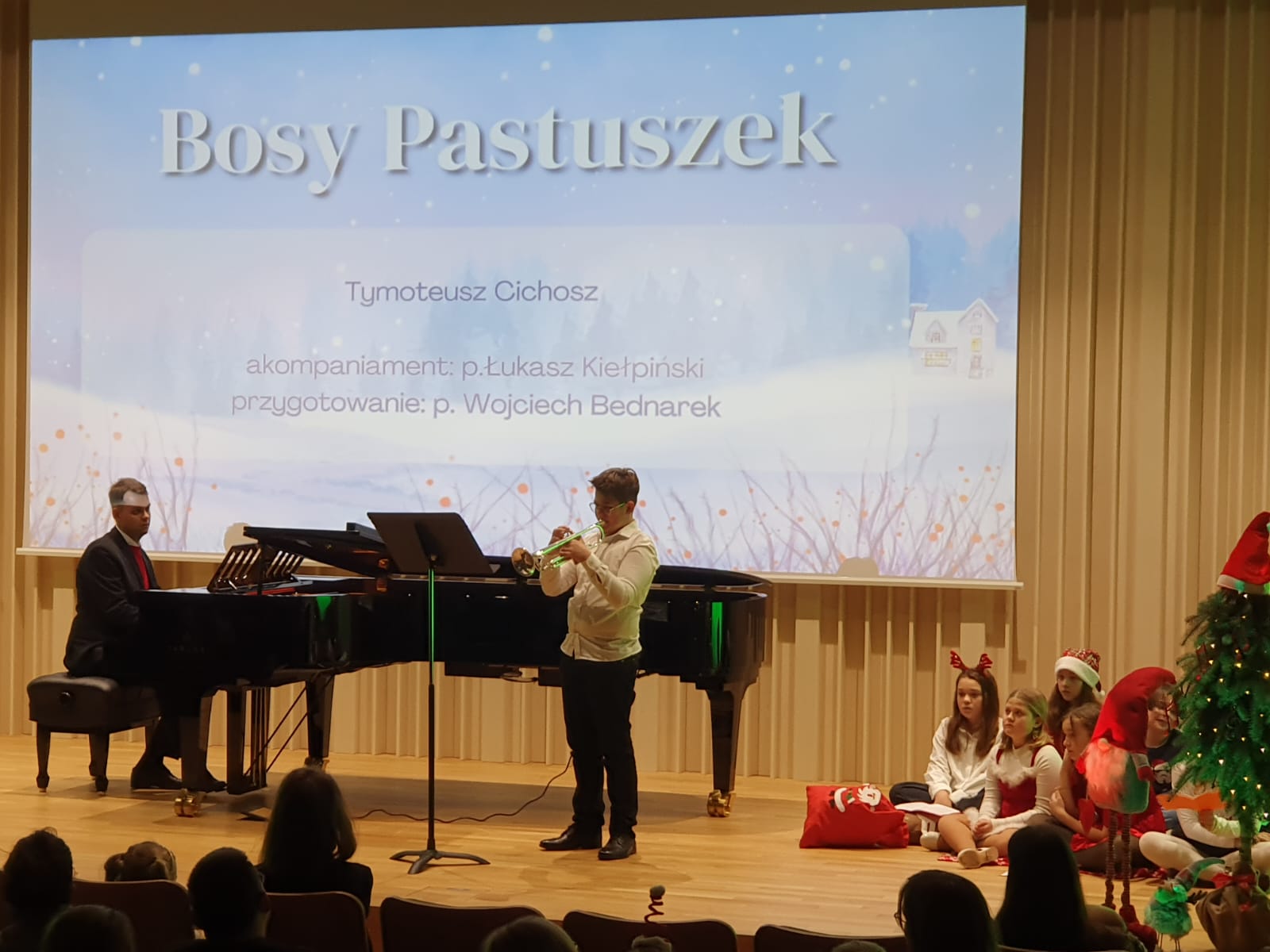17 grudnia w naszej szkole odbył się wyjątkowy koncert kolęd w wykonaniu uczniów i nauczycieli. Wydarzenie miało miejsce w szkolnej sali koncertowej, która na tę okazję została świątecznie udekorowana. W trakcie koncertu uczniowie nie tylko grali, ale także recytowali krótkie opowiadania o tematyce bożonarodzeniowej, które wprowadziły nas w świąteczny klimat. Koncert kolęd był wspaniałą okazją, by poczuć magię nadchodzących Świąt Bożego Narodzenia. Na zakończenie wszyscy zgromadzeni w sali, uczniowie, nauczyciele i rodzice, połączyli swoje głosy, śpiewając wspólnie kolędę „Bóg się rodzi”.
