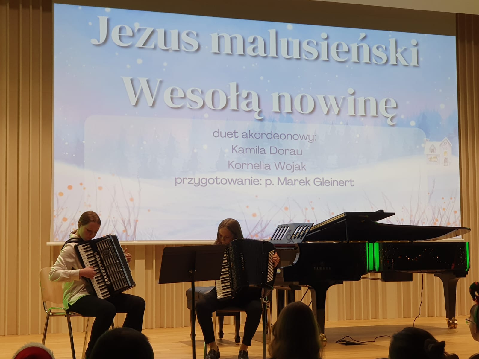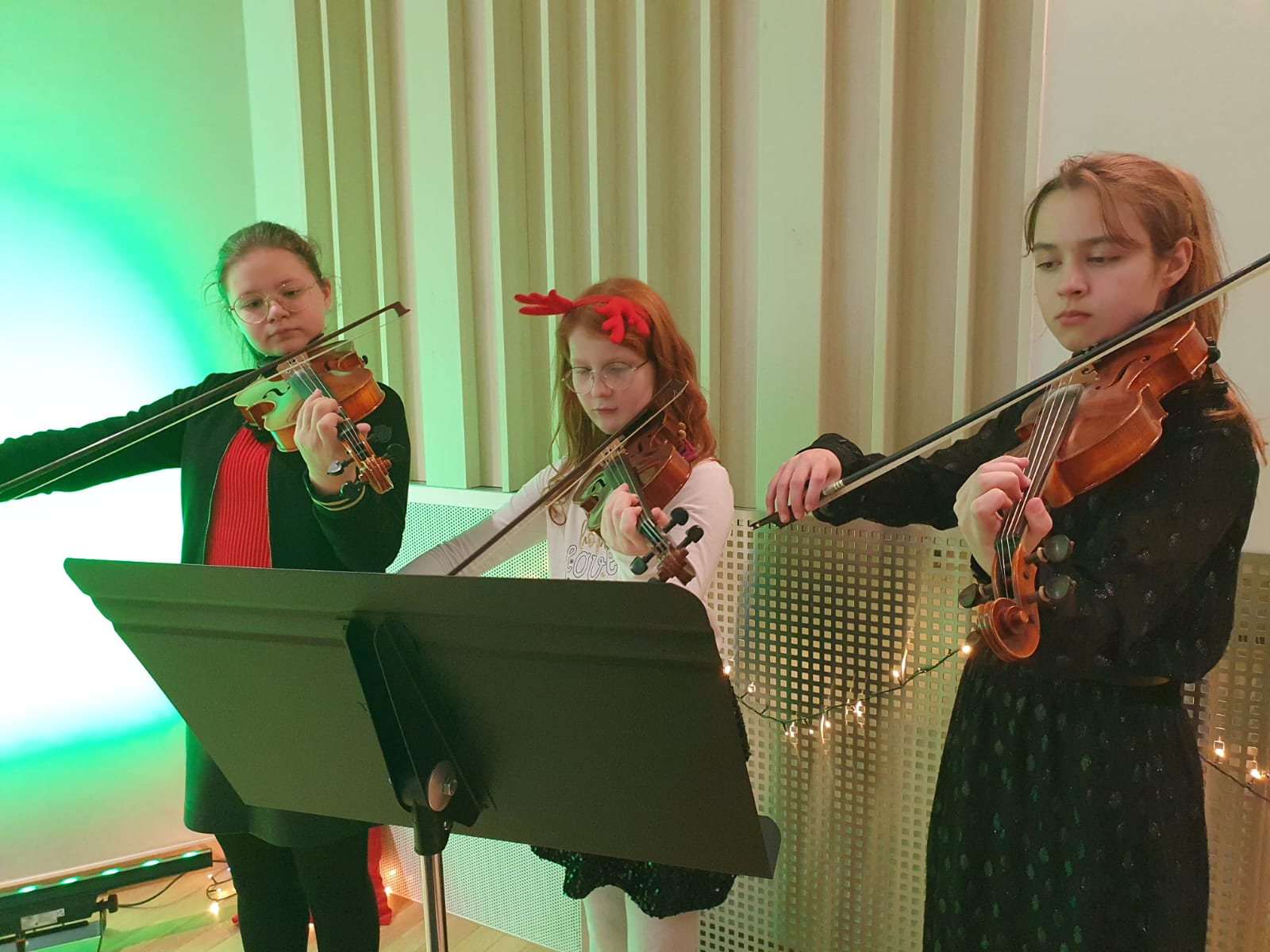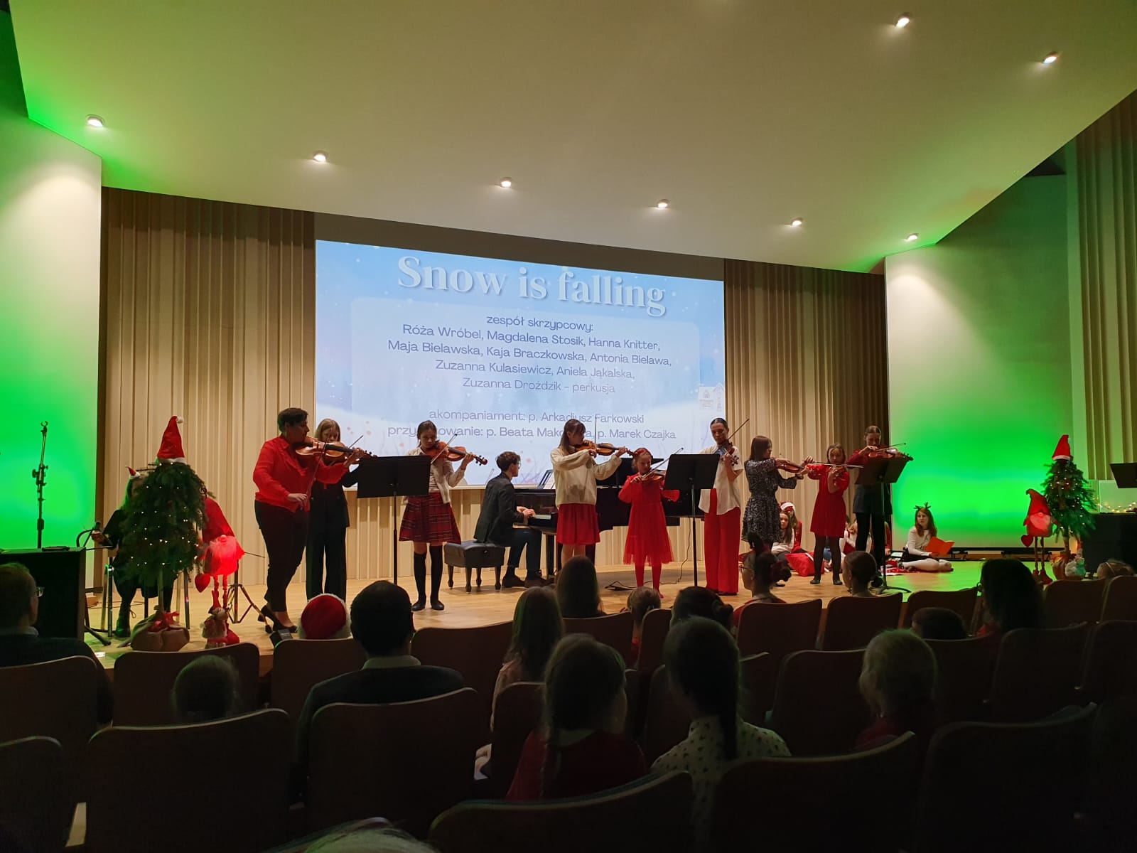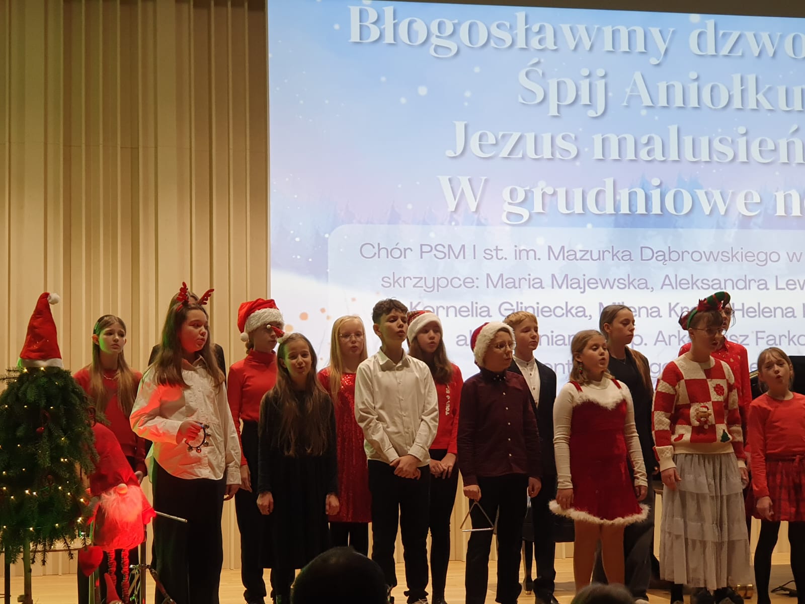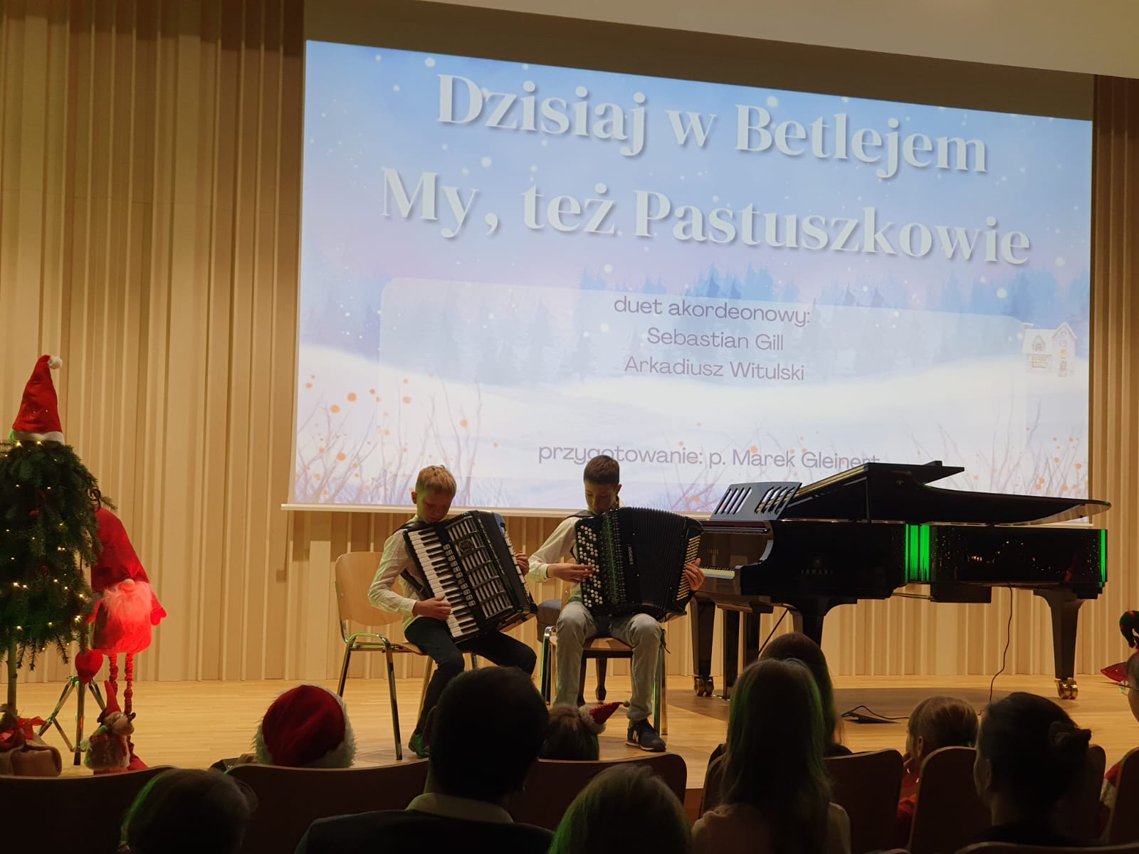 17 grudnia w naszej szkole odbył się wyjątkowy koncert kolęd w wykonaniu uczniów i nauczycieli. Wydarzenie miało miejsce w szkolnej sali koncertowej, która na tę okazję została świątecznie udekorowana. W trakcie koncertu uczniowie nie tylko grali, ale także recytowali krótkie opowiadania o tematyce bożonarodzeniowej, które wprowadziły nas w świąteczny klimat. Koncert kolęd był wspaniałą okazją, by poczuć magię nadchodzących Świąt Bożego Narodzenia. Na zakończenie wszyscy zgromadzeni w sali, uczniowie, nauczyciele i rodzice, połączyli swoje głosy, śpiewając wspólnie kolędę „Bóg się rodzi”.