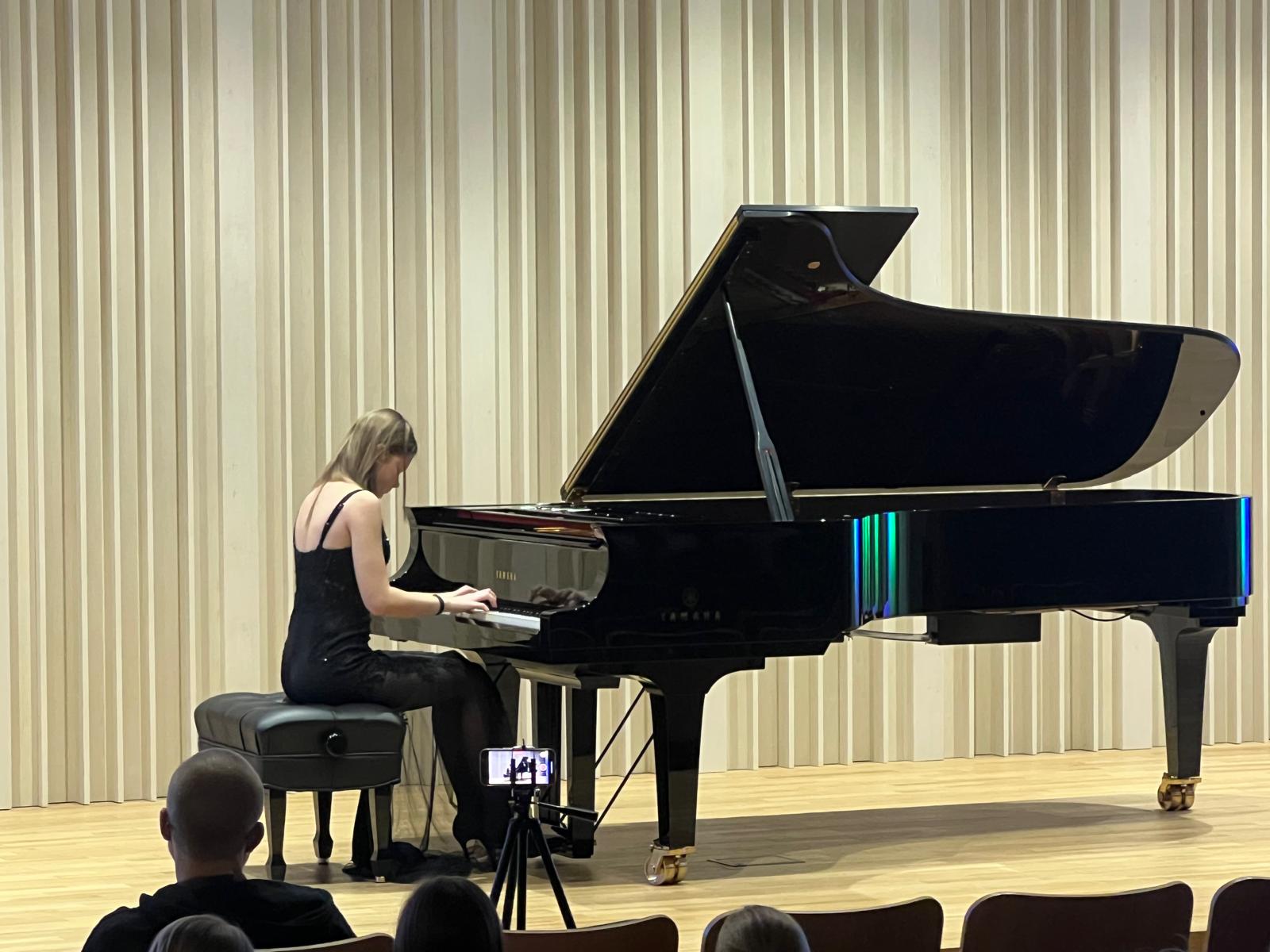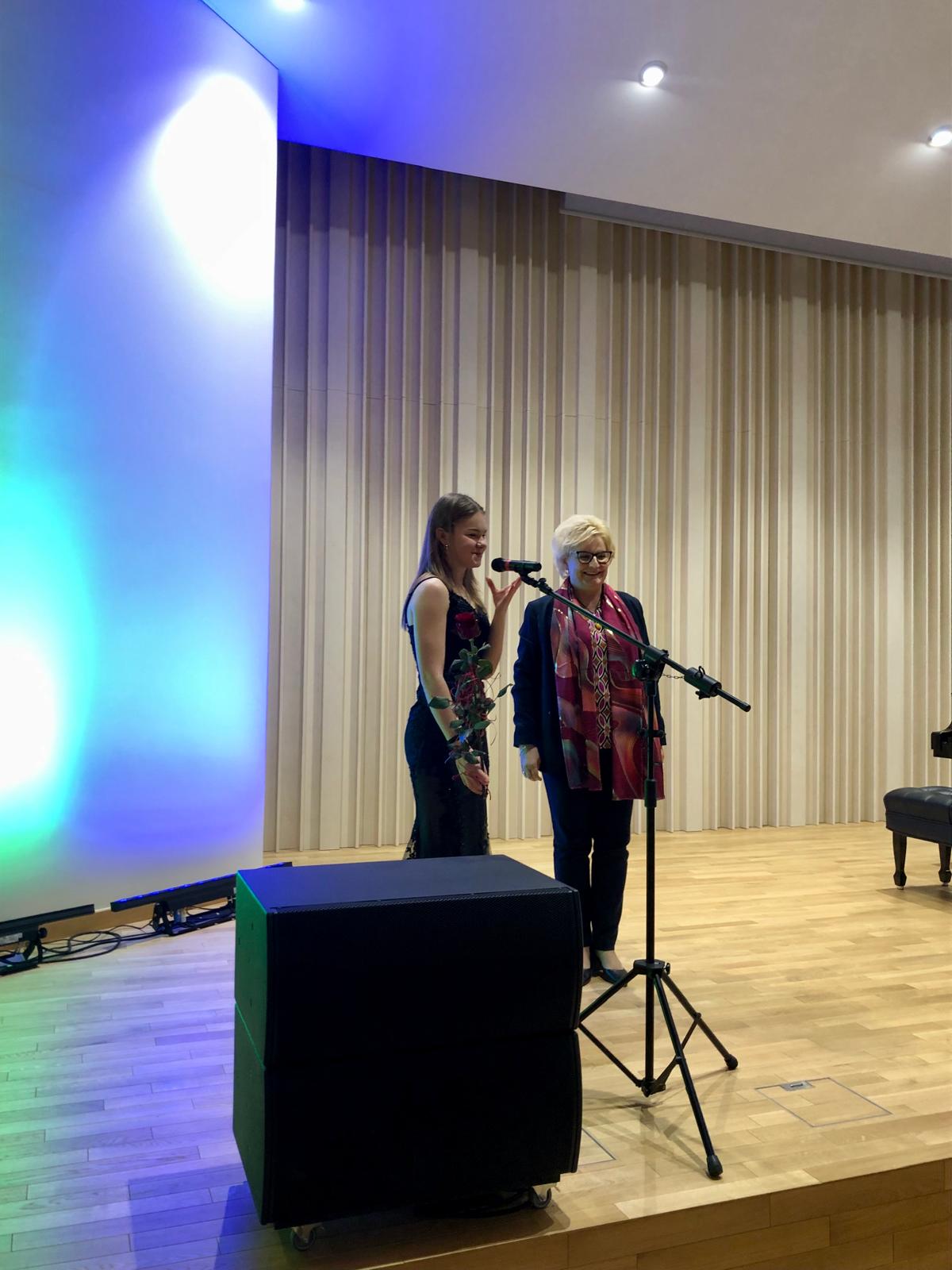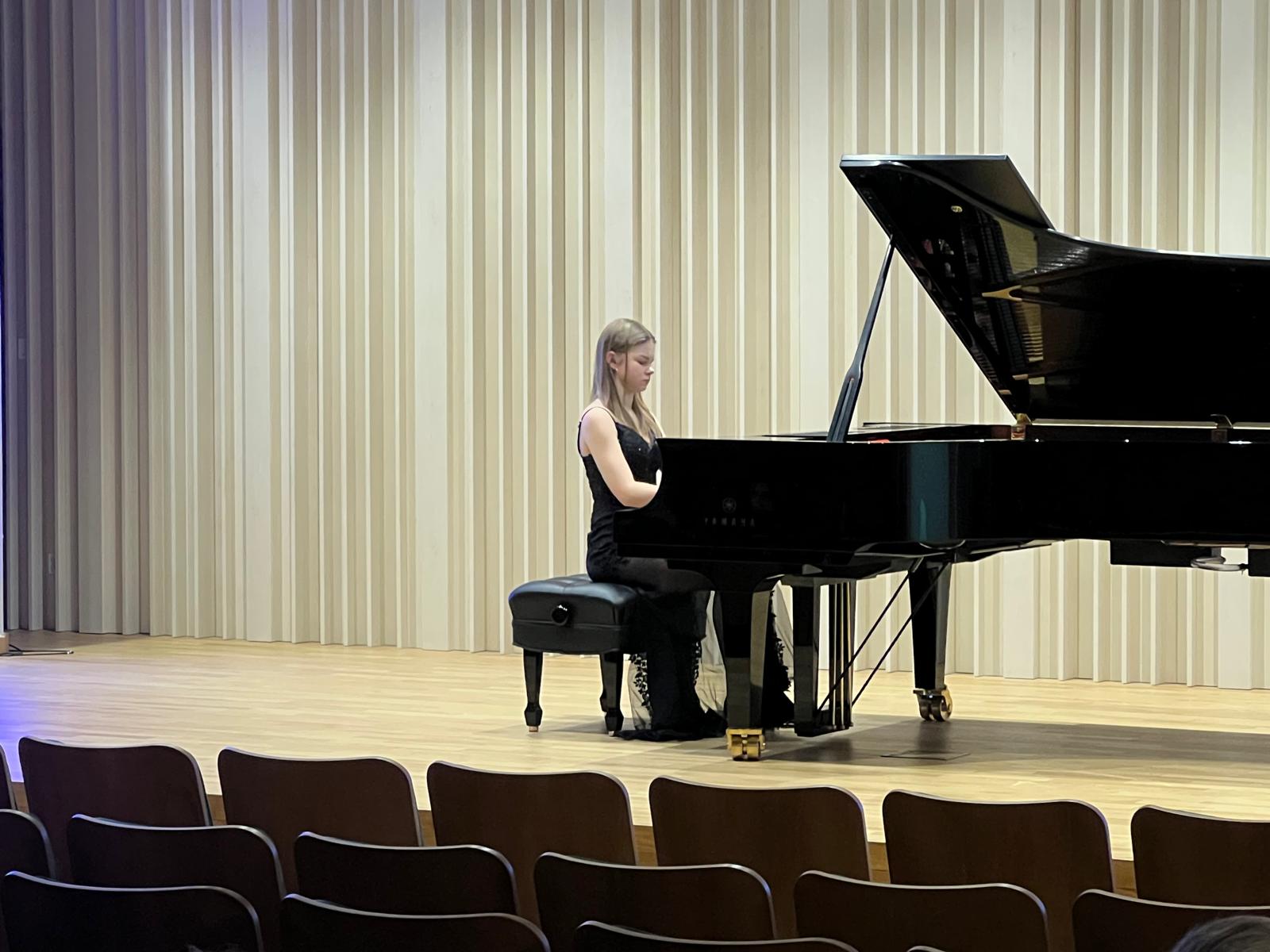 W dniu 3 lutego 2025 r. w sali koncertowej naszej szkoły zgromadzona publiczność wysłuchała koncertu fortepianowego. Gwiazdą wieczoru była Pani Maja Cierach, która jest uczennicą XI klasy Ogólnokształcącej Szkoły Muzycznej I i II stopnia im. Feliksa Nowowiejskiego w Gdańsku. Kształci się pod kierunkiem dr hab. Elżbiety Pasierowskiej. Program koncertu obejmował utwory wybitnych kompozytorów takich, jak: Domenico Scarlatti, Johann Sebastian Bach, Ferenc Liszt oraz Fryderyk Chopin. Artystka wydobyła wspaniałe dźwięki fortepianu, od delikatnych i eterycznych po potężne i pełne ekspresji. Serdecznie dziękujemy za wspaniały występ. Pasja i zaangażowanie były widoczne w każdym momencie koncertu. Zgromadzona publiczność przeżyła niezapomniane chwile, pełne emocji i artystycznej magii. Pani Mai jeszcze raz dziękujemy i życzymy wielu sukcesów w dalszej pracy artystycznej!