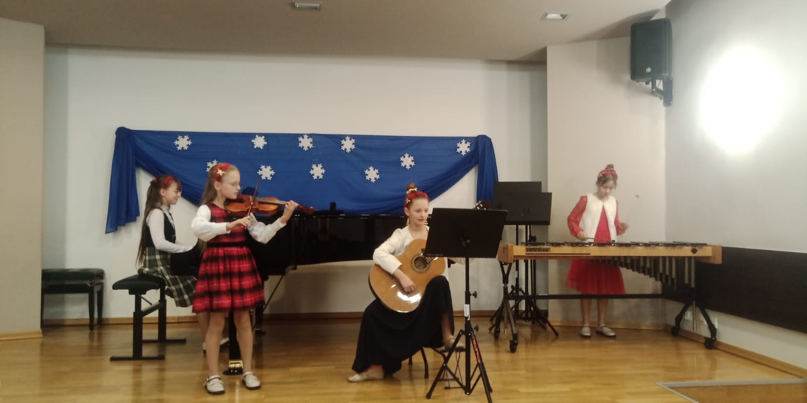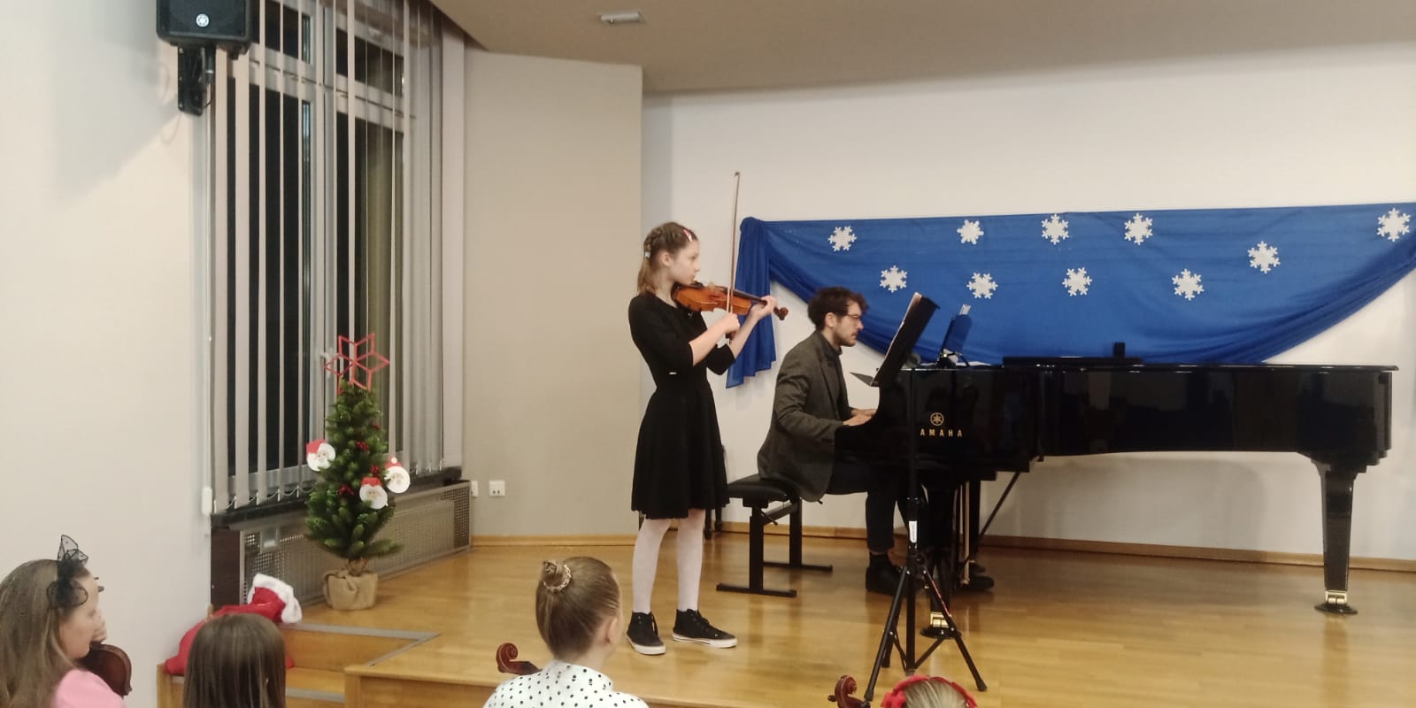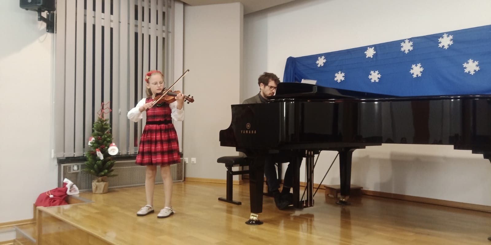 W dniu 8 grudnia 2023 r. na scenie sali kameralnej naszej szkoły zaprezentowali swoje umiejętności uczniowie klasy skrzypiec Pani Beaty Makowskiej. Przy fortepianie młodym artystom towarzyszył Pan Arkadiusz Farkowski. Uczniowie swoim talentem oczarowali zgromadzoną publiczność, a dekoracja wprowadziła wszystkich w świąteczny nastrój. Po występie na wszystkich czekały drobne słodkie upominki.
