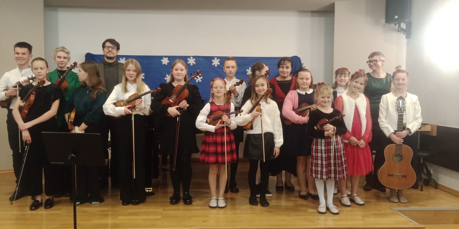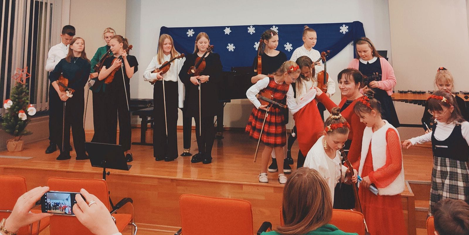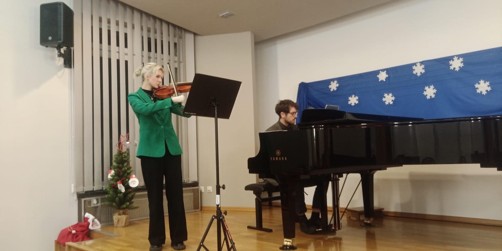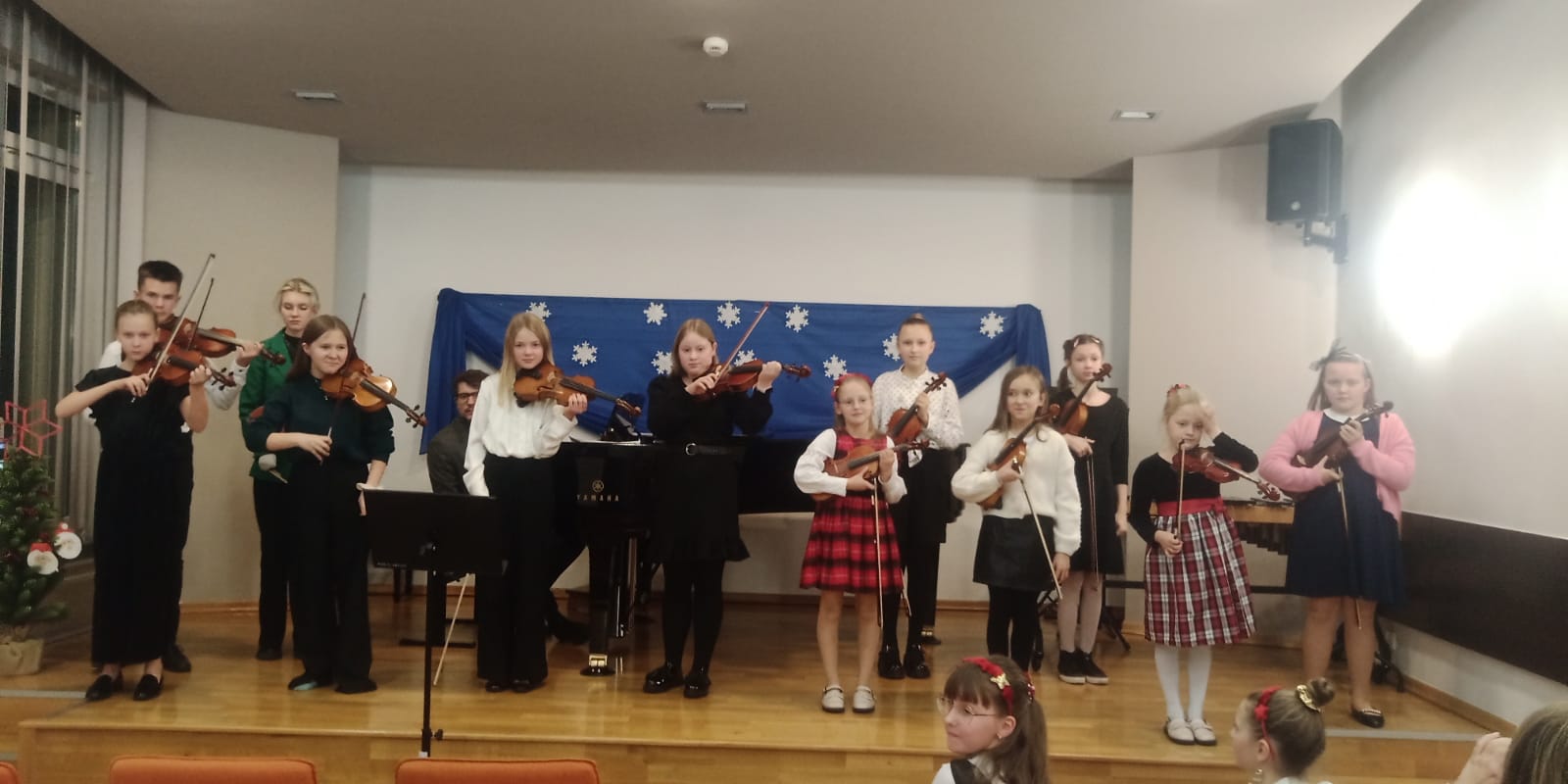 W dniu 8 grudnia 2023 r. na scenie sali kameralnej naszej szkoły zaprezentowali swoje umiejętności uczniowie klasy skrzypiec Pani Beaty Makowskiej. Przy fortepianie młodym artystom towarzyszył Pan Arkadiusz Farkowski. Uczniowie swoim talentem oczarowali zgromadzoną publiczność, a dekoracja wprowadziła wszystkich w świąteczny nastrój. Po występie na wszystkich czekały drobne słodkie upominki.