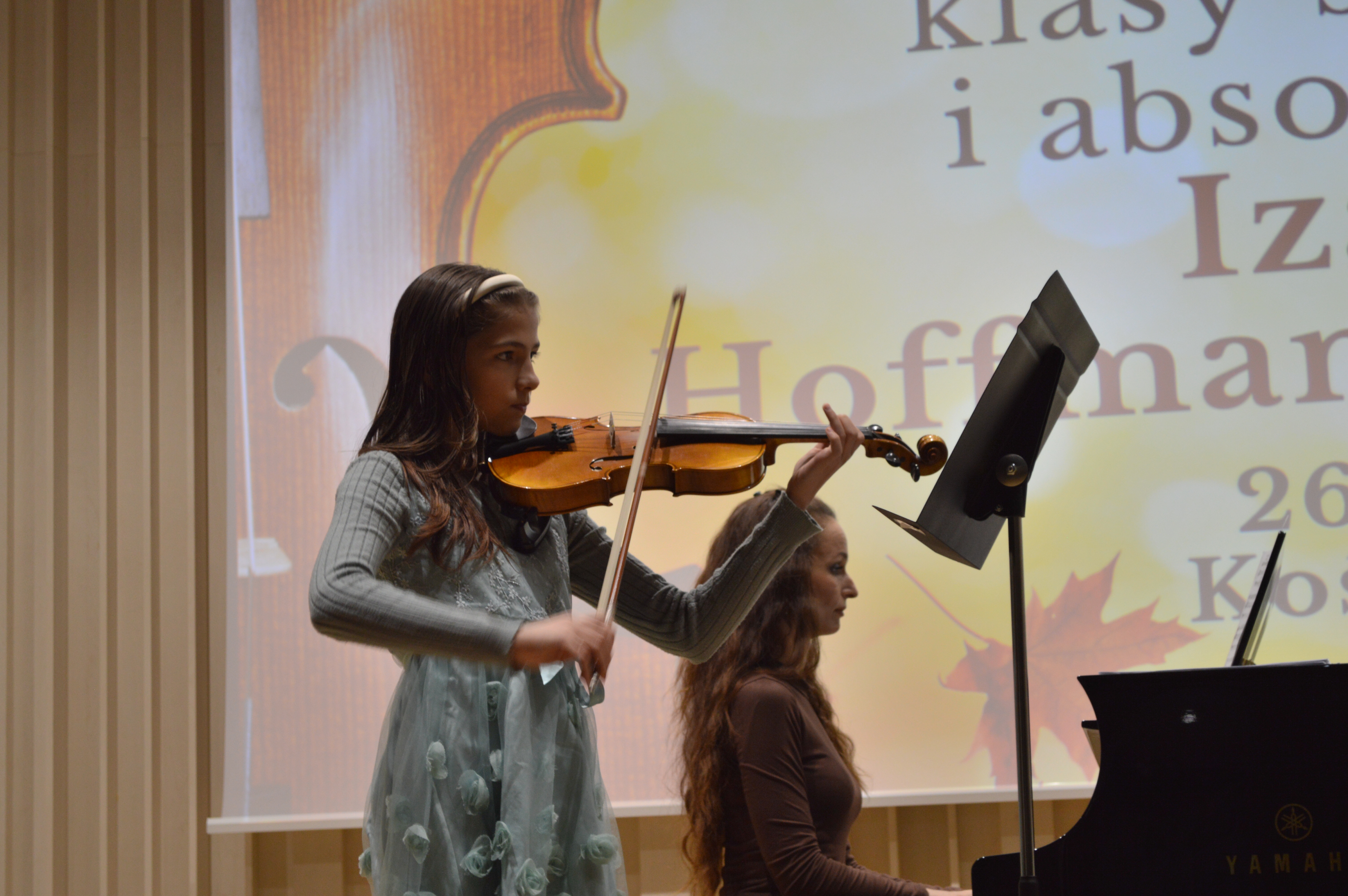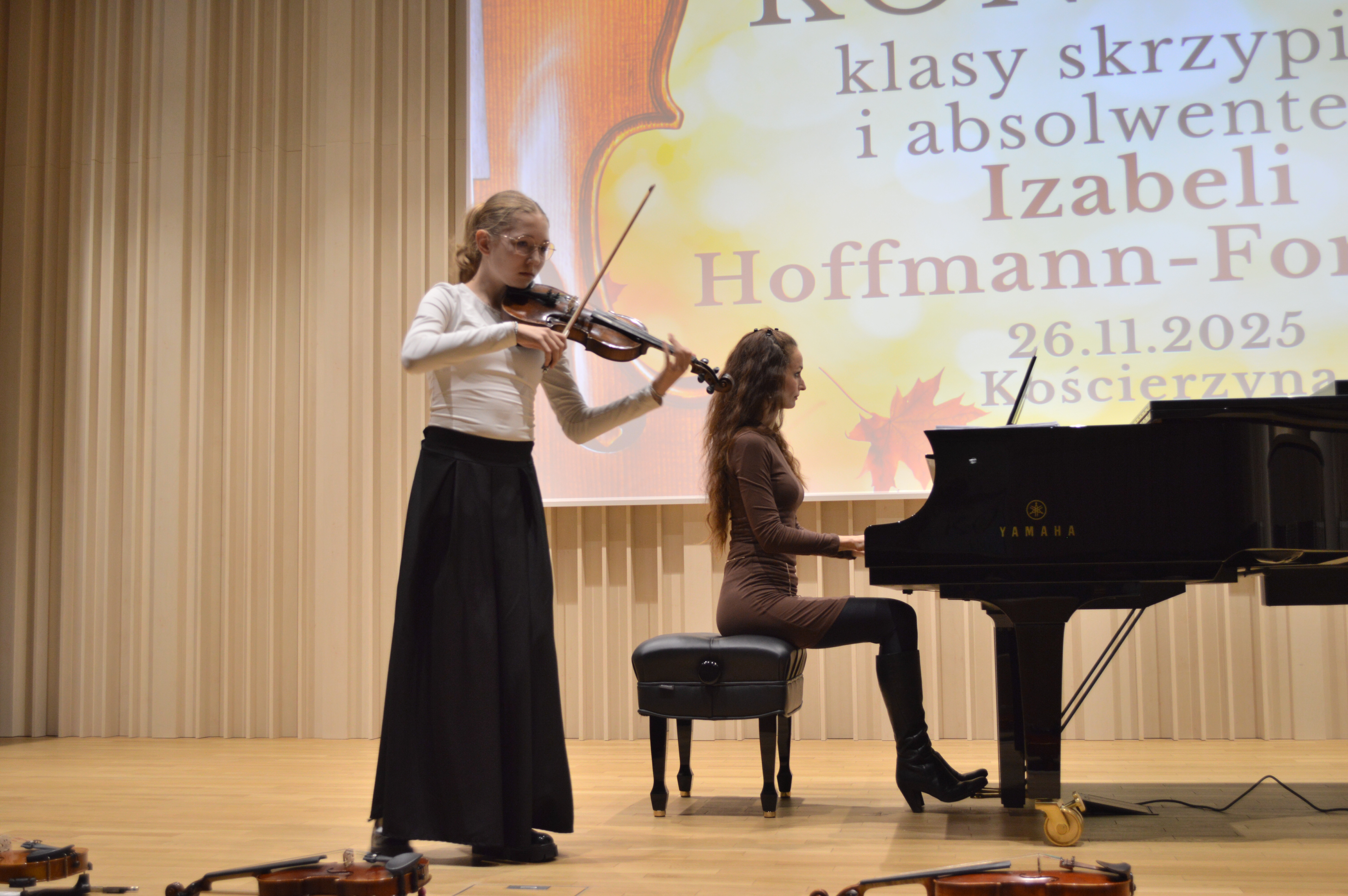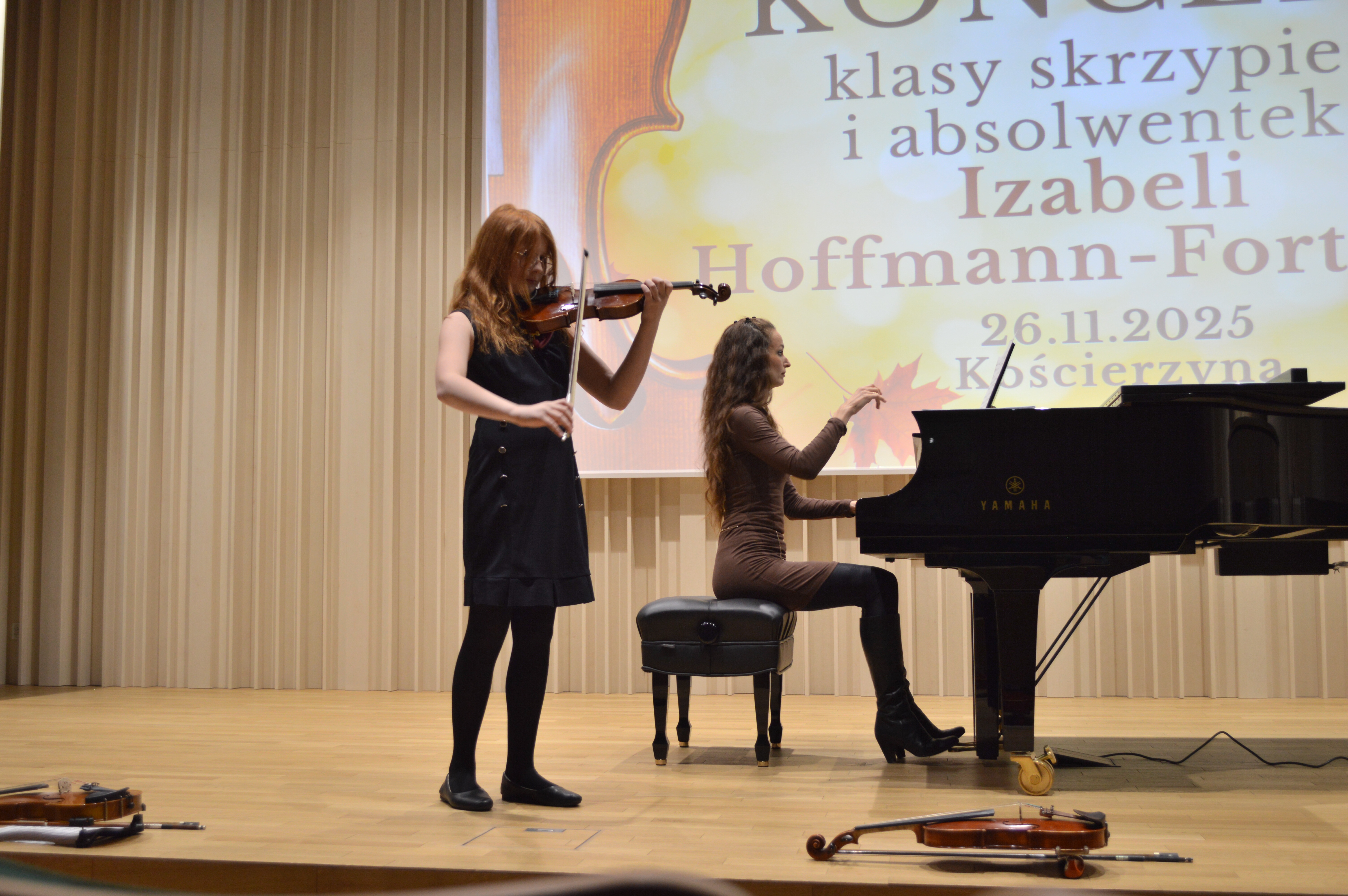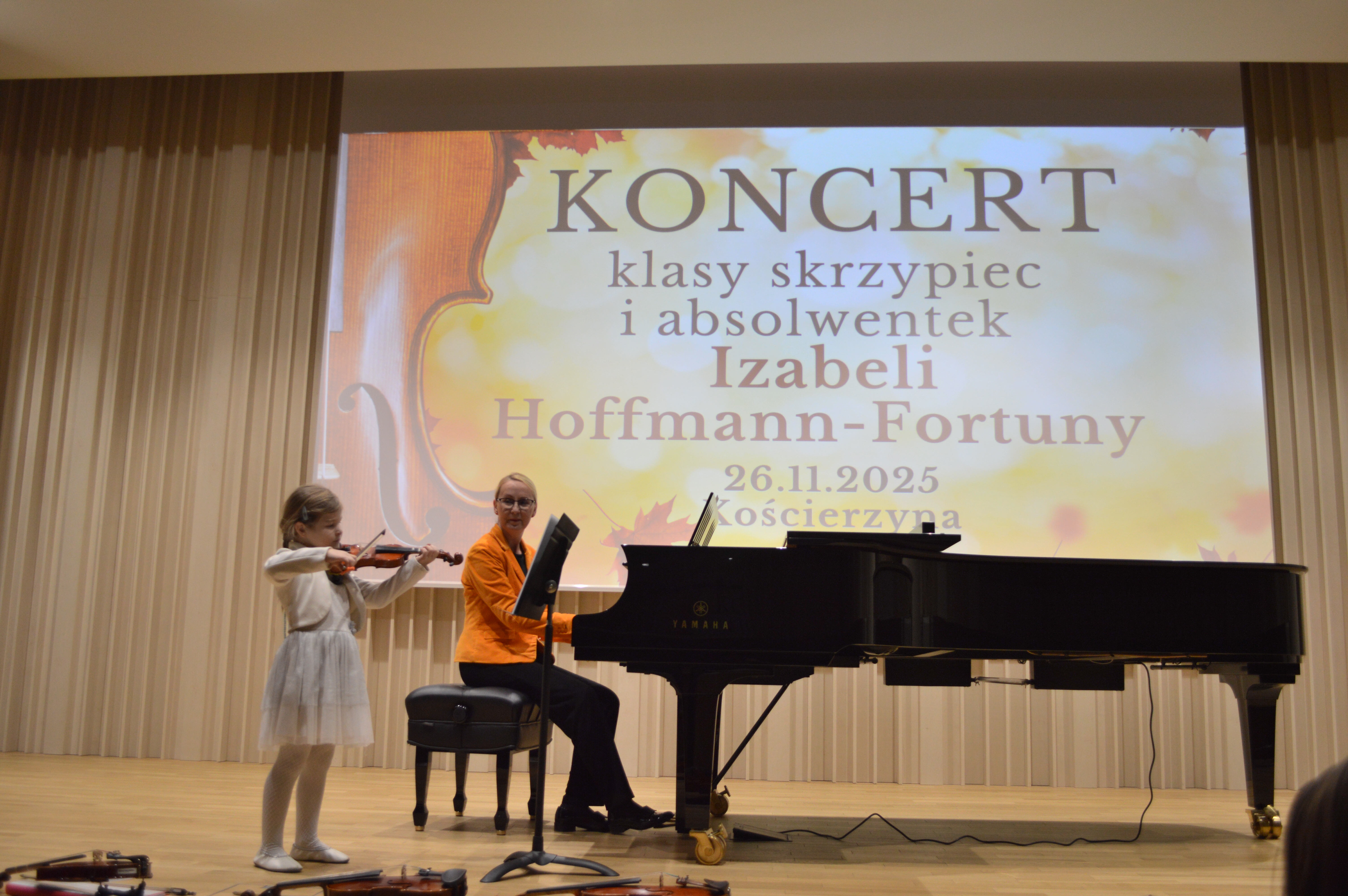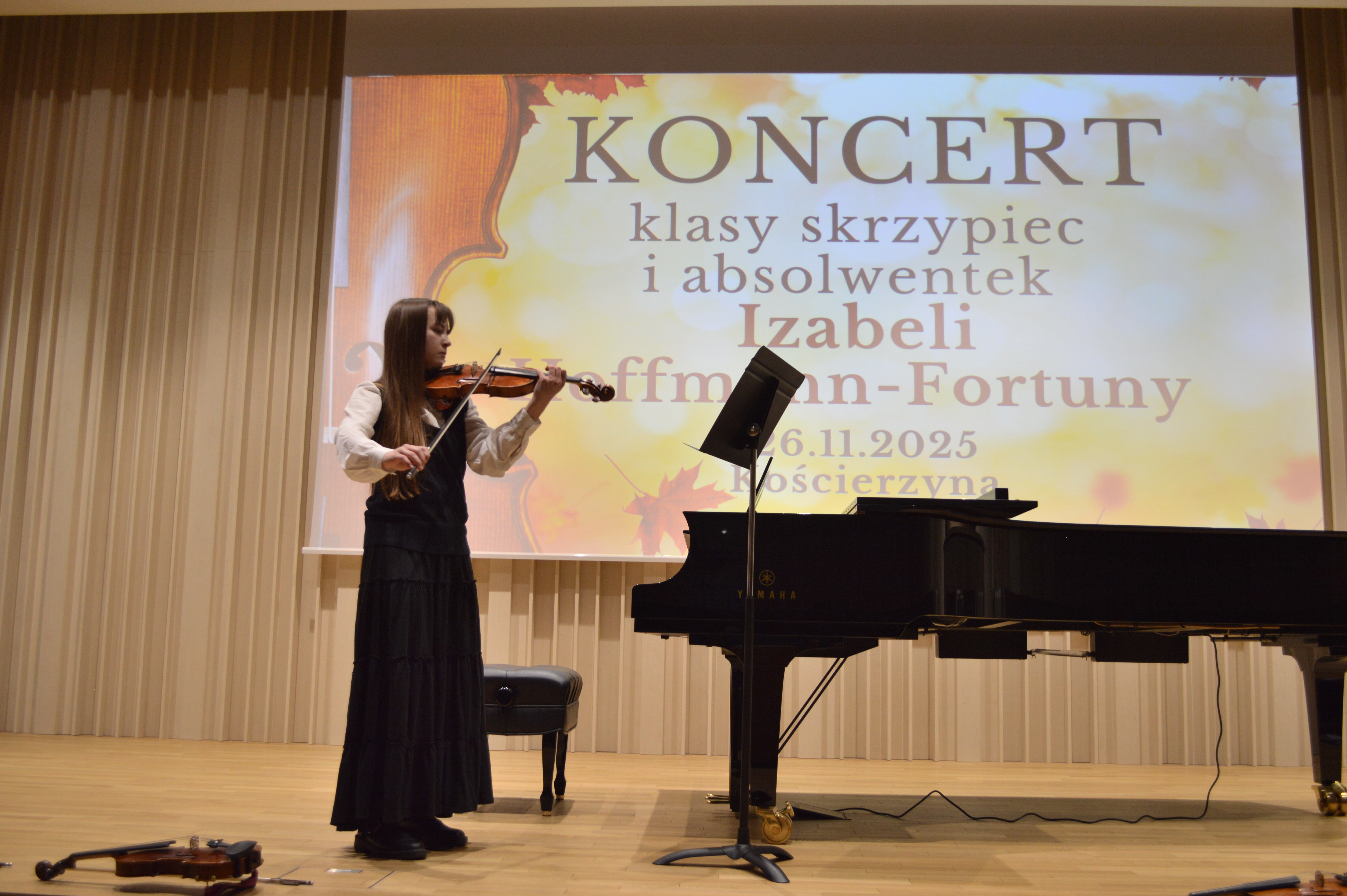 26 listopada 2025 r. odbył się koncert uczniów klasy skrzypiec prowadzonej przez Panią Izabelę Hoffmann- Fortunę. Wydarzenie miało miejsce w ciepłej, jesiennej atmosferze, która doskonale współgrała z nastrojem prezentowanych utworów i wyjątkową oprawą artystyczną.