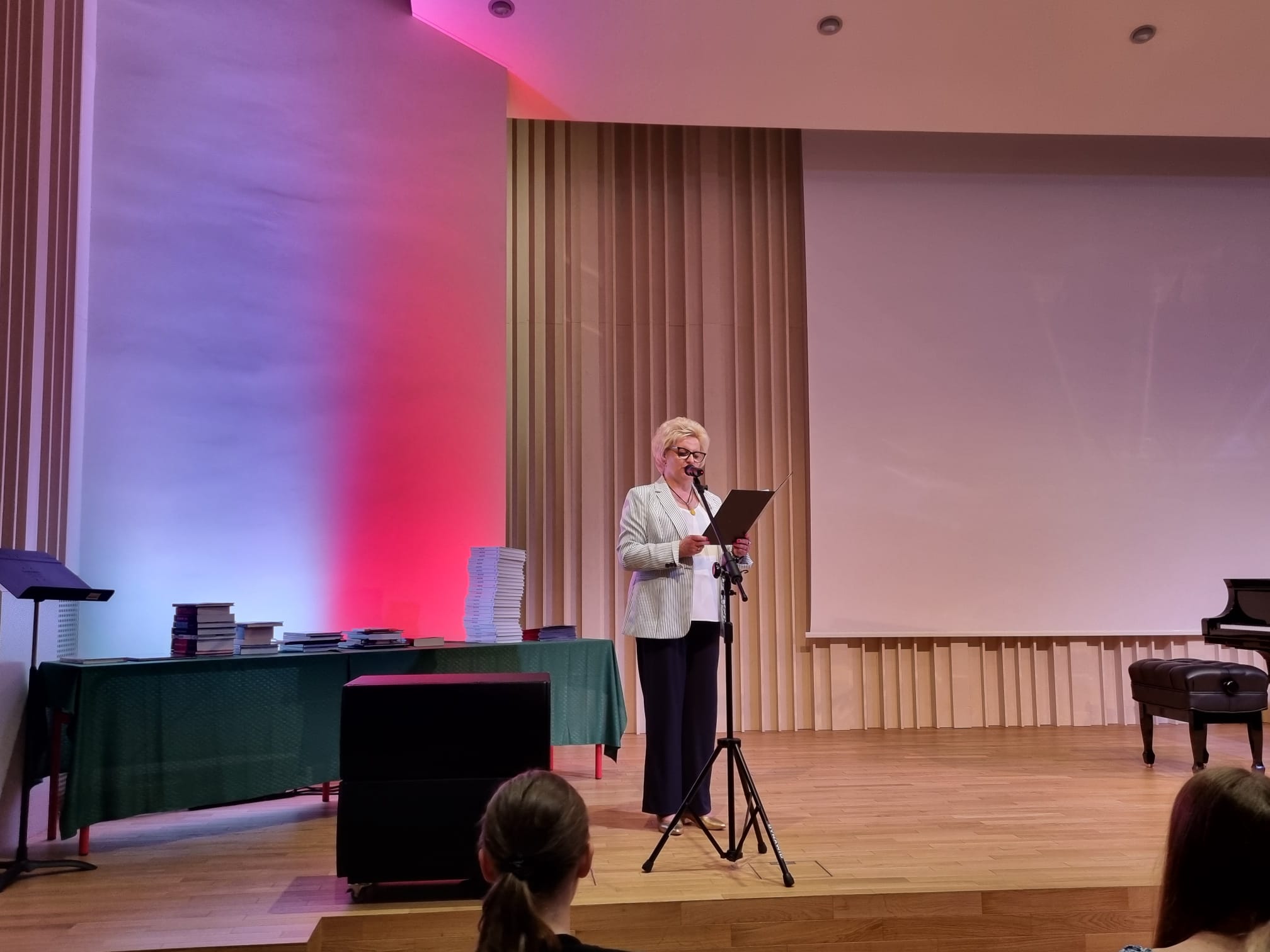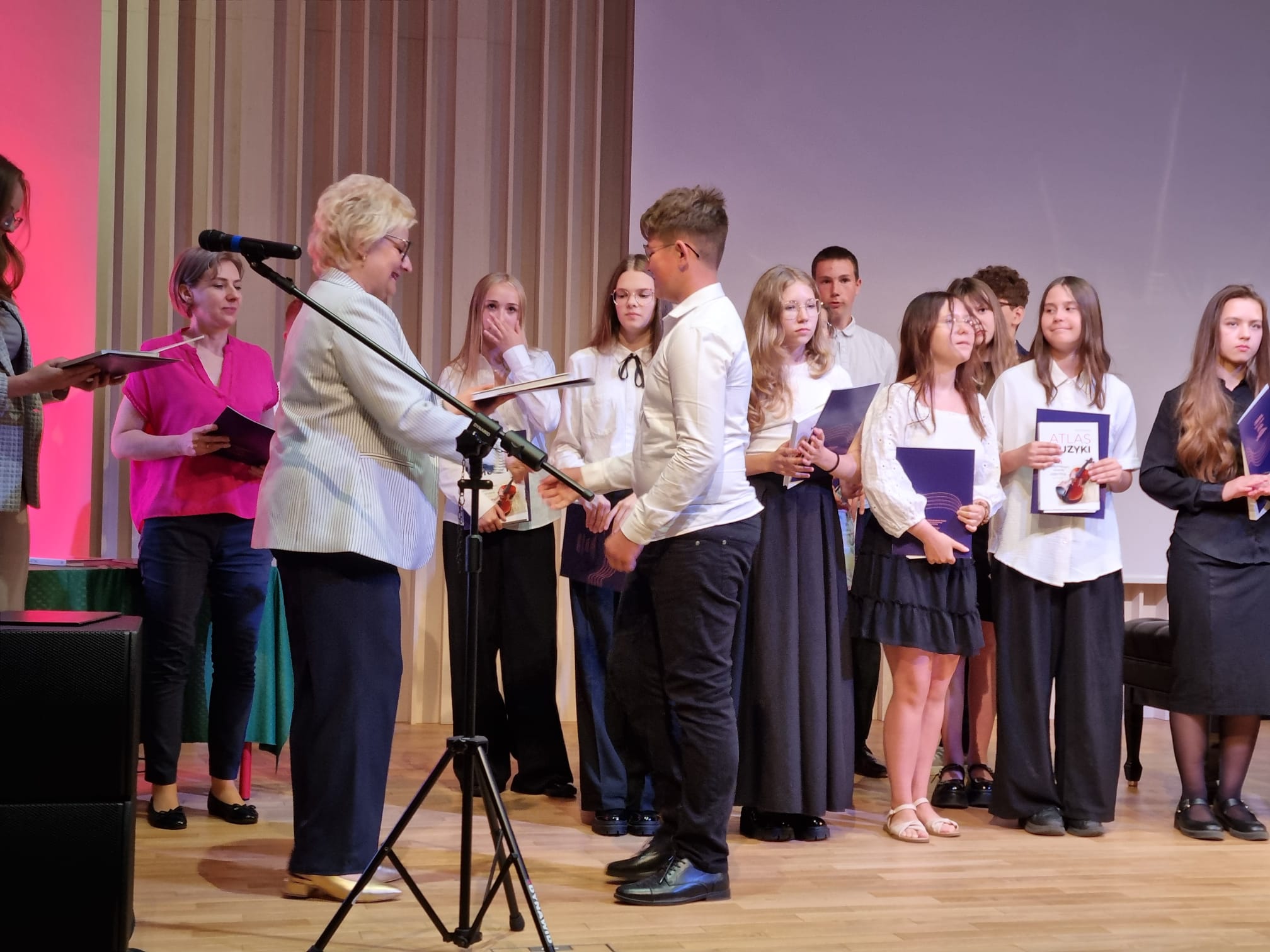 Słowa wdzięczności popłynęły także ze strony rodziców, którzy dziękowali Dyrekcji, nauczycielom i pracownikom szkoły za opiekę, wsparcie i rozwijanie pasji muzycznych ich dzieci. Podkreślili znaczenie wspólnej drogi, jaką przeszli razem z dziećmi i kadrą pedagogiczną. Głos w imieniu rodziców zabrała Pani Monika Pastwa, wyrażając wdzięczność za wszystkie lata wspólnej pracy i troski o rozwój młodych artystów.