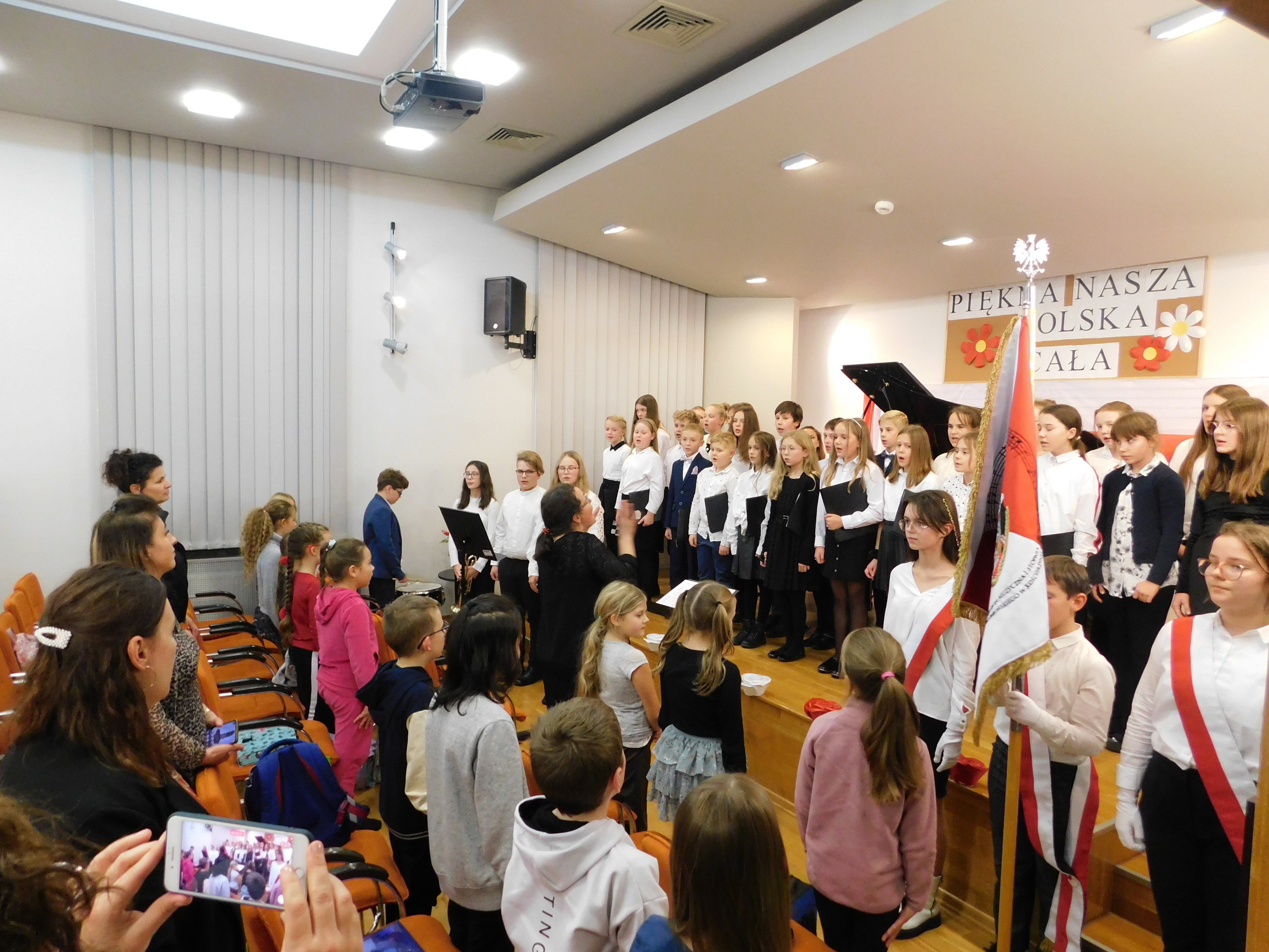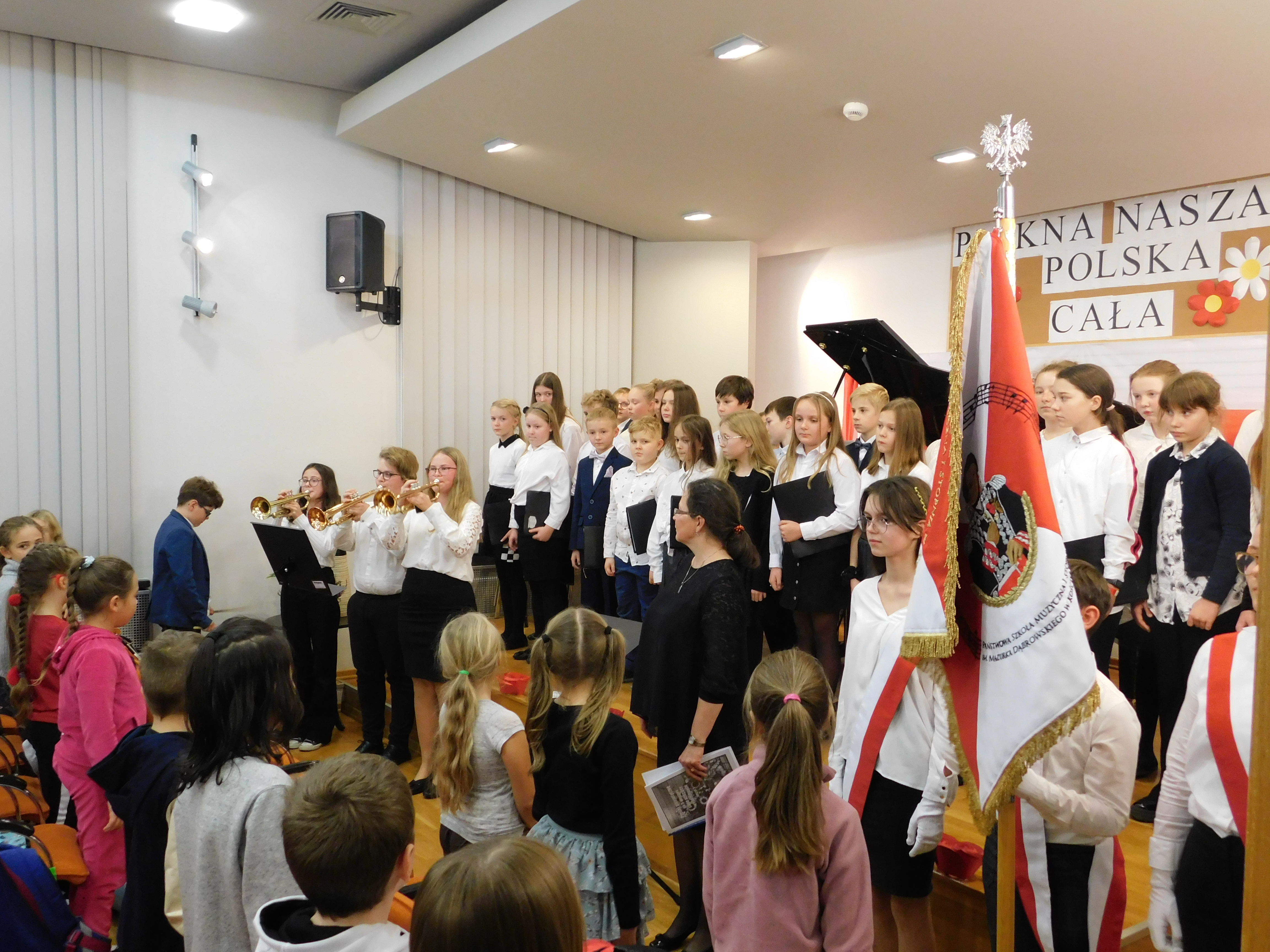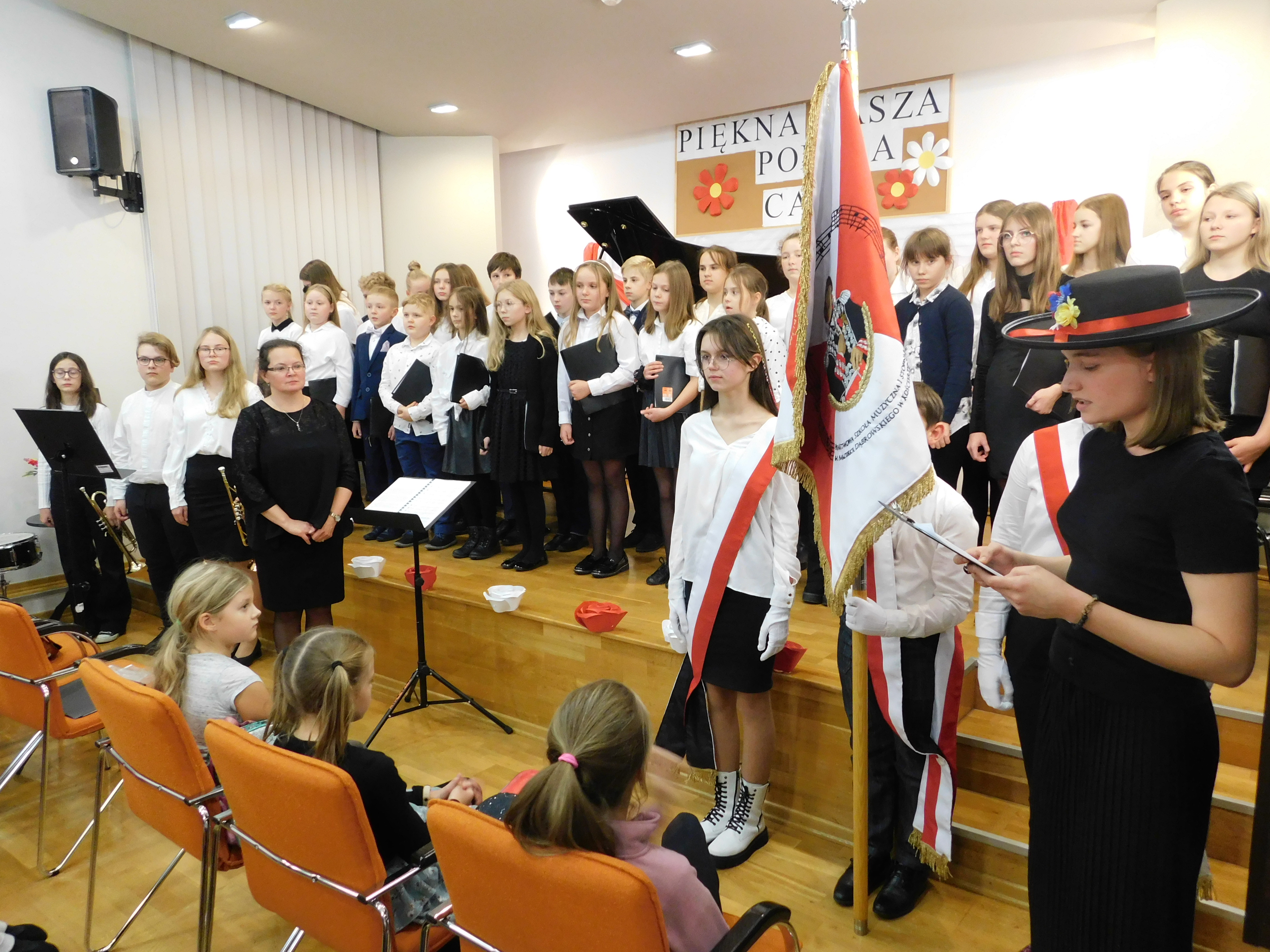 Całą uroczystość uświetnił swoim występem szkolny chór przygotowany przez Panią Małgorzatę Bednarek. Nie zabrakło pocztu sztandarowego, którego opiekunem jest Pani Marzena Wirzba.