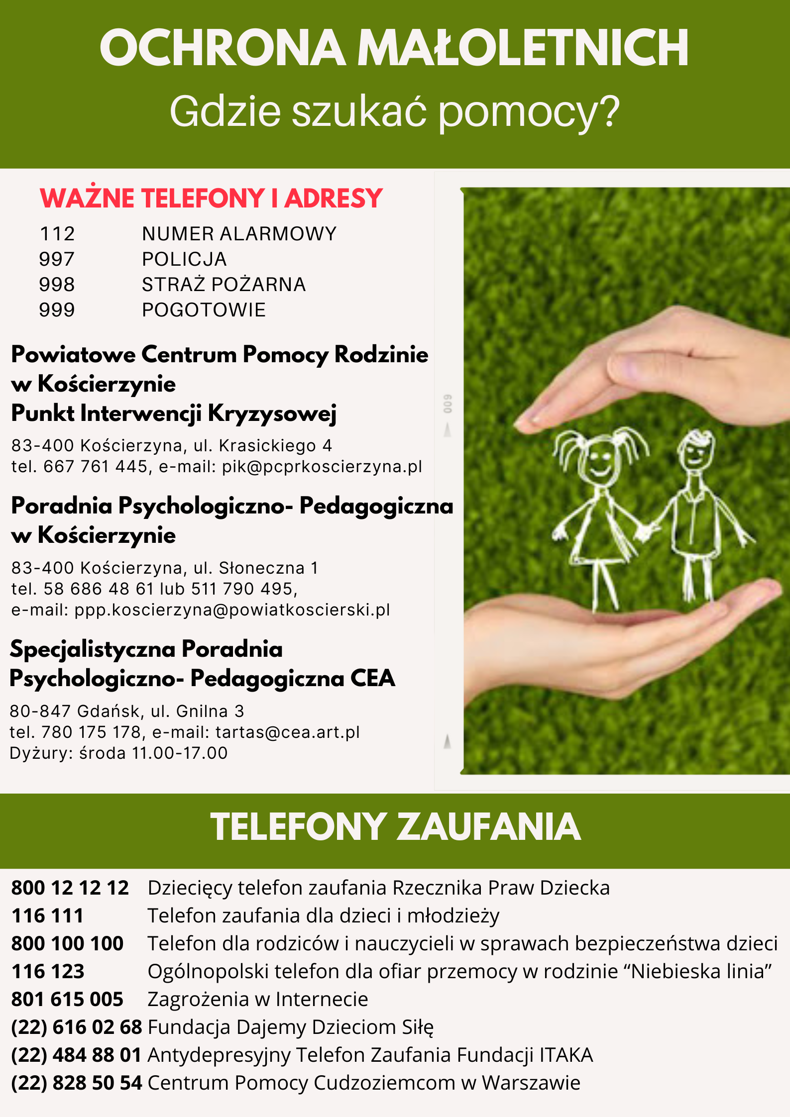 „Standardy ochrony małoletnich” to dokument skonstruowany jako zbiór zasad i procedur postępowania w Państwowej Szkole Muzycznej I stopnia im. Mazurka Dąbrowskiego w Kościerzynie, które mają być przestrzegane i stosowane w sytuacji podejrzenia krzywdzenia lub krzywdzenia małoletniego (dziecka, ucznia). Dokument określa organizację ochrony małoletnich przed krzywdzeniem, sposób dokumentowania, zasady opracowywania planu wspierania osoby doznającej przemocy i wiele innych.