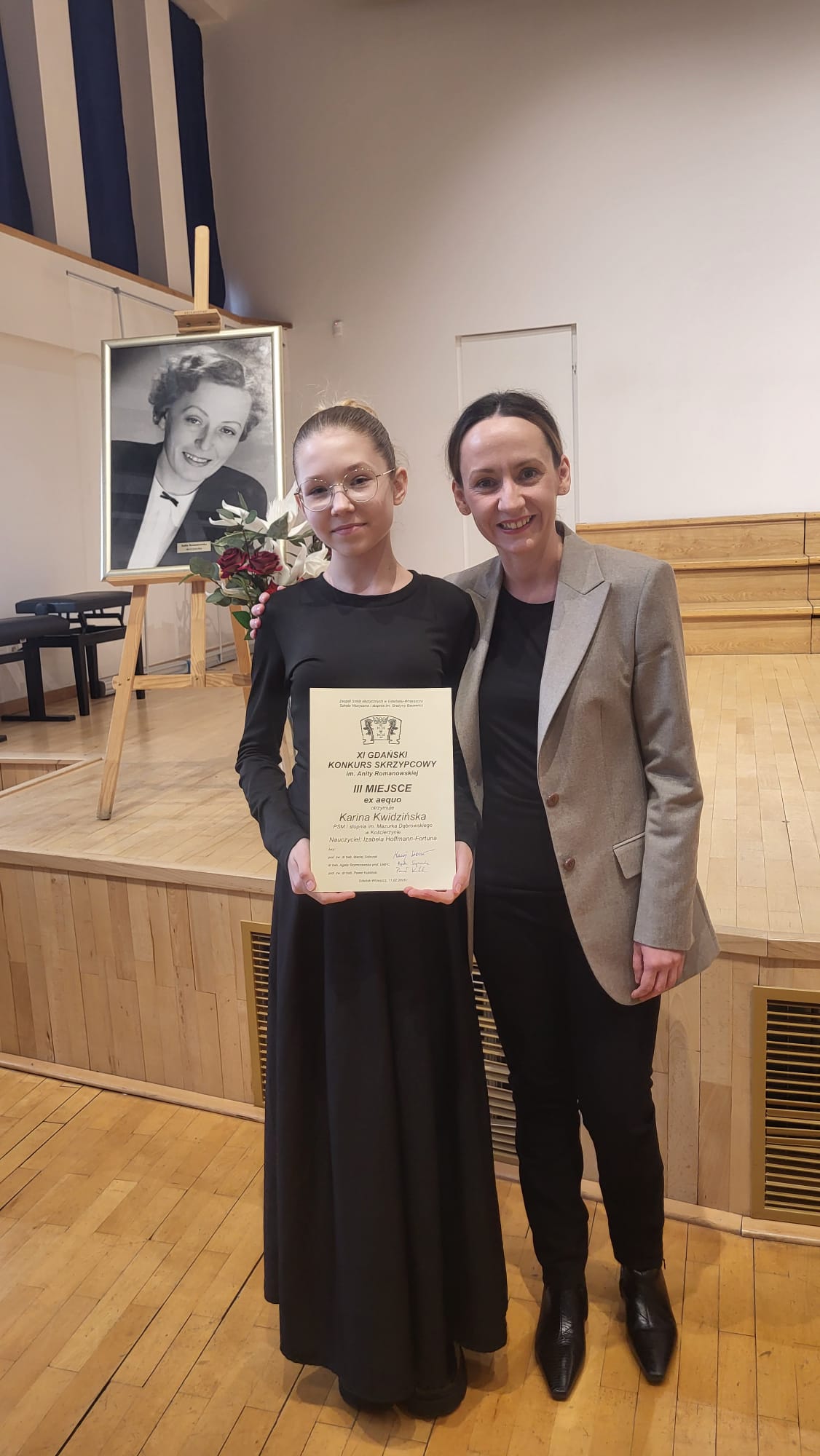 Z ogromną radością i dumą pragniemy przekazać informację o sukcesie Kariny Kwidzińskiej. Jury w składzie: prof. Maciej Sobczak, prof. Paweł Kukliński i dr hab. Agata Szymczewska doceniło zaangażowanie, ciężką pracę oraz talent Kariny przyznając jej III nagrodę w kategorii klas VI w XI Gdańskim Konkursie Skrzypcowym im. Anity Romanowskiej. Uczennicę do konkursu przygotowała mgr Izabela Hoffmann- Fortuna. O akompaniament zadbała mgr Eugenia Mazur.