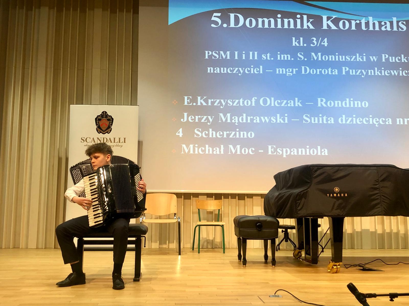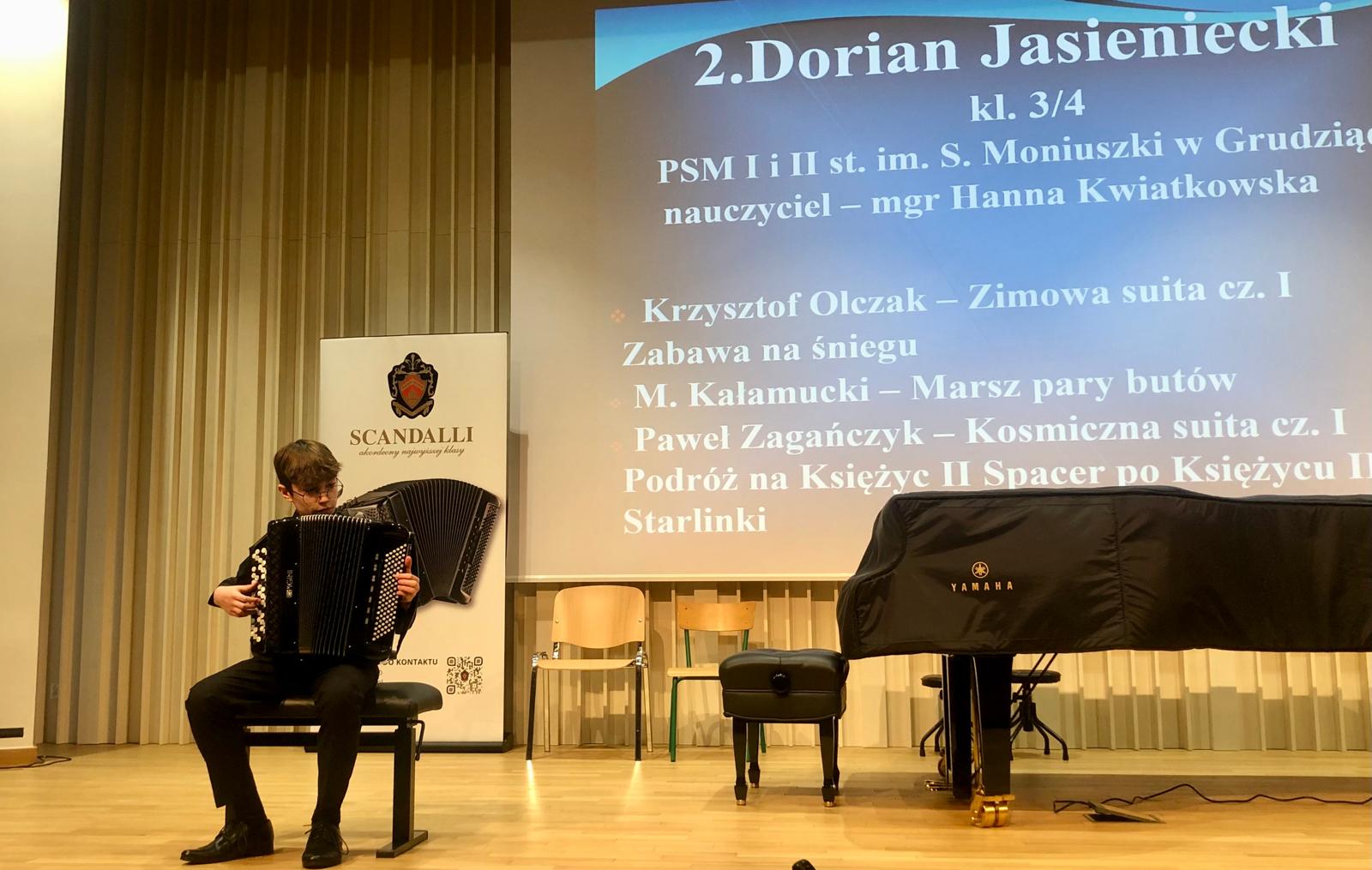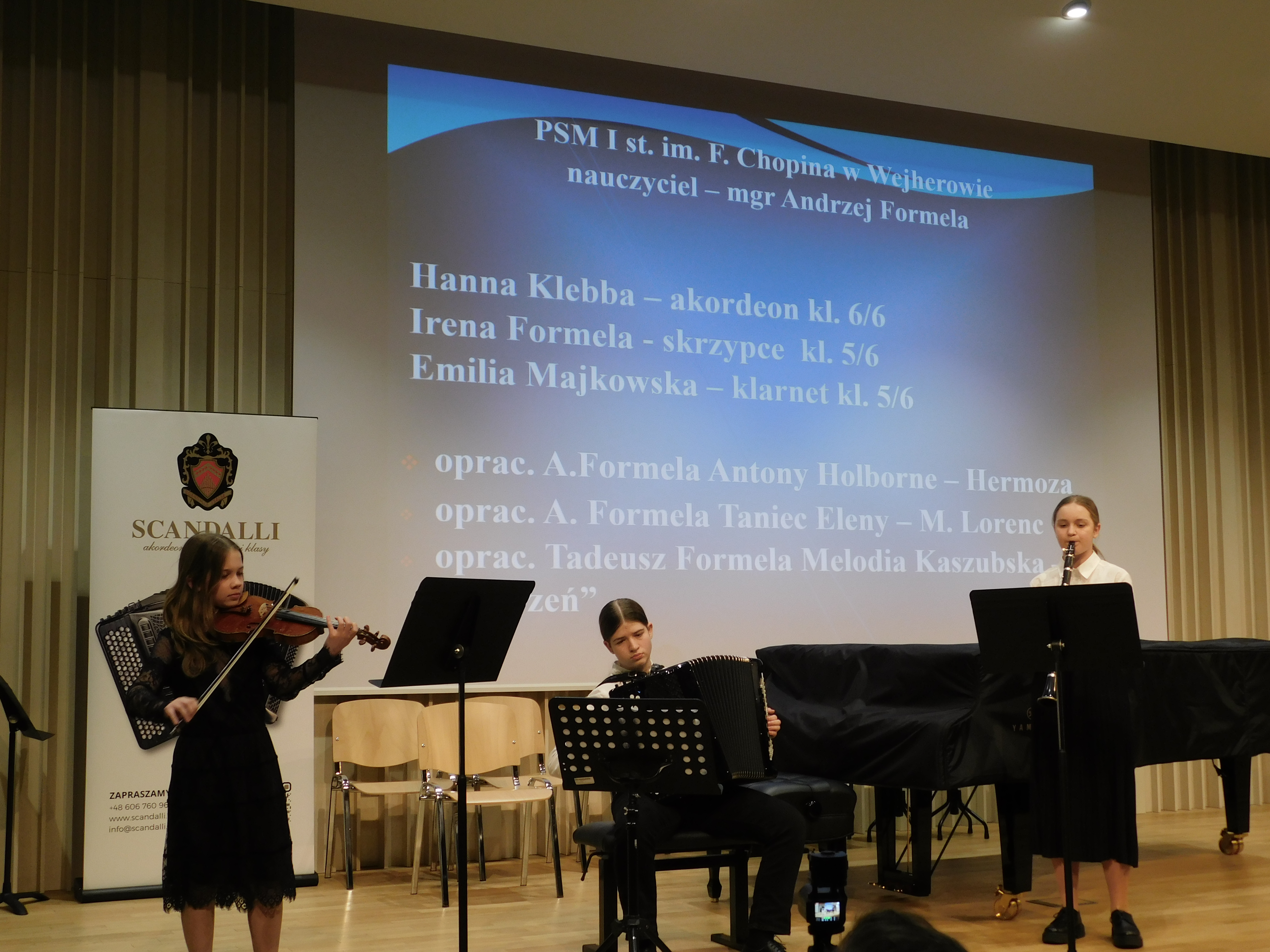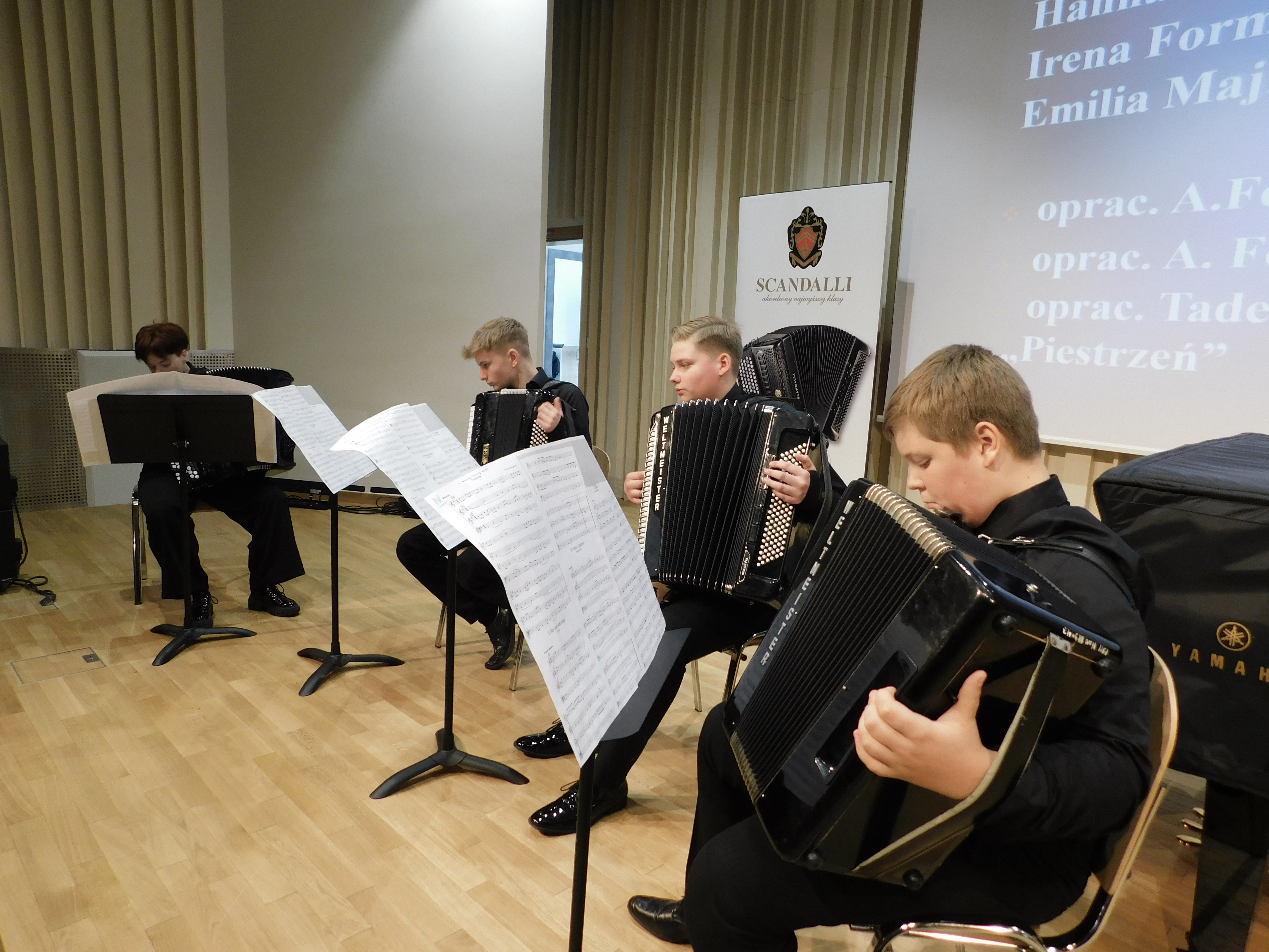 W dniu 19 marca (środa) 2025 r. w naszej szkole odbyły się XXX Jubileuszowe Kaszubskie Spotkania Akordeonowe. Jury w składzie: prof. dr hab. Krzysztof Olczak, prof. dr hab. Elżbieta Rosińska i mgr Marcin Warduliński przesłuchało 36 uczniów oraz 3 zespoły z 17 szkół muzycznych województw: pomorskiego, kujawsko- pomorskiego, zachodniopomorskiego i warmińsko- mazurskiego. Uczniów przygotowało 21 nauczycieli. W ramach XXX Kaszubskich Spotkań Akordeonowych odbył się wykład seminaryjny dla nauczycieli szkół muzycznych I stopnia na temat: „Jak motywować uczniów do ćwiczenia”. Na wszystkich uczestników i nauczycieli, jak co roku, czekały pamiątkowe kubeczki. W wolnym czasie można było podziwiać wystawę akordeonów, którą przygotował Pan Zygmunt Czupryn- przedstawiciel akordeonów Scandalli w Polsce. Zwieńczeniem uroczystości był koncert w wykonaniu gdańskiej orkiestry akordeonowej Pulsanti, którego sponsorem było Starostwo Powiatowe w Kościerzynie.