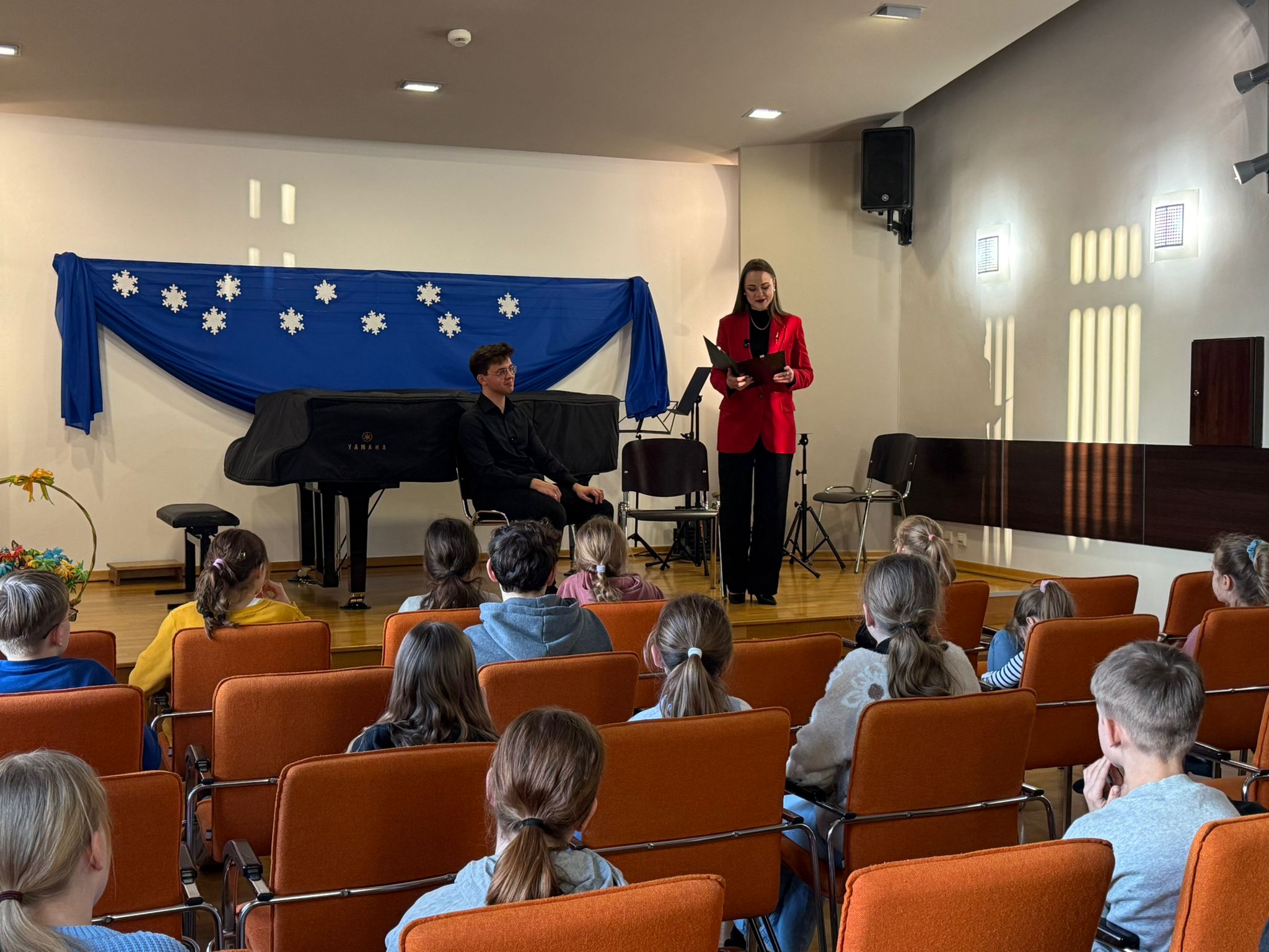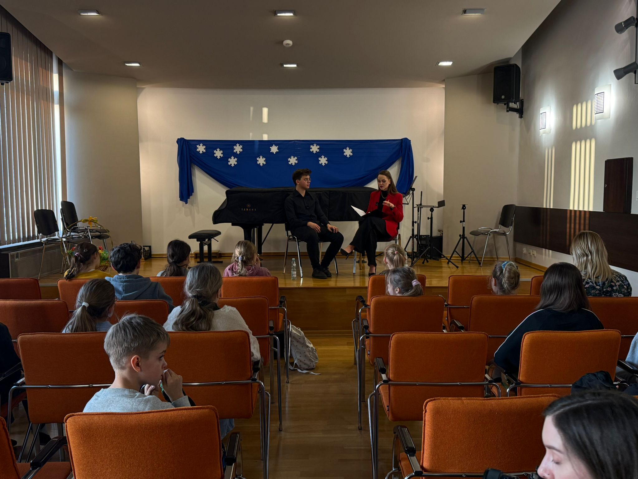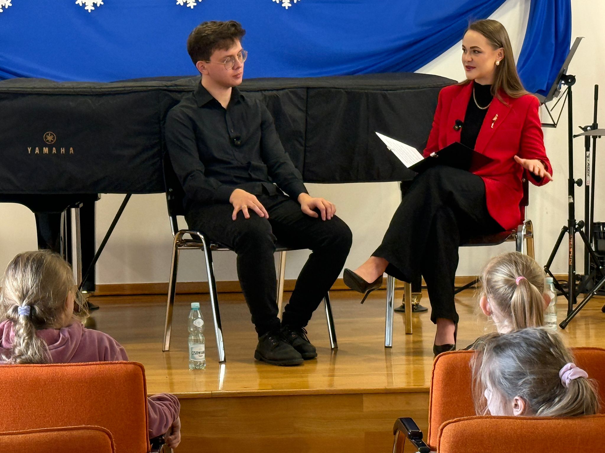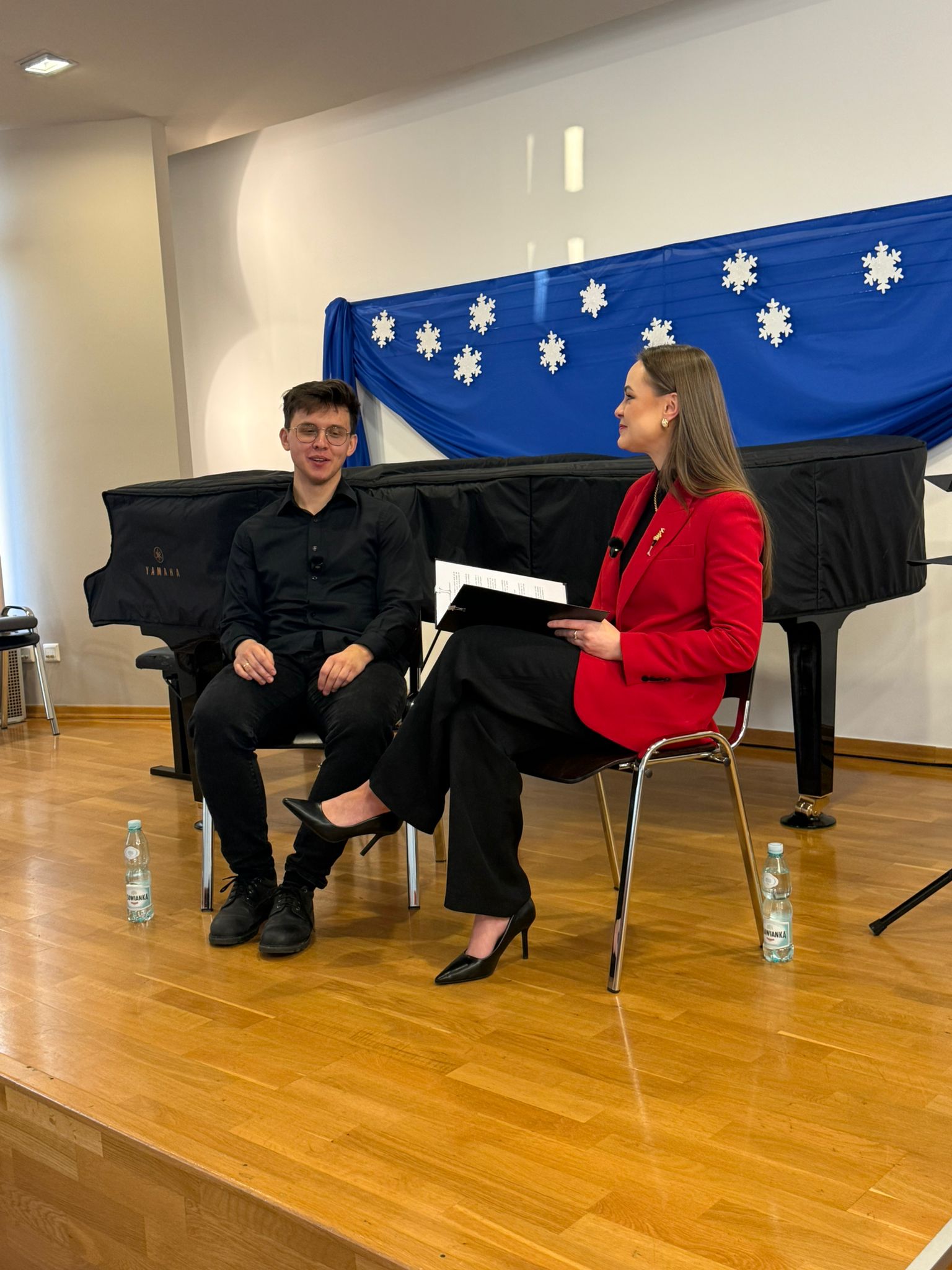 Podczas spotkania Pan Andrzej Mandryka opowiedział o swojej drodze artystycznej oraz specyfice pracy dyrygenta. W przystępny i inspirujący sposób przybliżył uczniom, na czym polega komunikacja między dyrygentem a muzykami oraz jak ogromne znaczenie w interpretacji utworu mają gest, mimika i emocje. Uczestnicy dowiedzieli się, że dyrygent nie tylko wyznacza tempo, ale przede wszystkim nadaje muzyce charakter i spaja brzmienie całego zespołu. Nie zabrakło również ciekawostek z życia artystycznego oraz przykładów pokazujących, jak różnorodna i wymagająca jest praca z orkiestrą. Spotkanie było nie tylko cenną lekcją muzyki, lecz także inspiracją do rozwijania własnych pasji i talentów.