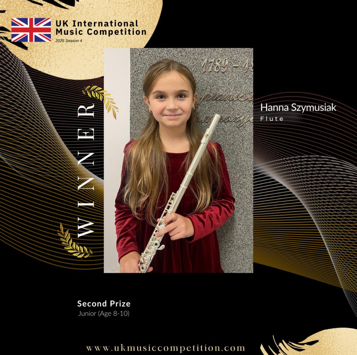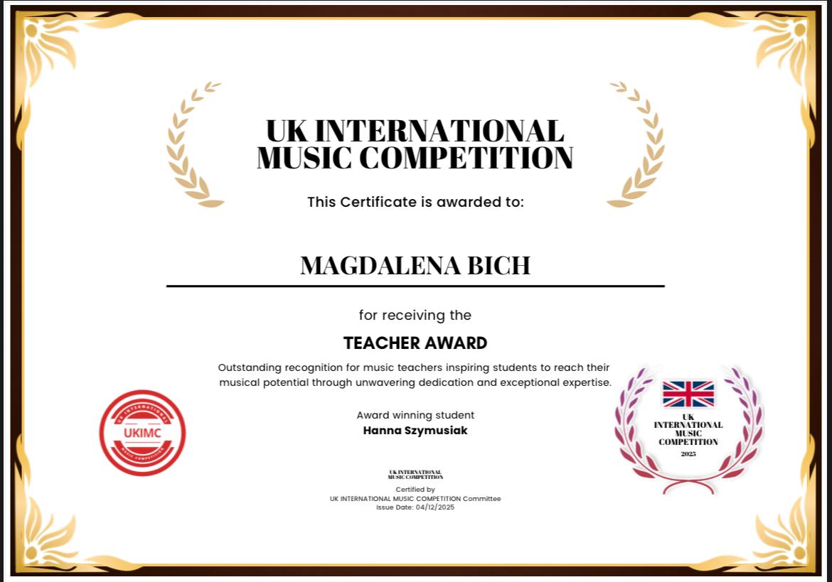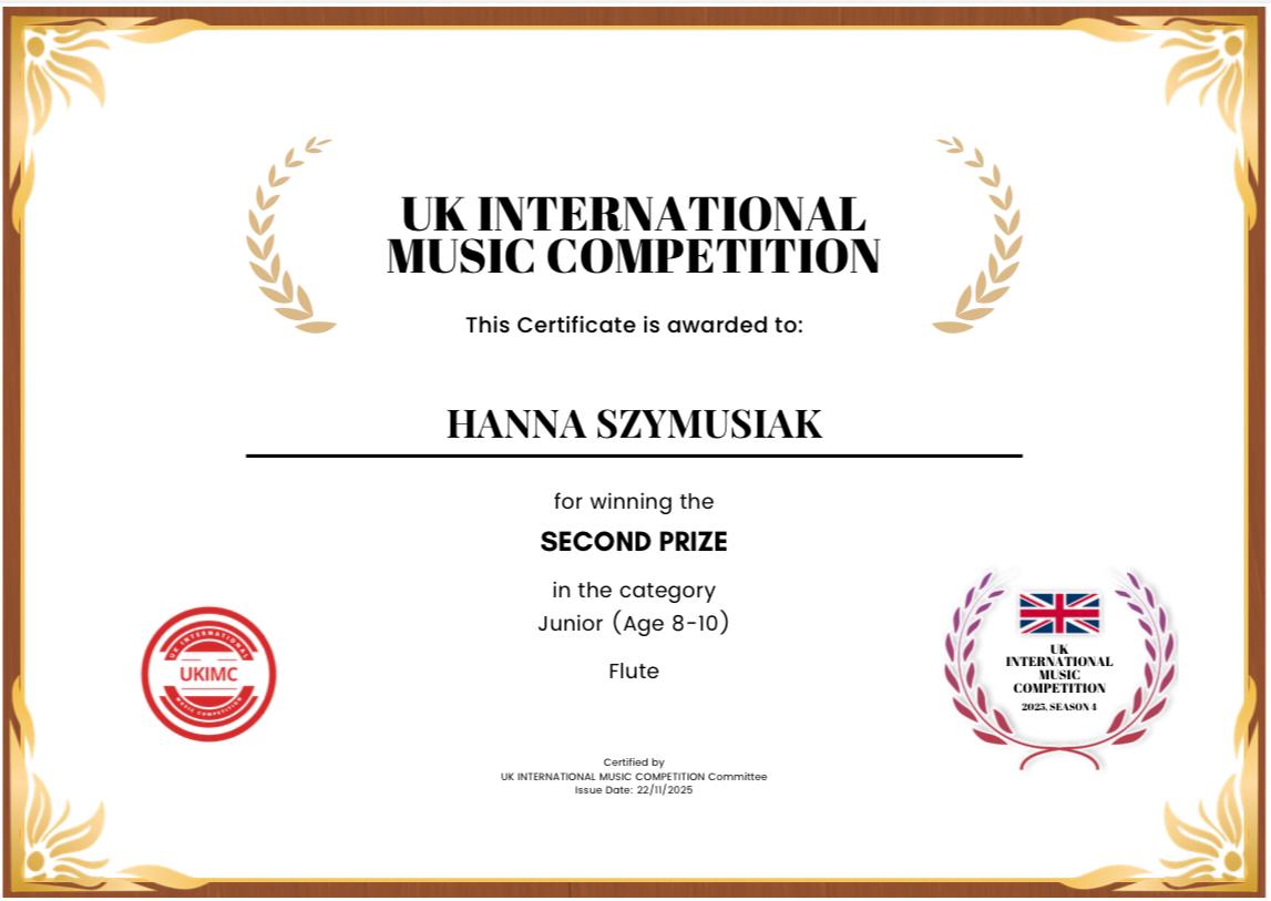 Z satysfakcją informujemy, że Hanna Szymusiak została laureatką II nagrody w międzynarodowym konkursie "UK International Music Competition" w kategorii fletu. Serdecznie gratulujemy uczennicy sukcesu, a mgr Magdalenie Bich przyznania wyróżnienia Teacher Award za wybitne osiągnięcia pedagogiczne.