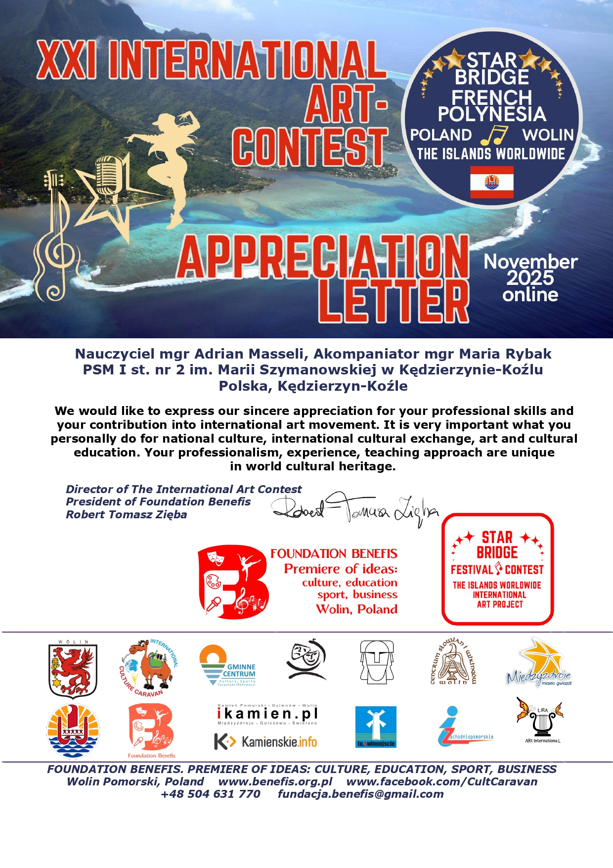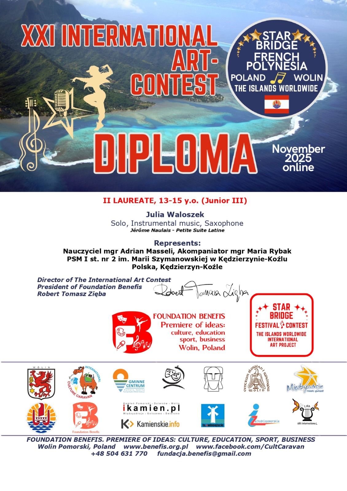 • II miejsce w XXI Międzynarodowym Konkursie "Star Bridge of the Islands Worldwide Wolin-Polinezja Francuska 2025” w kategorii Junior III (13-15 lat)