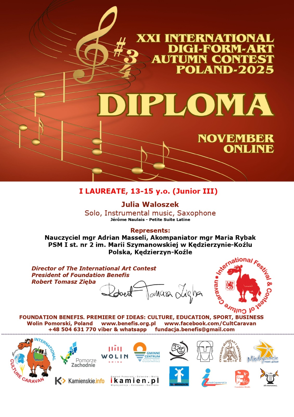 Julia Waloszek, uczennica VI klasy saksofonu Pana mgr Adriana Masseli i przy akompaniamencie Pani mgr Marii Rybak została w ostatnim czasie laureatką w dwóch międzynarodowych konkursach. Serdecznie gratulujemy!