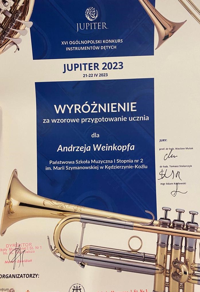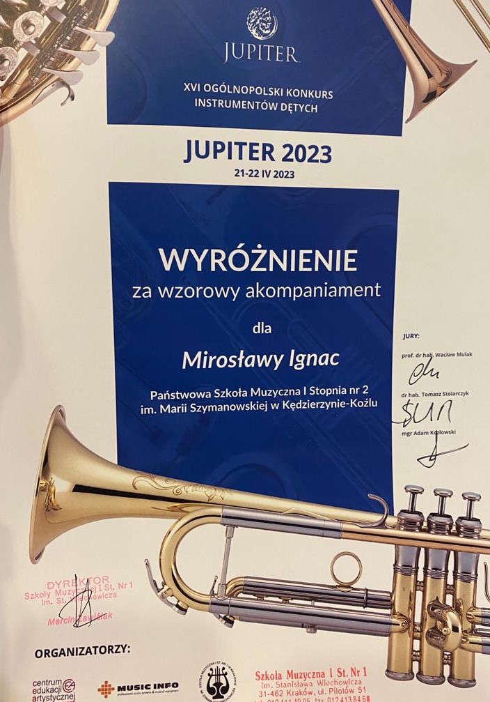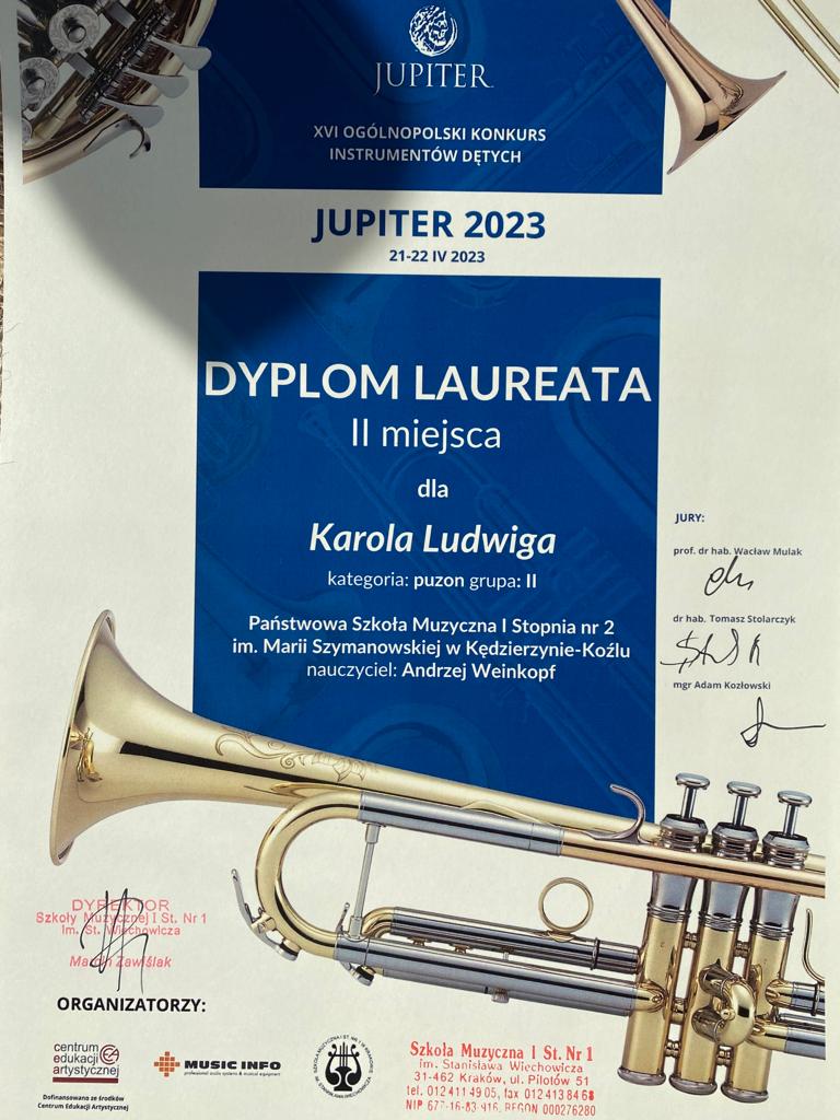 22 kwietnia uczniowie Tomasz Weinkopf oraz Karol Ludwig wzięli udział w XVI Ogólnopolskim Konkursie Instrumentów Dętych w Krakowie „JUPITER 2023”
