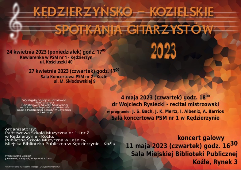 Zapraszamy na cykl koncertów gitarowych, organizowanych w naszym mieście na przełomie kwietnia i maja już od wielu lat. Uczestniczą w nich uczniowie szkół muzycznych z Kędzierzyna, Koźla oraz z Leśnicy. Odbędzie się również recital mistrzowski laureata wielu polskich i zagranicznych konkursów gitarowych, dra Wojciecha Rysieckiego.