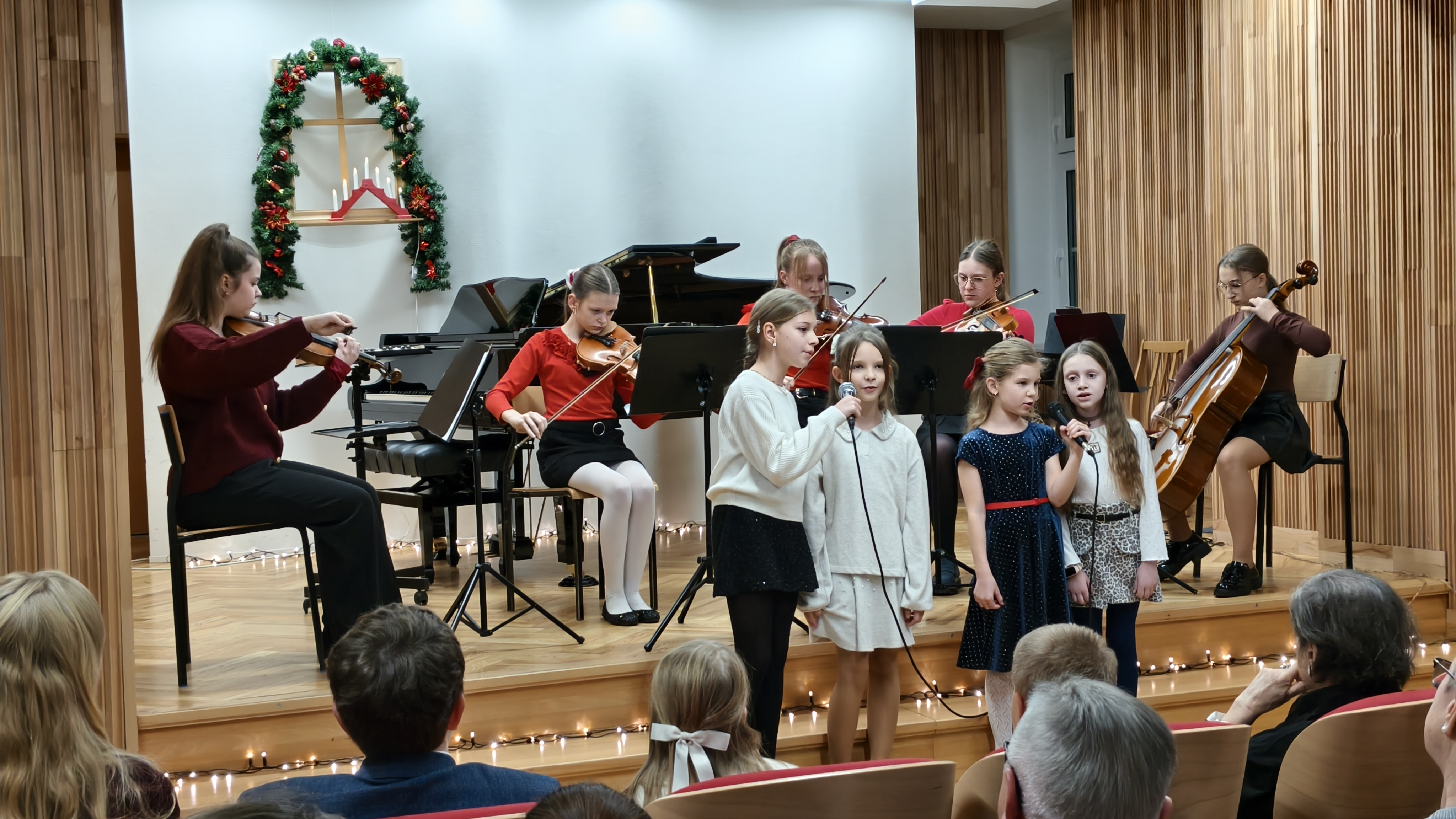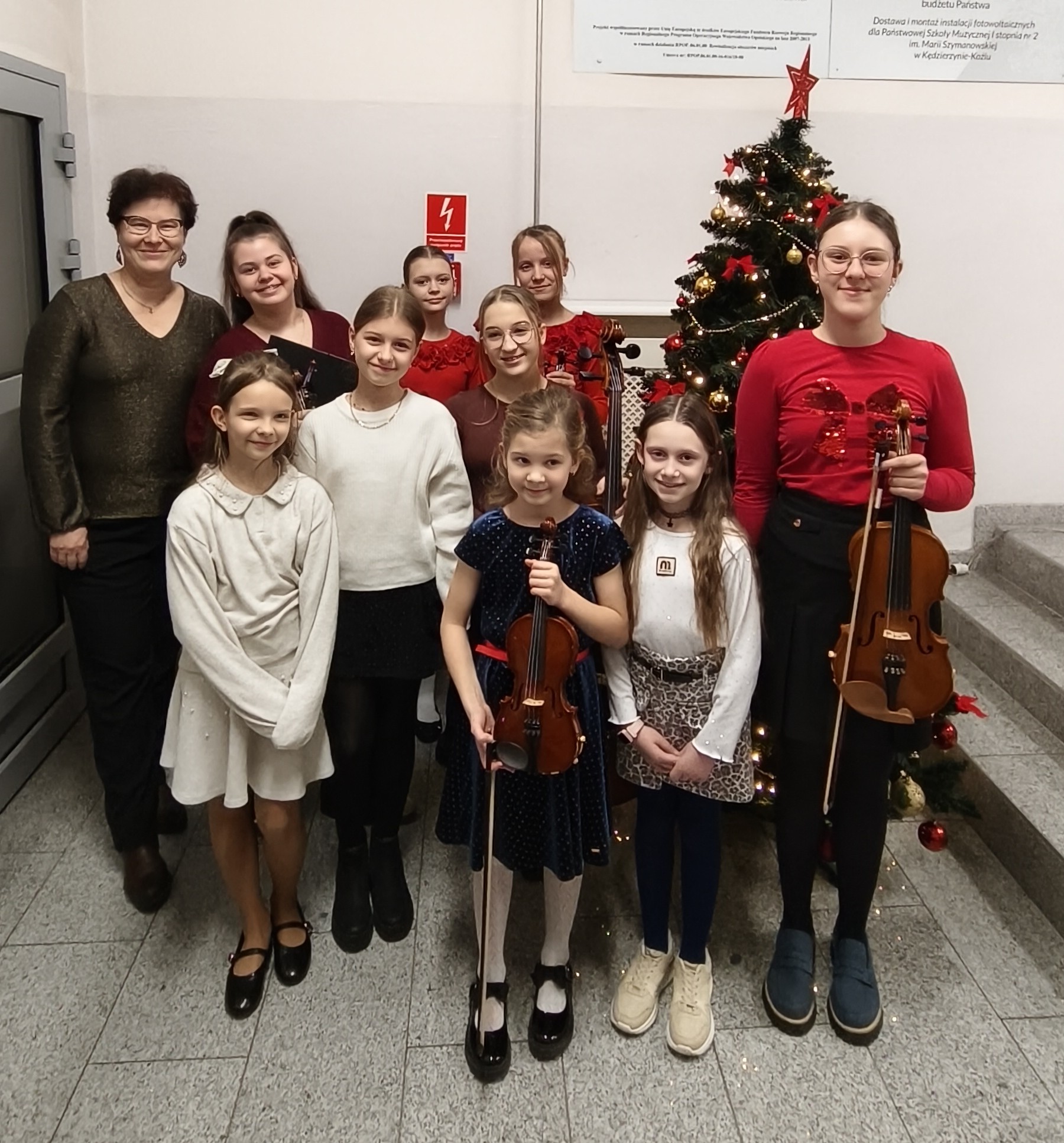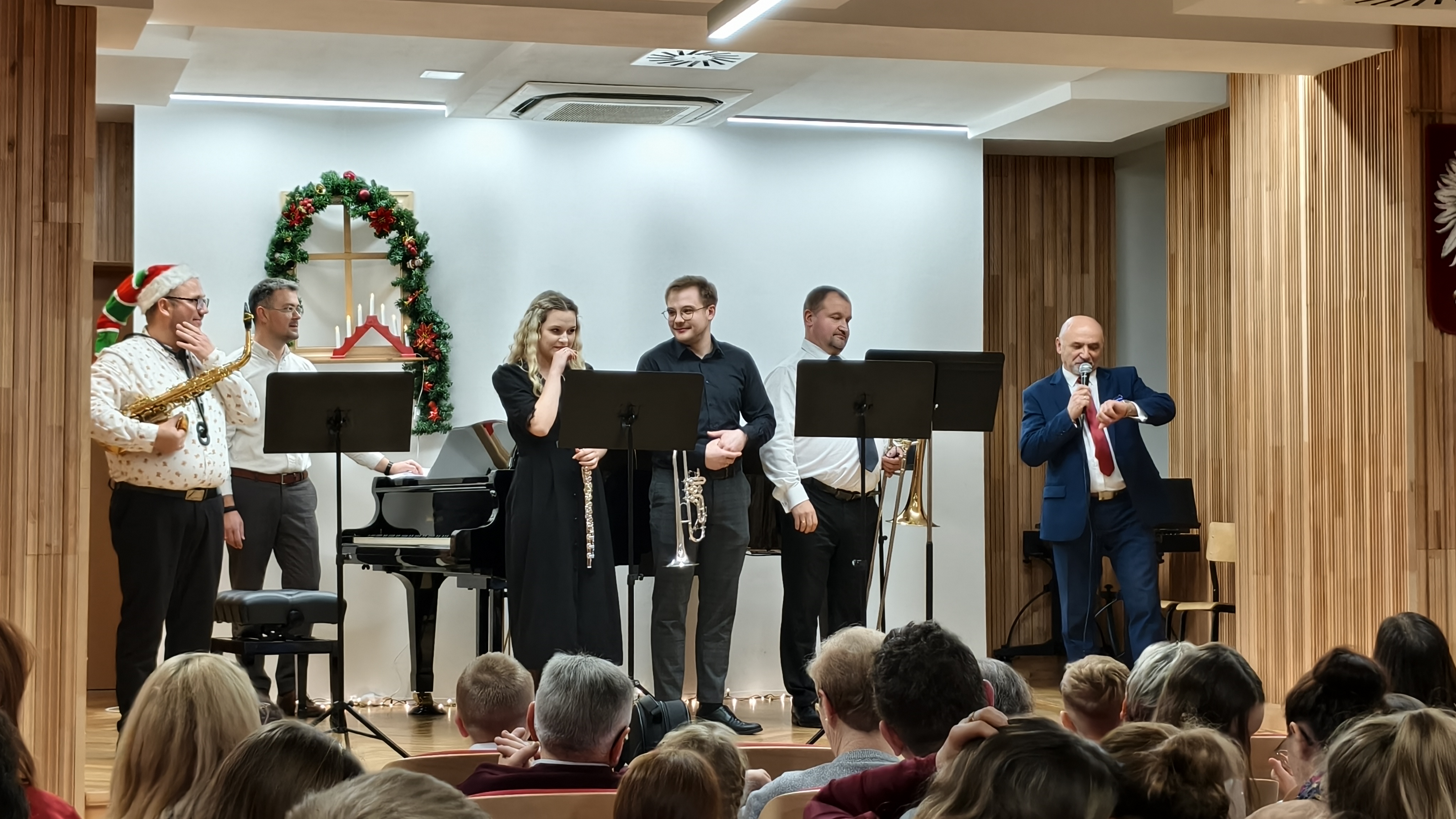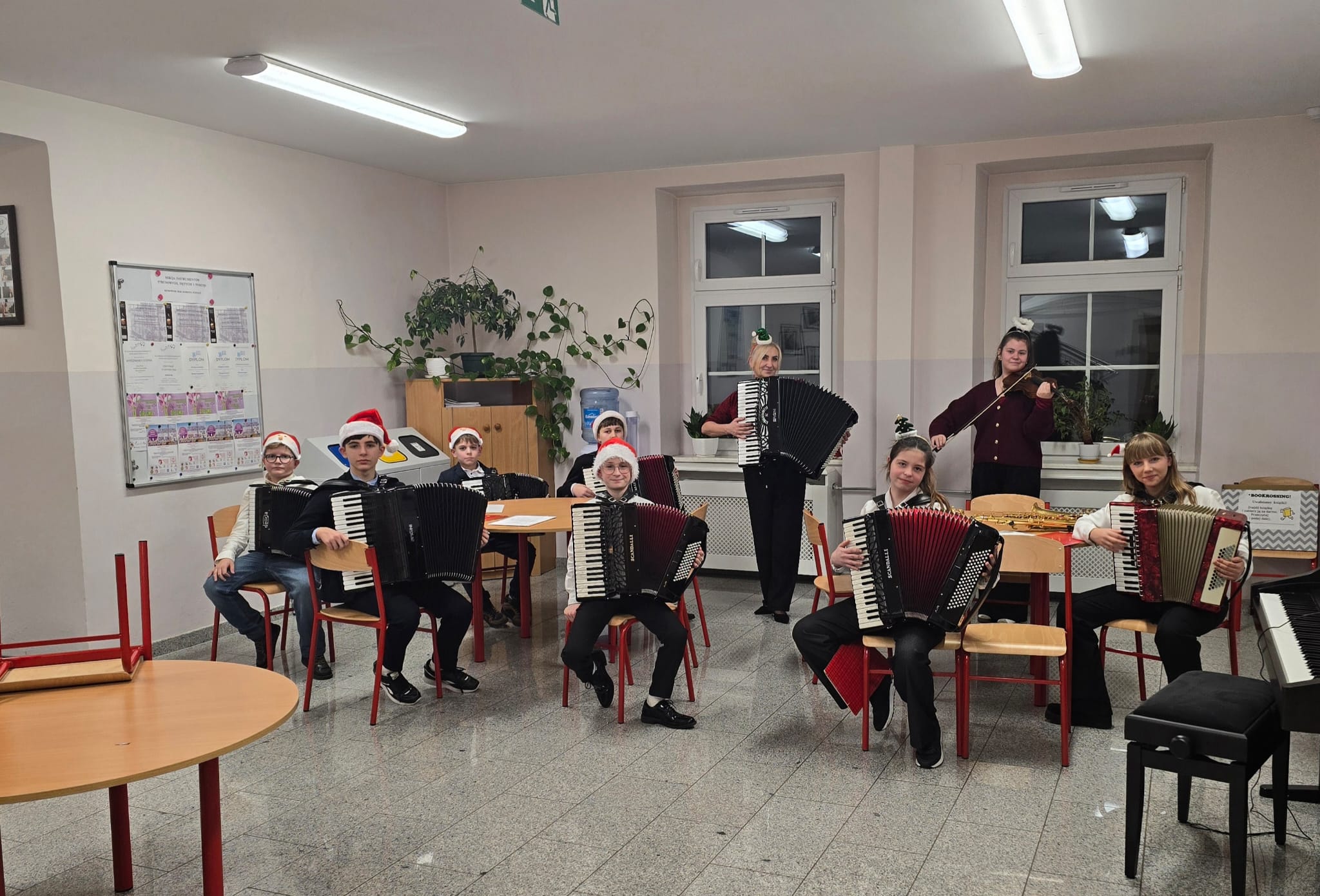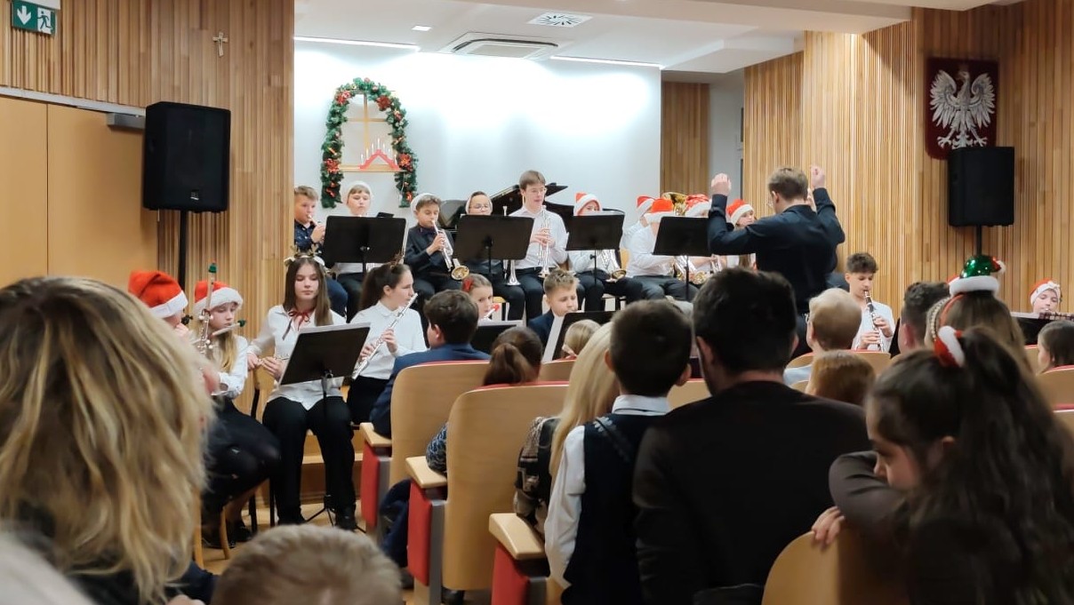 18 grudnia 2025 r. w radosnym świątecznym nastroju, uczniowie muzykowali w różnych zespołach, a licznie zgromadzona publiczność ze wzruszeniem wsłuchiwała się w melodie kolęd.