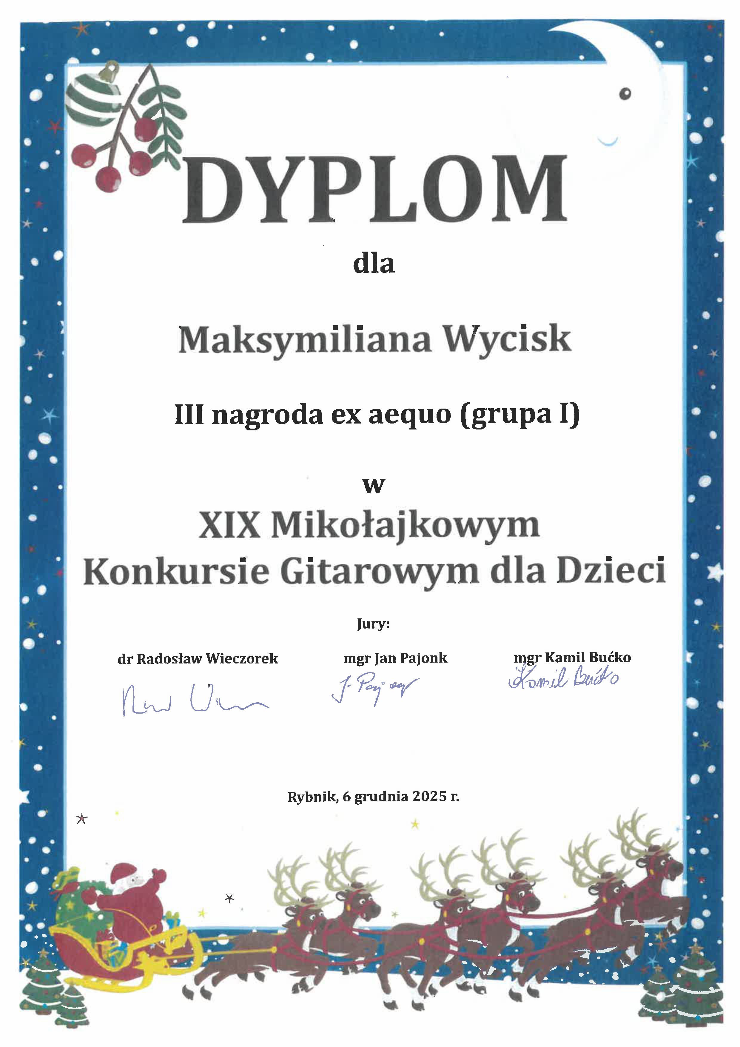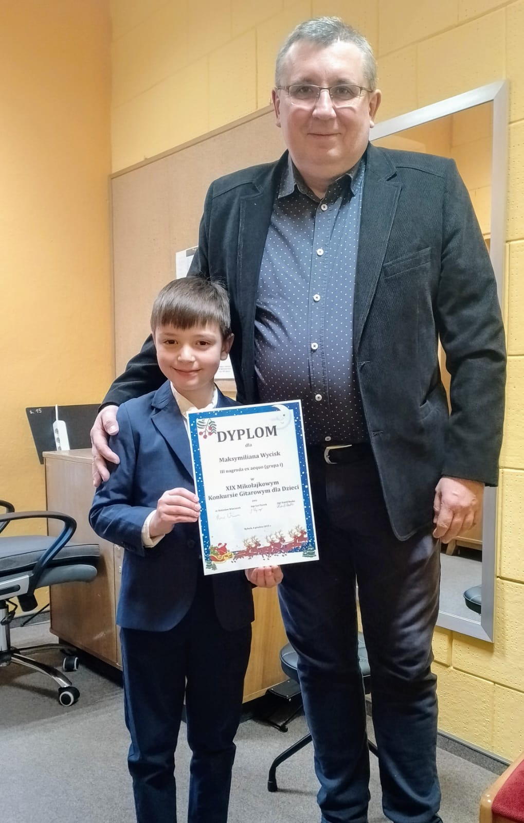 6 XII 2025 r. w Rybniku odbył się XIX Mikołajkowy Konkurs Gitarowy dla Dzieci. W najmłodszej kategorii wiekowej naszą szkołę reprezentował i zdobył III nagrodę "ex aequo" Maksymilian Wycisk, uczeń klasy II c. 6l. w klasie gitary pana Jarosława Bednarka. Serdecznie gratulujemy i życzymy dalszych sukcesów!
