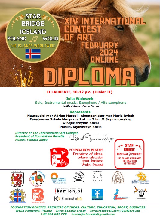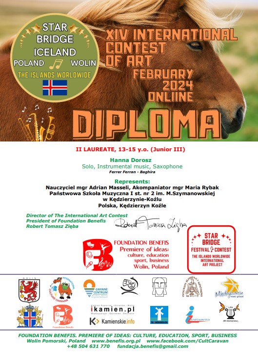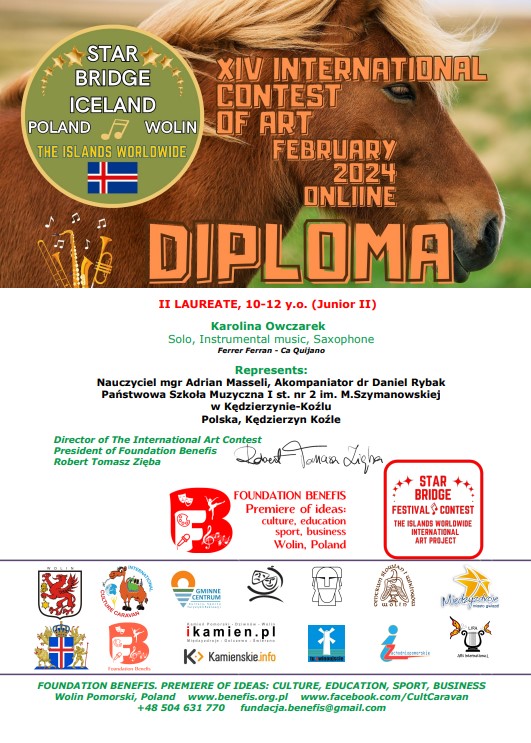 - II miejsce w "XIV International Contest of Art "Star Bridge of the Islands Worldwide Wolin- Islandia 2024” w kategorii - Junior II (10-12 lat)
