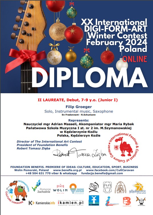 - II miejsce w Międzynarodowym Konkursie Internetowym "XX International Winter Contest „ Digi-Form-Art 2024 ” w kategorii Debiut - Junior I (7-9 lat)