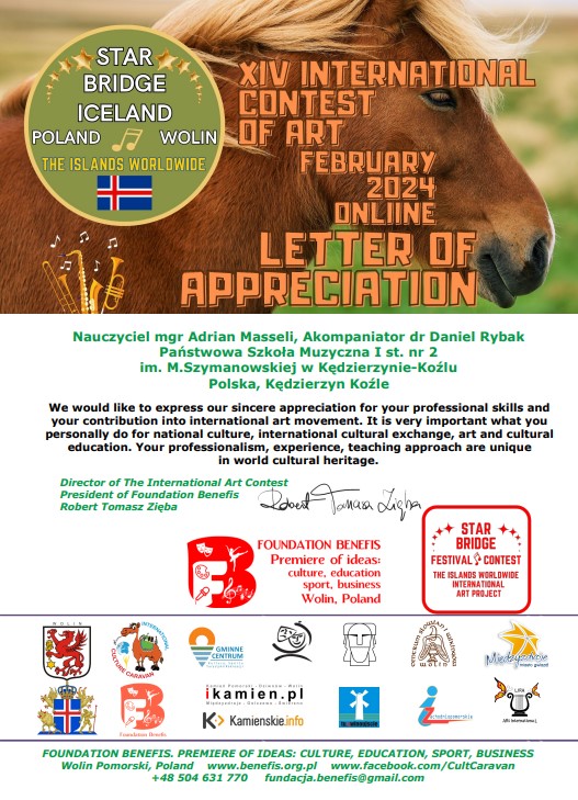 - III miejsce w "XIV International Contest of Art "Star Bridge of the Islands Worldwide Wolin- Islandia 2024” w kategorii Debiut - Junior I (7-9 lat)