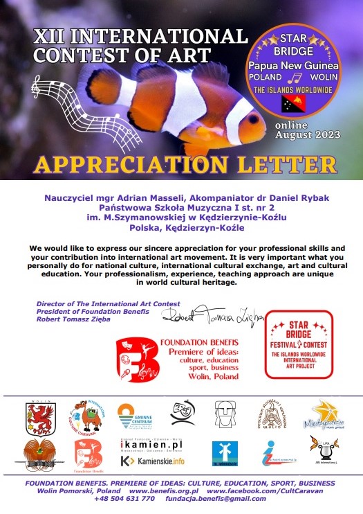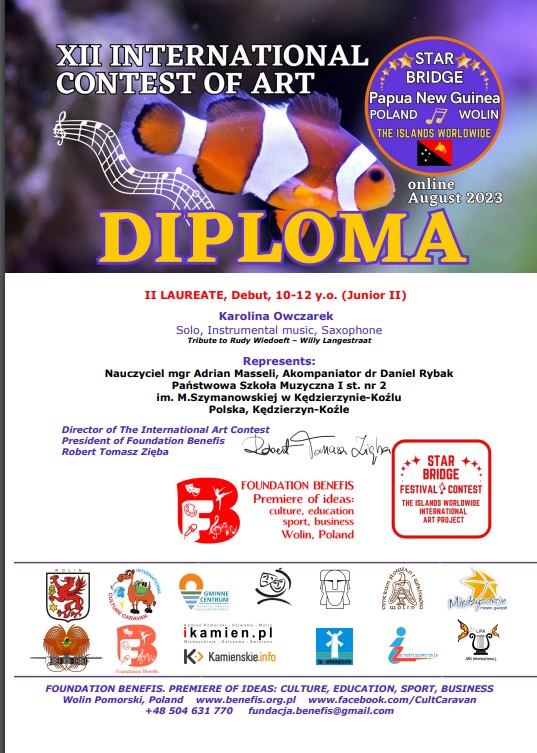 - II miejsce w "XII International Contest of Art "Star Bridge of the Islands Worldwide Wolin- Papua Nowa Gwinea 2023” w kategorii Debiut - Junior II (10-12 lat)