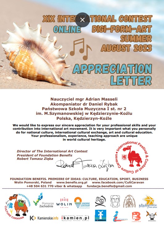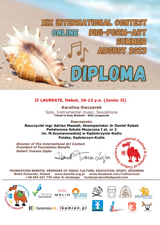 - II miejsce w Międzynarodowym Konkursie Internetowym "XIX International Contest „Digi-Form-Art Summer 2023” w kategorii Debiut - Junior II (10-12 lat)