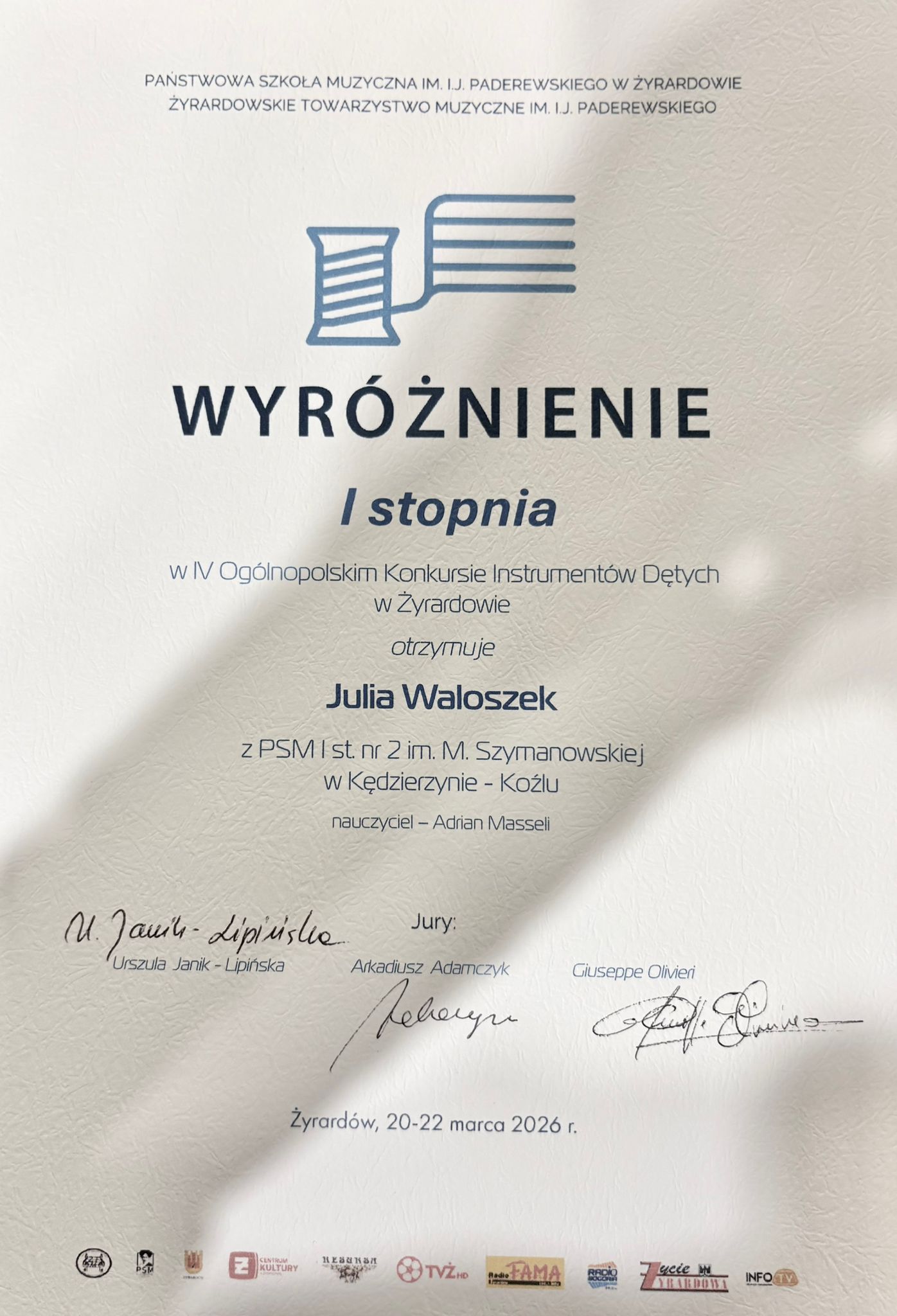 Julia Waloszek – Wyróżnienie I stopnia (klasa Adriana Masseli),