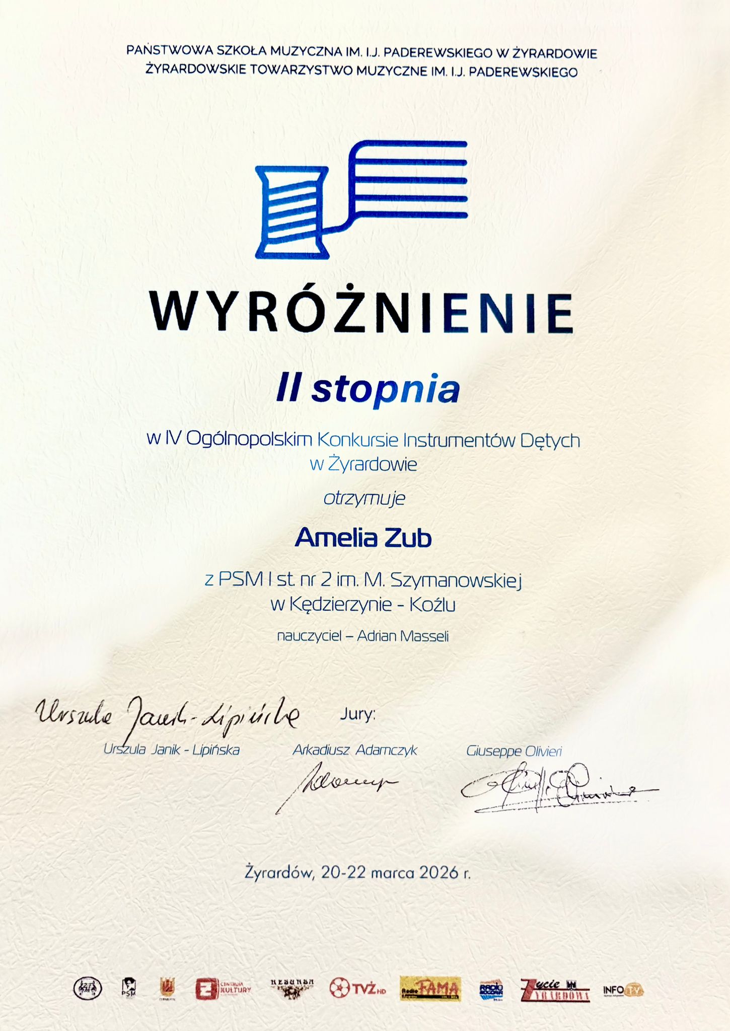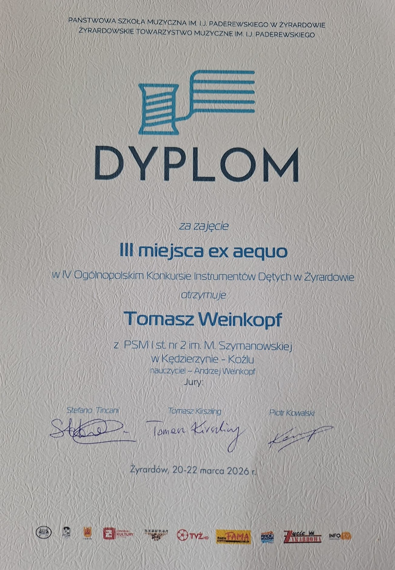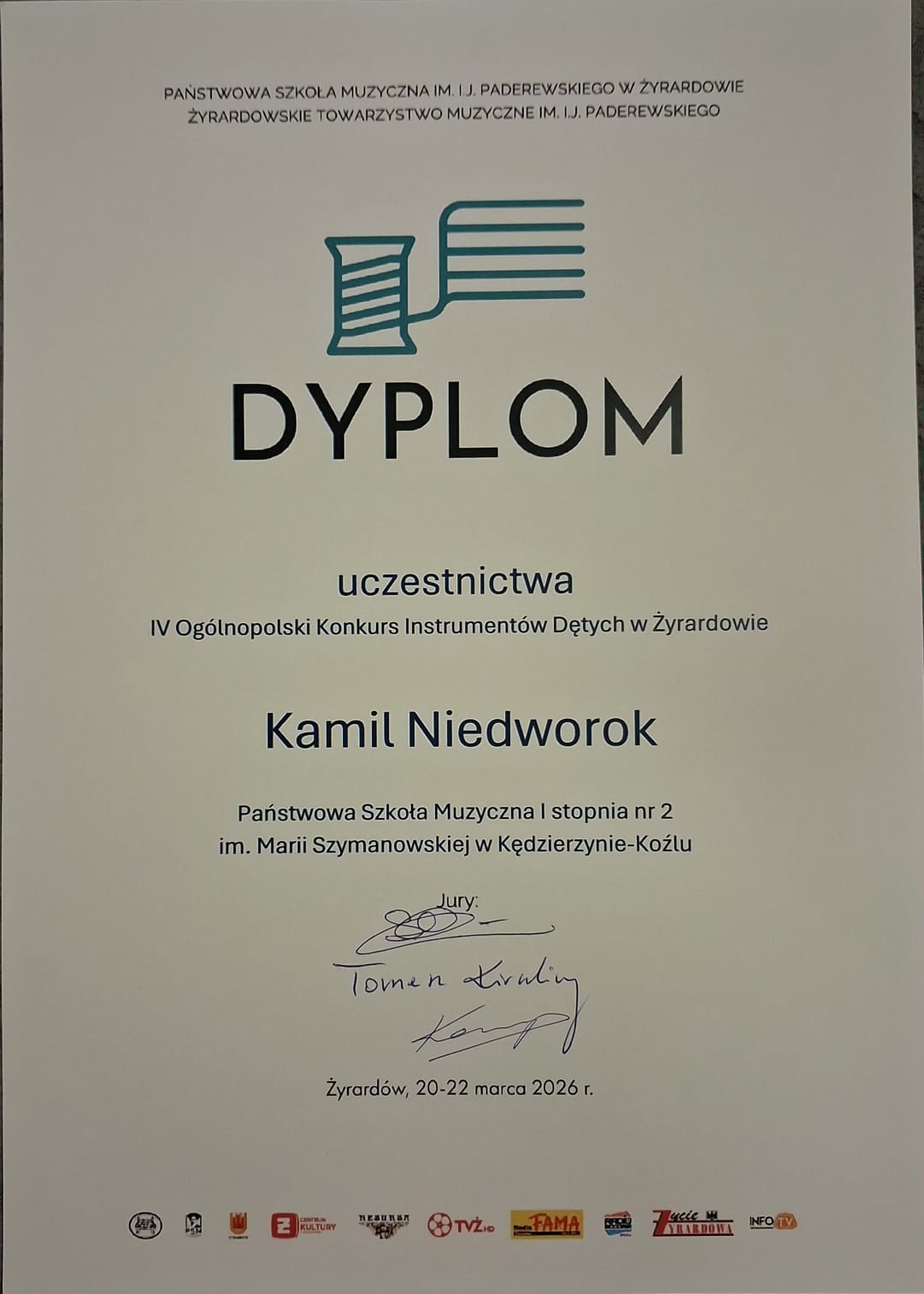 W konkursie wziął również udział Kamil Niedworok (uczeń PSM w Kędzierzynie-Koźlu), który otrzymał dyplom uczestnictwa.
