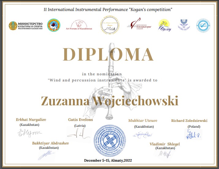 Zuzanna Wojciechowski – uczennica VI klasy saksofonu Pana mgr Adriana Masseli i przy akompaniamencie Pana dr Daniela Rybaka została w ostatnim czasie laureatką w trzech konkursach międzynarodowych. Serdecznie gratulujemy!