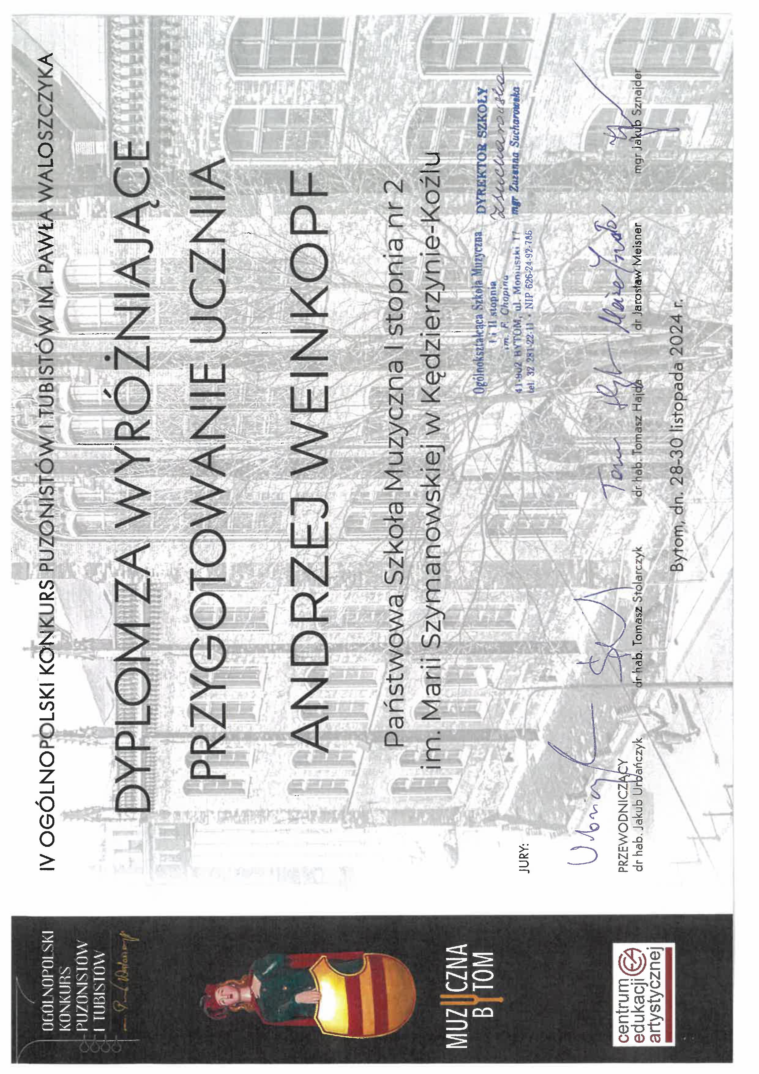 Tomasz Weinkopf, uczeń klasy V c.6-l. zdobył III miejsce (grupa I) w IV Ogólnopolskim Konkursie Puzonistów i Tubistów im. Pawła Waloszczyka, który odbył się w dniach od 28 do 30 listopada 2024 roku w Bytomiu. Gratulujemy Tomaszowi oraz jego nauczycielowi, panu Andrzejowi Weinkopfowi oraz pani akompaniator Mirosławie Ignac.