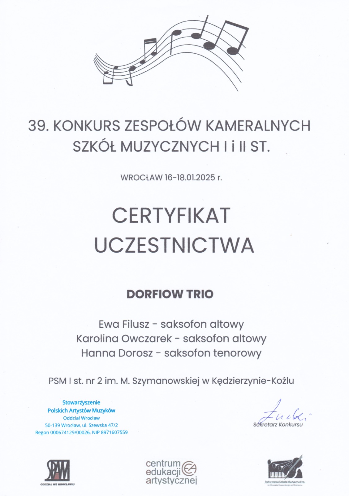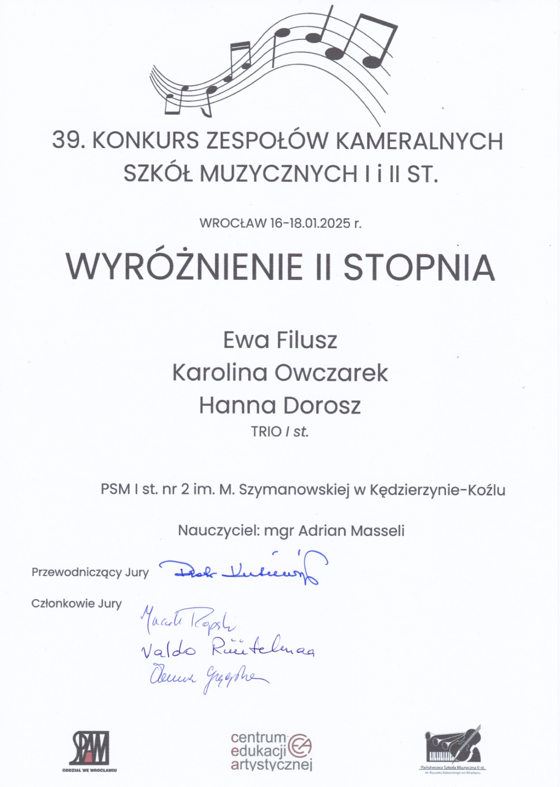 Nasze uczennice grające w DORFIOW TRIO, w ramach 39. Konkursu Zespołów Kameralnych Szkół Muzycznych I i II stopnia, który odbył się we Wrocławiu w dniach 16-18 stycznia 2025 roku otrzymały WYRÓŻNIENIAE II STOPNIA. Zespół w składzie: Ewa Filusz, Karolina Owczarek i Hanna Dorosz pracuje pod opieką nauczyciela mgr Adriana Masselego. Serdecznie gratulujemy!