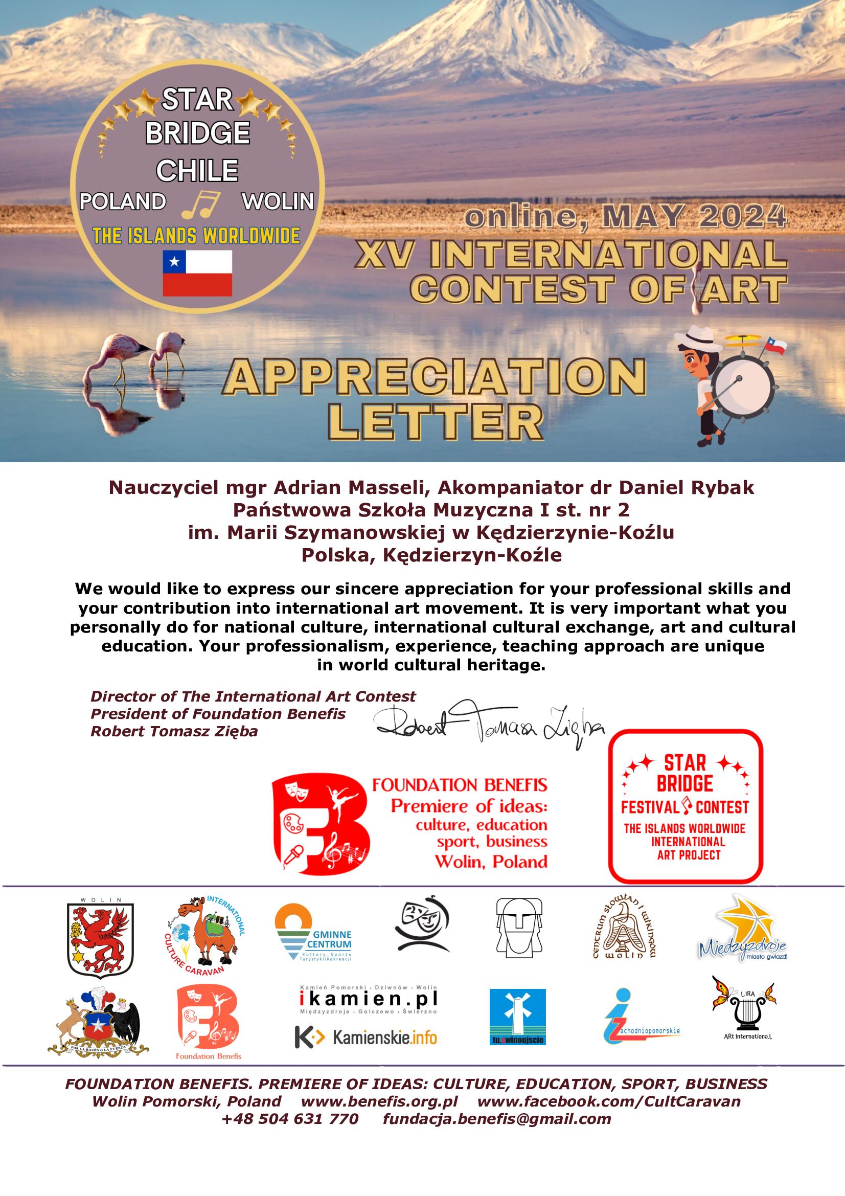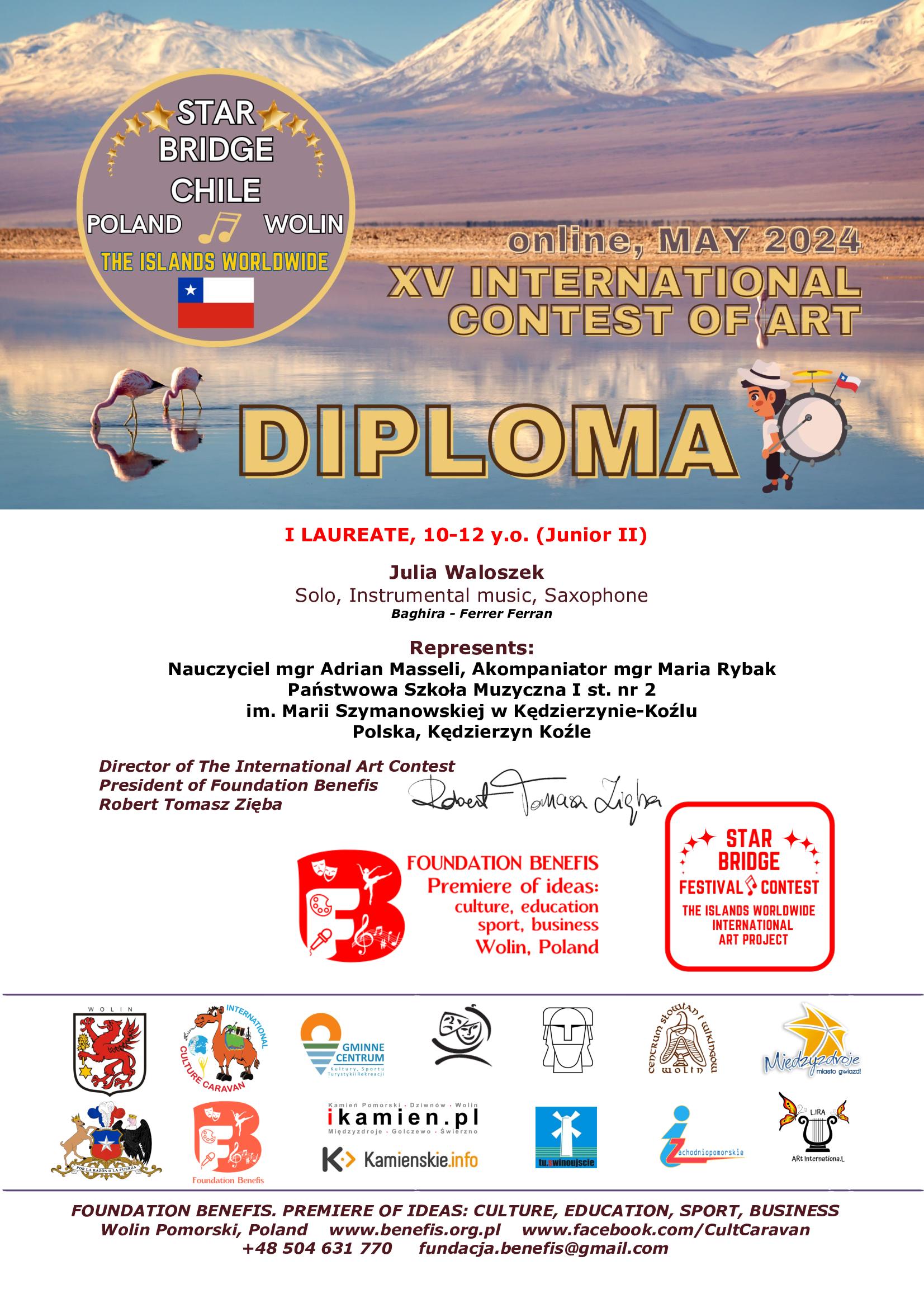 - I miejsce w "XV International Contest of Art 'Star Bridge of the Islands Worldwide' Wolin- Chile 2024” w kategorii - Junior II (10-12 lat)