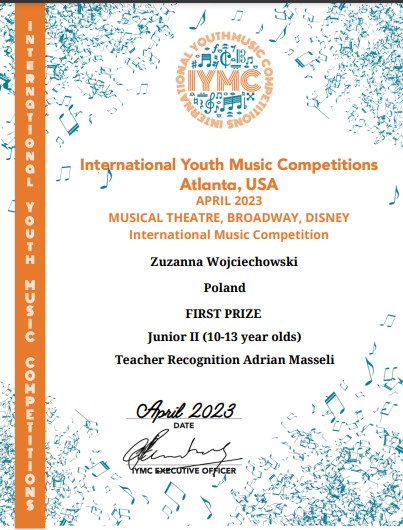 - Zuzanna Wojciechowski otrzymała I nagrodę w kategorii Junior II (10-13 lat), dyplomy uznania wpłynęły także na ręce jej nauczyciela, pana Adriana Masselego oraz akompaniatora, dra Daniela Rybaka