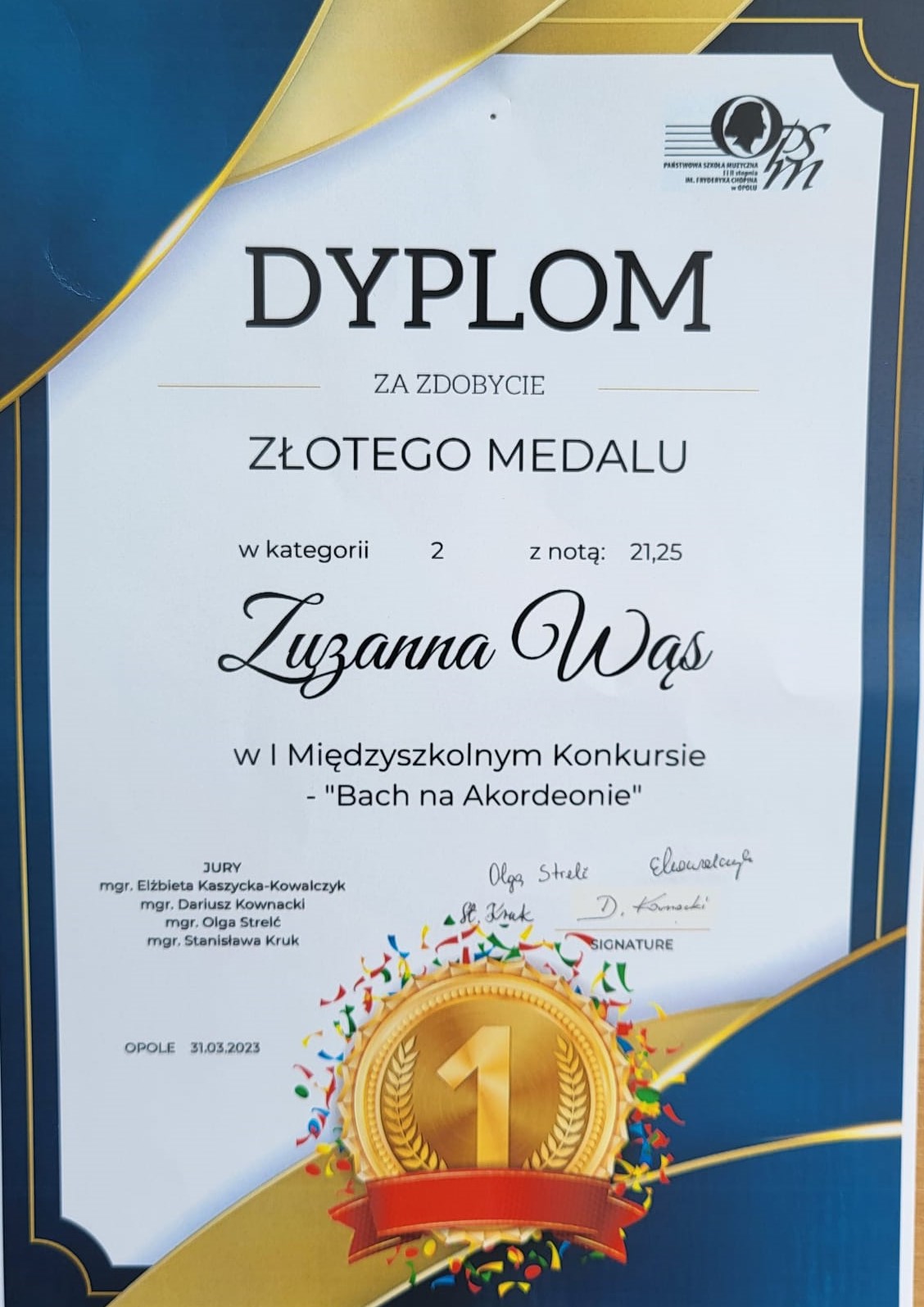 Zuzanna Wąs, uczennica V klasy akordeonu pani Ewy Rudzkiej-Sługockiej wzięła udział w I Międzyszkolnym Konkursie Akordeonowym "Bach na akordeonie" w Opolu.