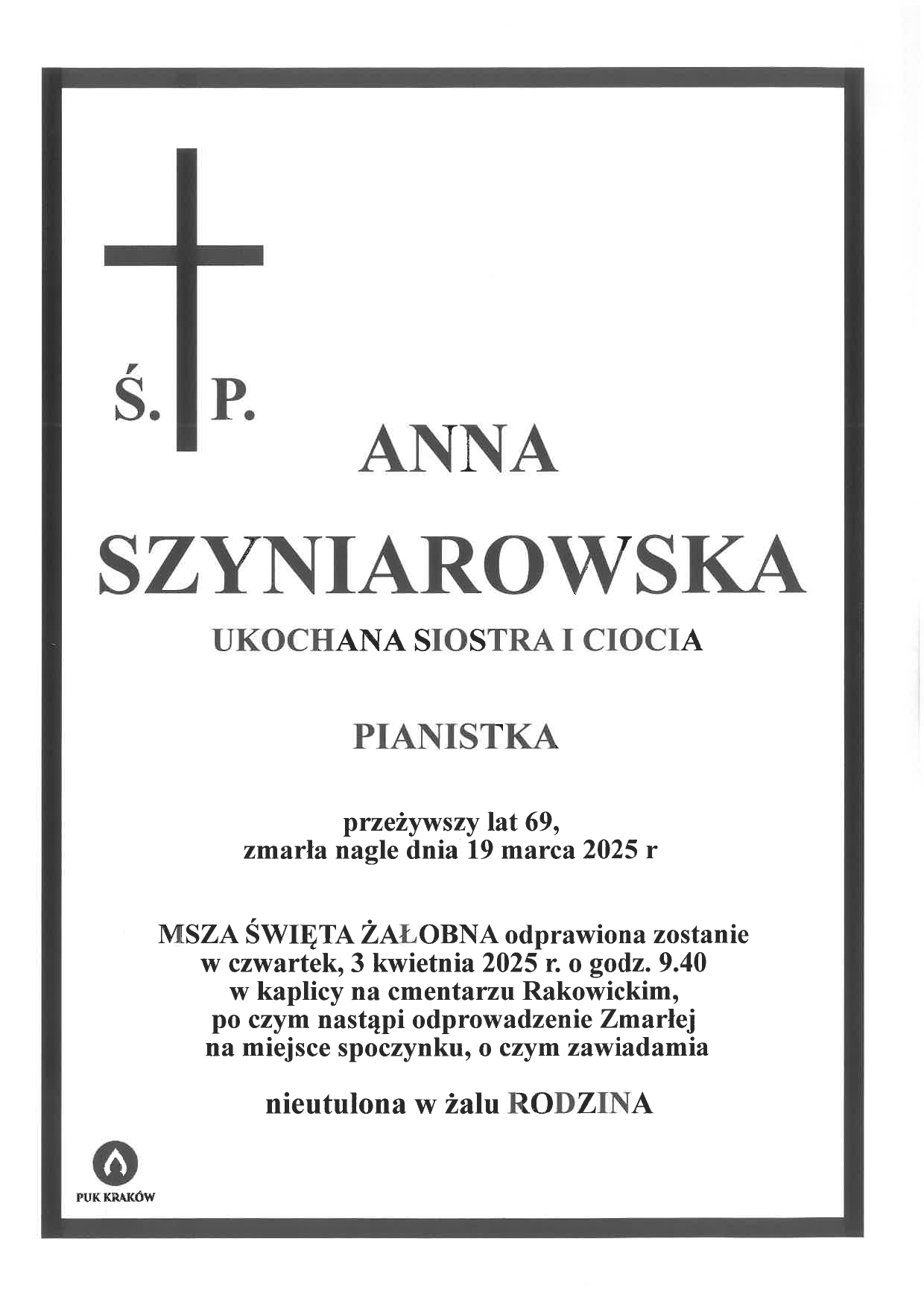 Msza żałobna zostanie odprawiona w czwartek 3 kwietnia 2025 r. o godz. 9.40 w kaplicy na Cmentarzu Rakowickim.