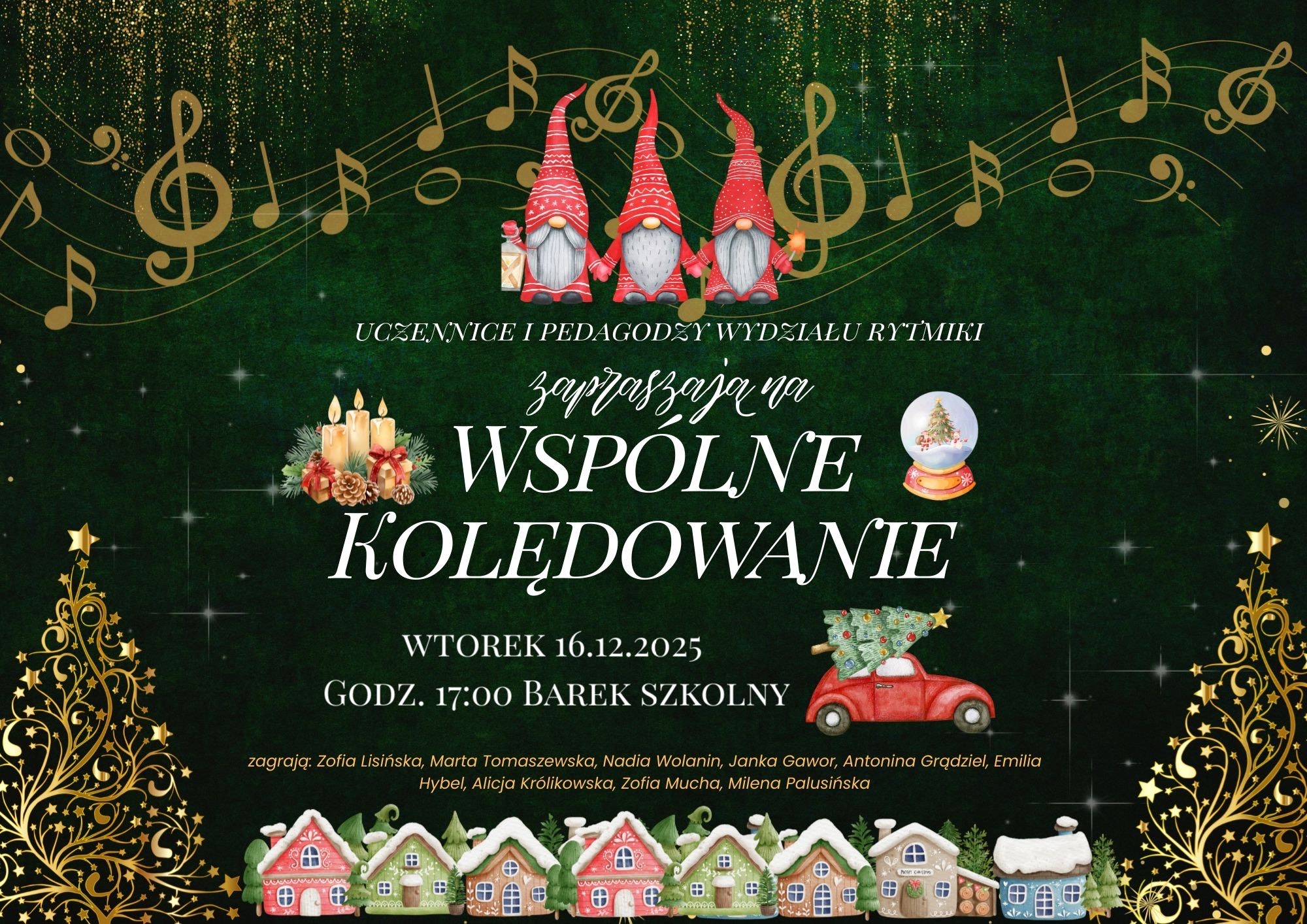 Uczennice i pedagodzy Wydziału Rytmiki serdecznie zapraszają na Wspólne Kolędowanie, które odbędzie się 16 grudnia o godz. 17.00 w szkolnym barku.