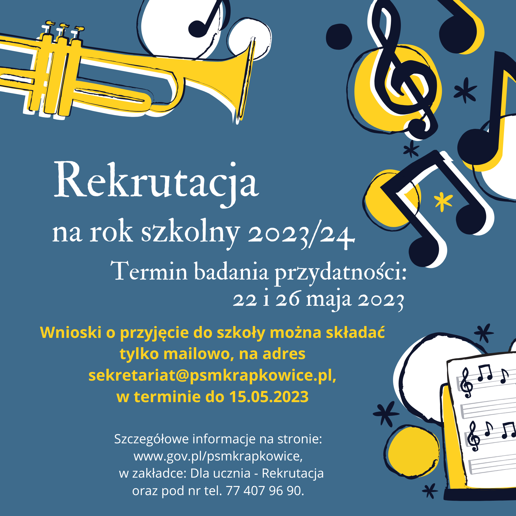 Wszystkich zainteresowanych rekrutacją w naszej szkole prosimy o wypełnienie Wniosku o przyjęcie do szkoły i przesłanie go na adres: sekretariat@psmkrapkowice.pl.