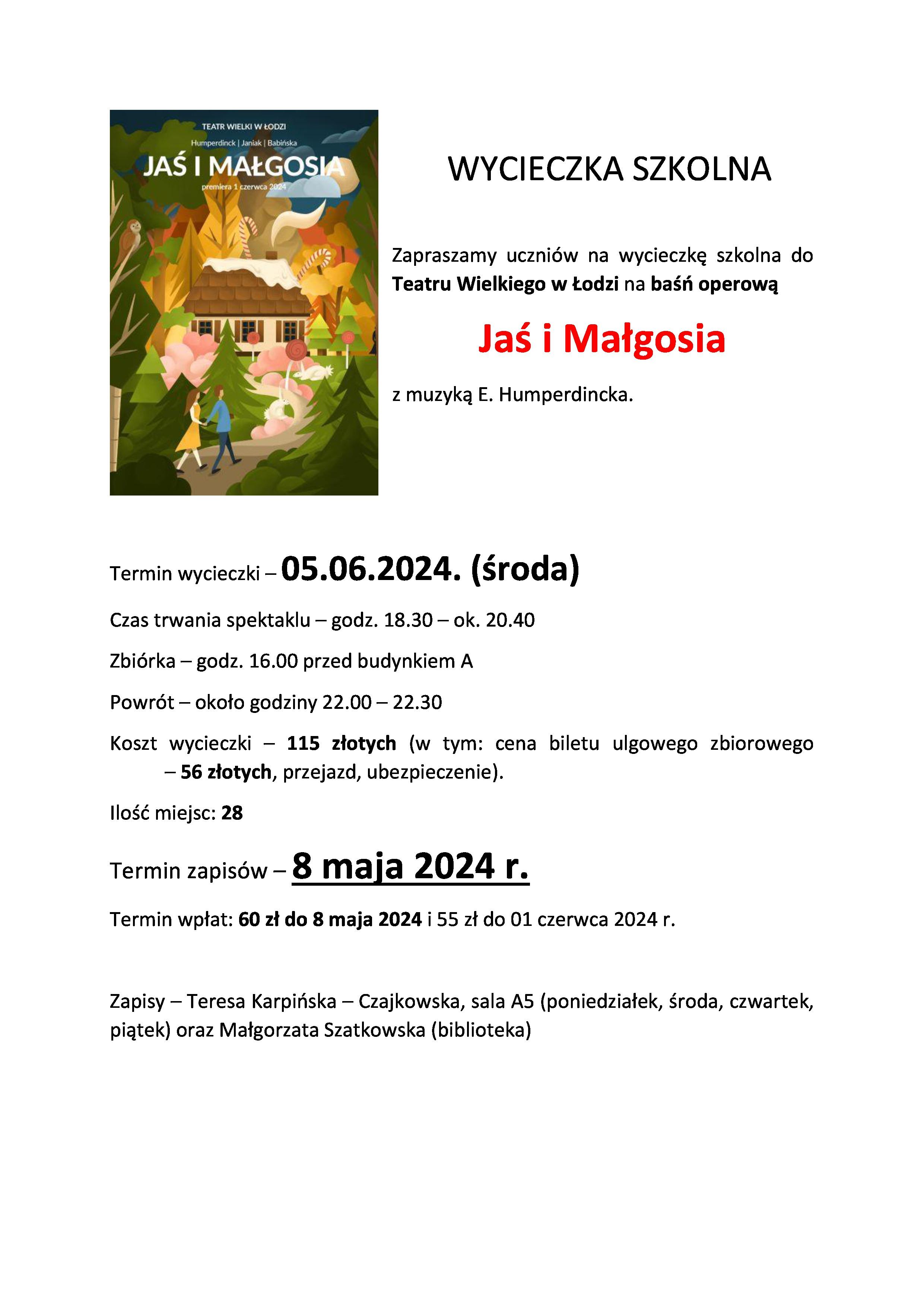 Termin wpłat: 60 zł do 8 maja 2024 i 55 zł do 01 czerwca 2024 r. Zapisy – Teresa Karpińska – Czajkowska, sala A5 (poniedziałek, środa, czwartek, piątek)