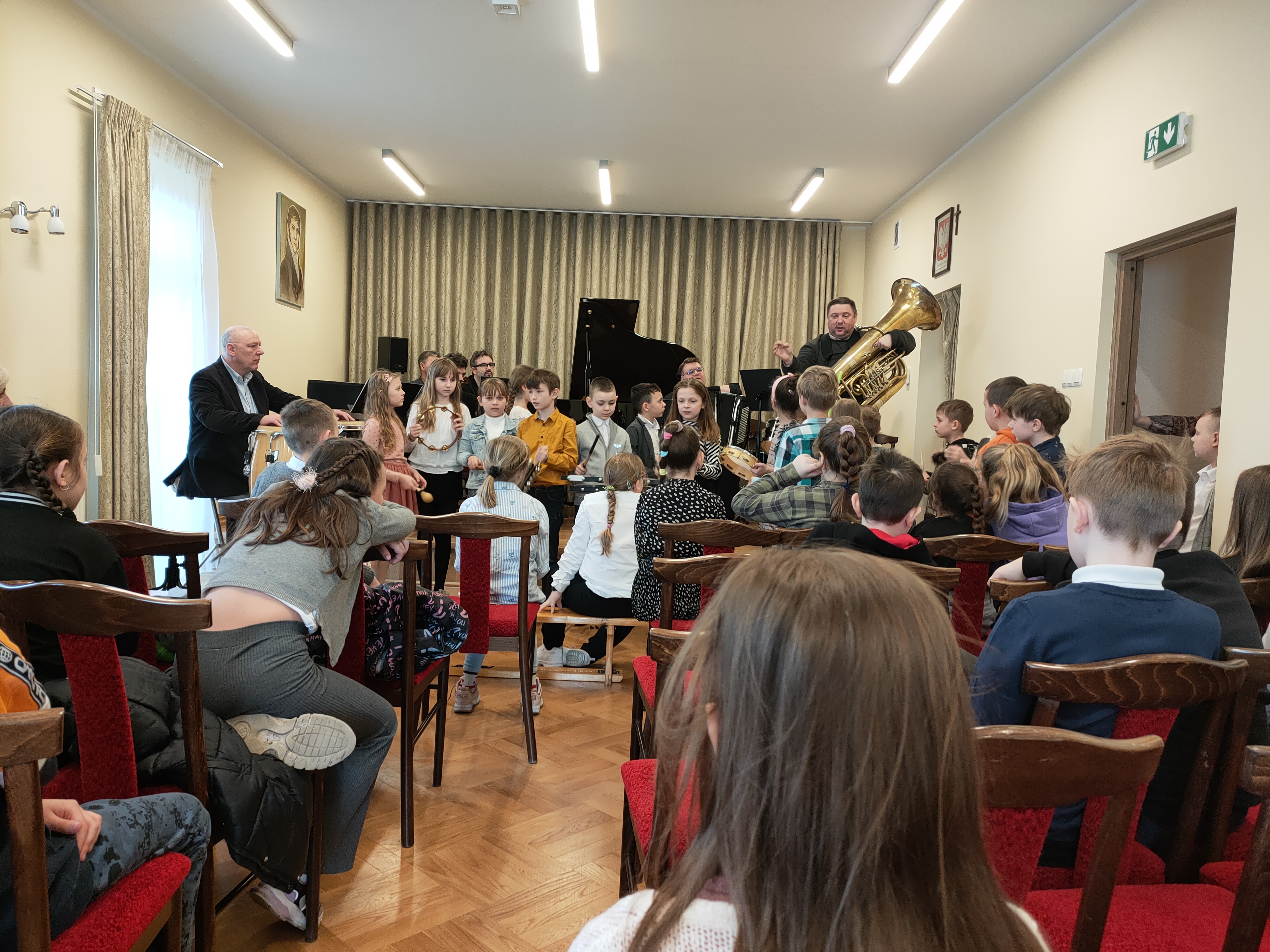 W dniu 5 kwietnia w Państwowej Szkole Muzycznej I i II st w Kutnie Filia w Łęczycy odbył się piewrwszy z zaplanowanych koncertów rekrutacyjnych dla szkół i przedszkoli. Na pierwszy koncert zostali zaproszeni uczniowie SP nr 3 z Łęczycy i SP nr 4 z Ozorkowa. Uczniowie Szkoły Muzycznej zaprezentowali wiele instrumentów, na których uczą się na co dzień: fortepian, akordeon, skrzypce, gitarę, wiolonczelę, trąbkę, flet, klarnet, tubę i perkusję. Publiczność reagowała bardzo spontanicznie i nagradzała wszystkich wykonawców gromkimi brawami. W drugiej części wystapił zespół nauczycieli, który zaprezentował słynne tematy muzyki filmowej, m. in. z takich filmów jak „Piraci z Karaibów” czy „James Bond”. Wszystkie melodie były doskonale rozpoznawane przez publiczność. Ogromnym zaciekawieniem cieszyło się również zorganizowane na sam koniec jam session - wspólne muzykowanie z publicznością. Rozdano wiele drobnych instrumentów perkusyjnych (tzw. przeszkadzajki - klawesy, marakasy, tamburyna, kastaniety, pudełka akustyczne, shakery, bembenki itp) i rozpoczęła się wspólna zabawa muzyczna, do której ochoczo przystąpiły prawie wszystkie dzieci z publiczności. To była ogromna przepełniona radością orkiestra, w której wziął udział również zespół nauczycieli, akompaniując na takich instrumentach jak: fortepian, gitara elektryczna, skrzypce, akordeon, tuba, congi, zaś na zestawie perkusyjnym grał Antek - uczeń szkoły muzycznej. Cały koncert poprowadziła Pani Katarzyna Herbich.