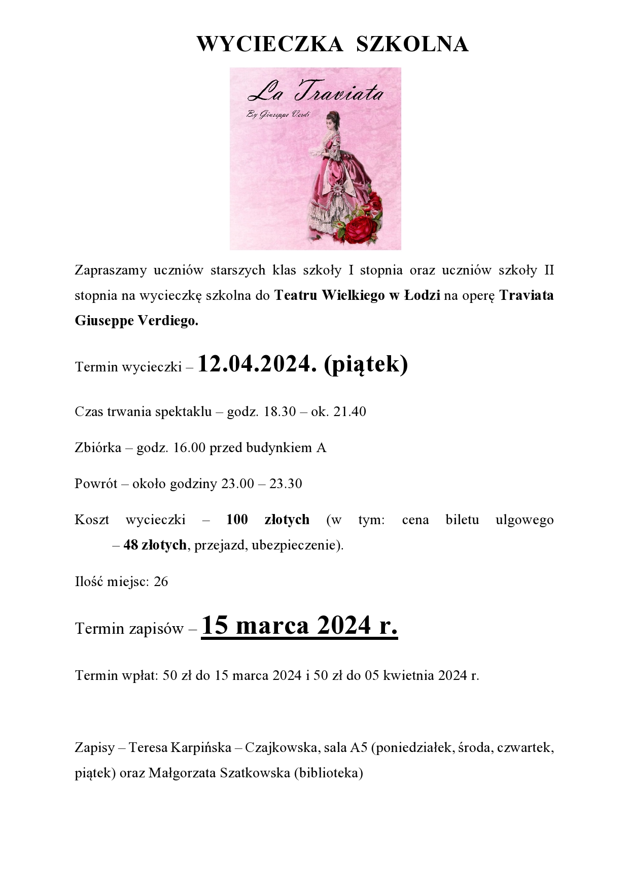 Zapraszamy uczniów starszych klas szkoły I stopnia oraz uczniów szkoły II stopnia na wycieczkę szkolna do Teatru Wielkiego w Łodzi na operę Traviata Giuseppe Verdiego.