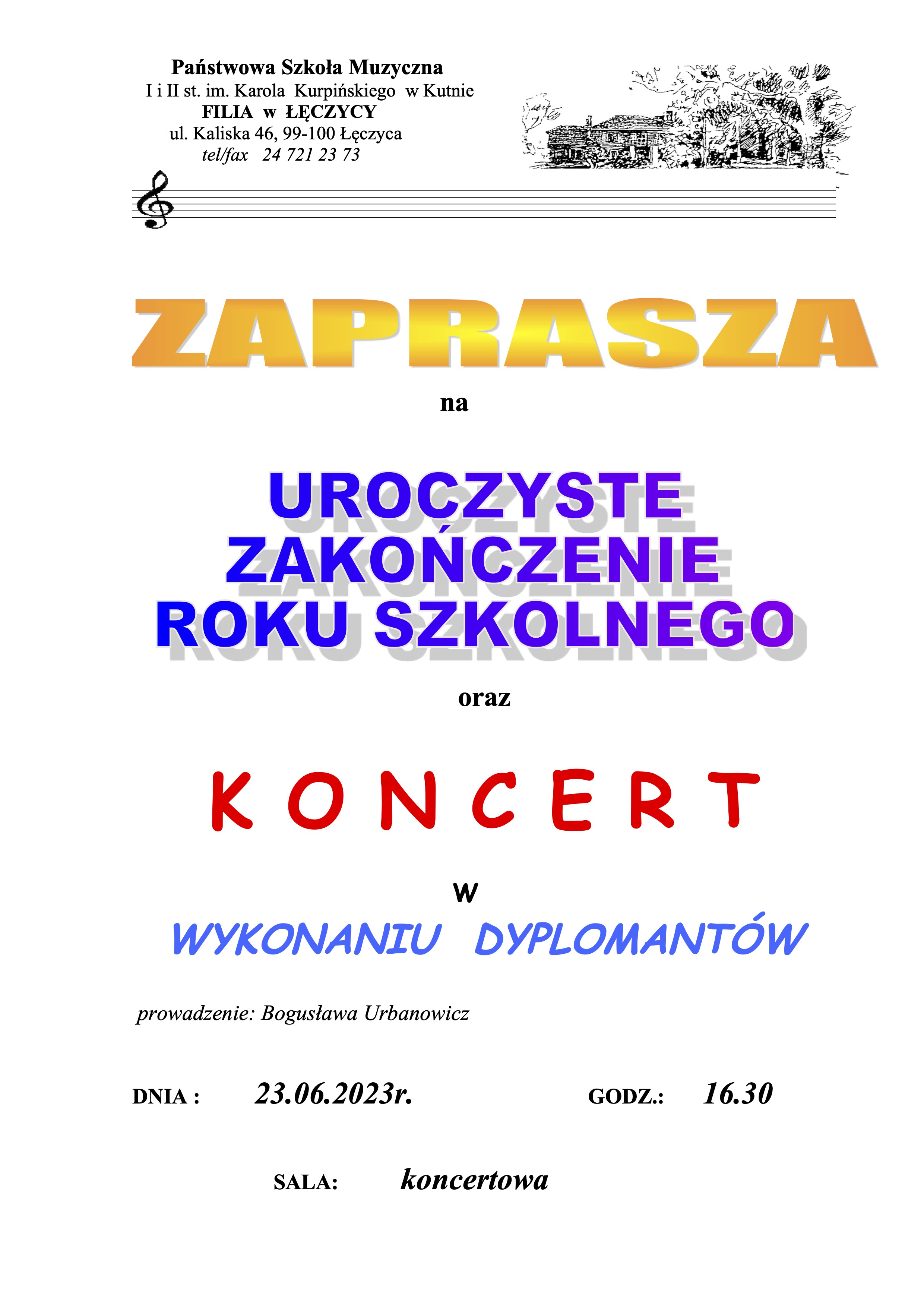 Serdecznie zapraszamy naszych uczniów oraz rodziców na zkończenie roku szkolnego, które odbędzie się 23 czerwca 2023r. w sali koncertowej naszej szkoły w Łęczycy o godzinie 16:30. Obędzie się też wspanialy koncert z udziałem dyplomantów naszej szkoły.
