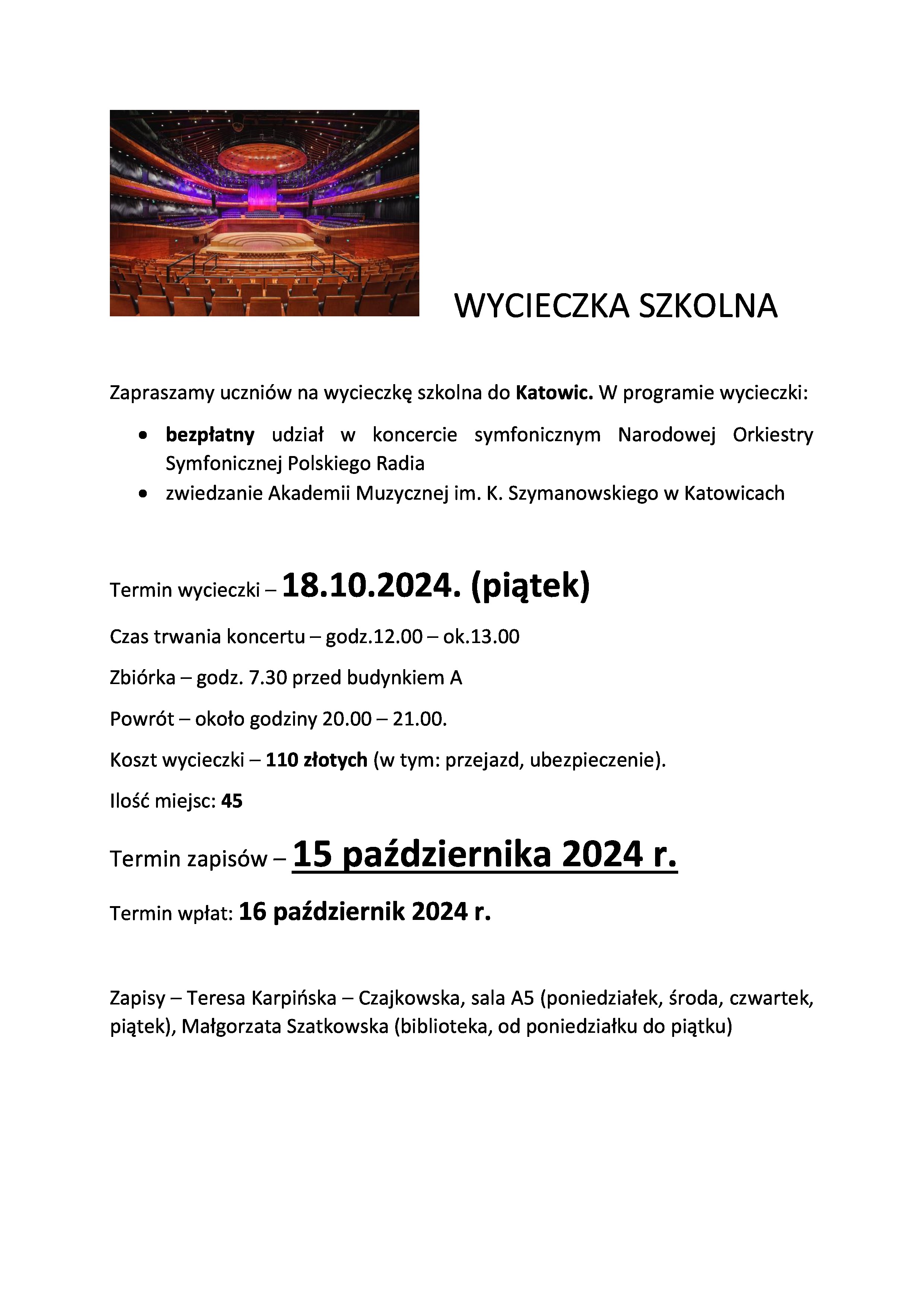 - zwiedzanie Akademii Muzycznej im. K. Szymanowskiego w Katowicach