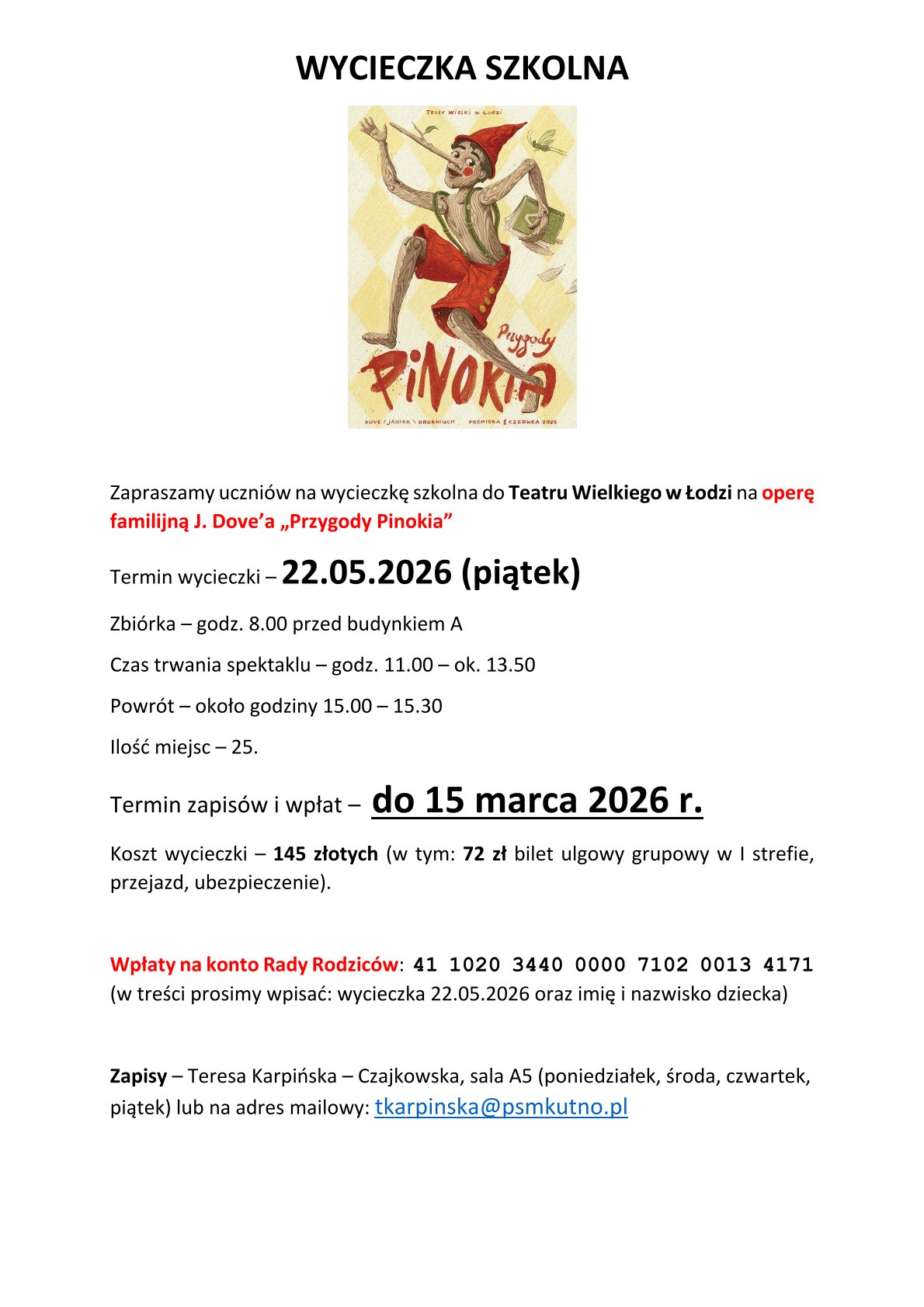 (w treści prosimy wpisać: wycieczka 22.05.2026 oraz imię i nazwisko dziecka)