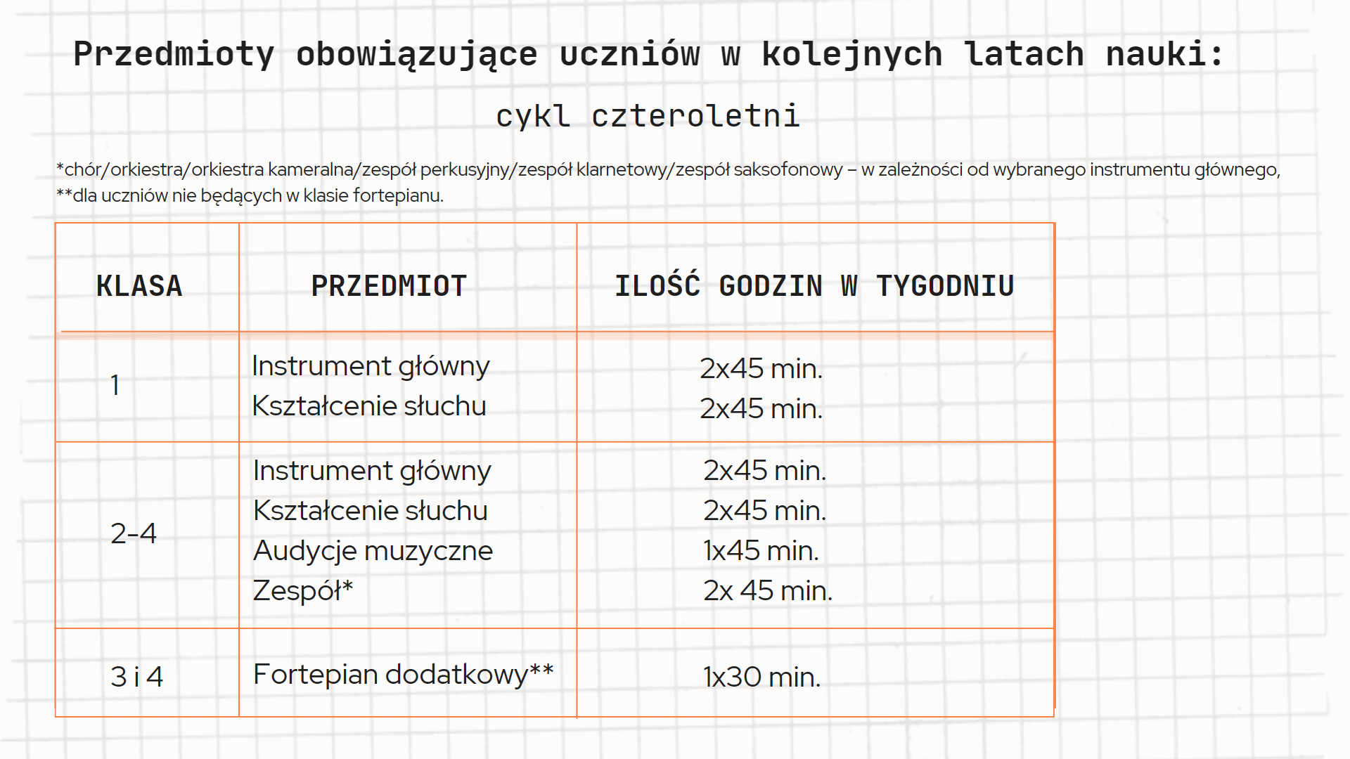 cykl czteroletni - dzieci w wieku od 8 do 16 roku życia akordeon, trąbka, klarnet, saksofon, flet, perkusja, fagot, gitara, puzon, tuba, altówka, wiolonczela, fortepian, kontrabas