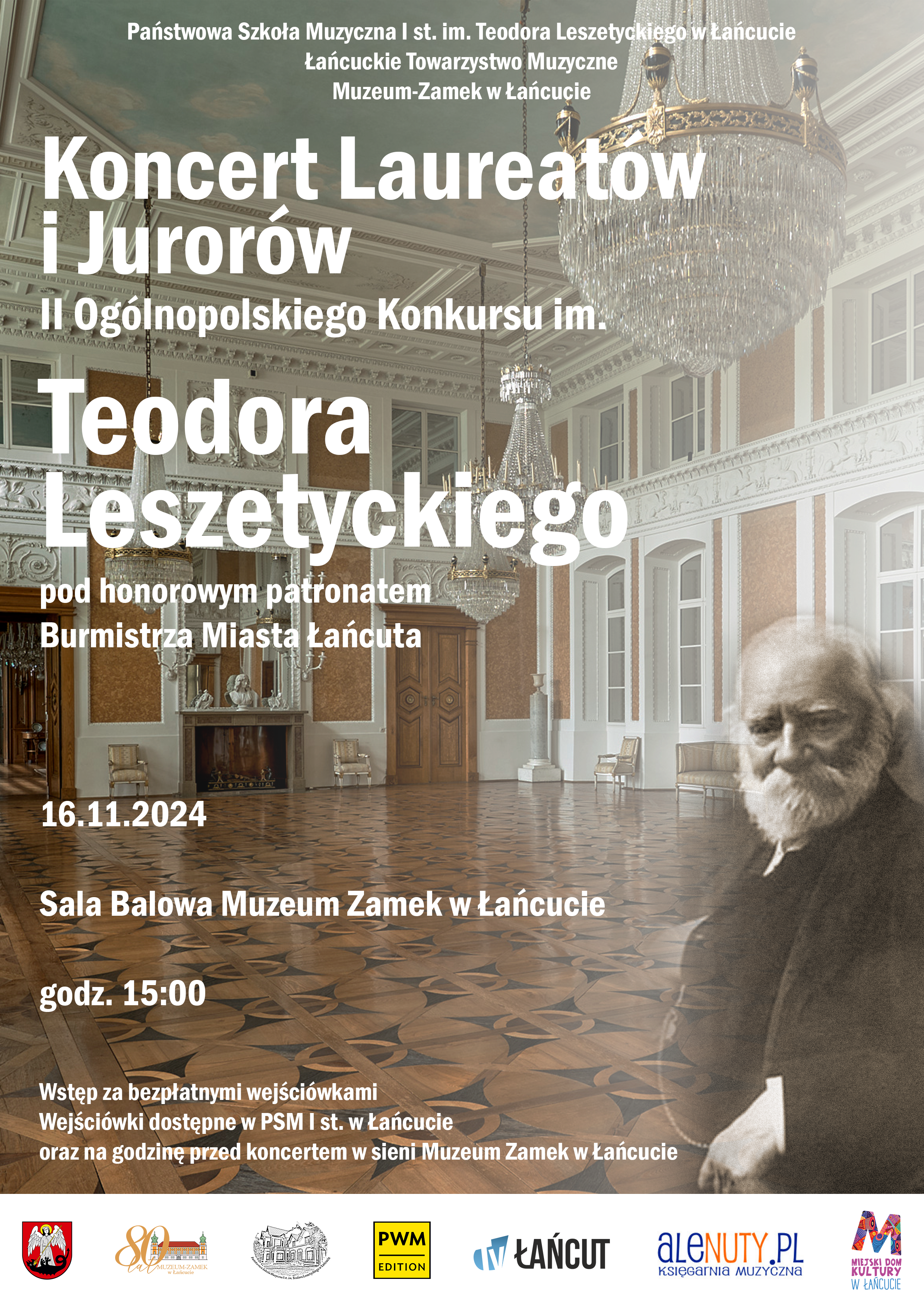 W sobotę 16 listopada 2024 r. zapraszamy na Koncert Laureatów i Jurorów II Ogólnopolskiego Konkursu Pianistycznego im. Teodora Leszetyckiego w Łańcucie.