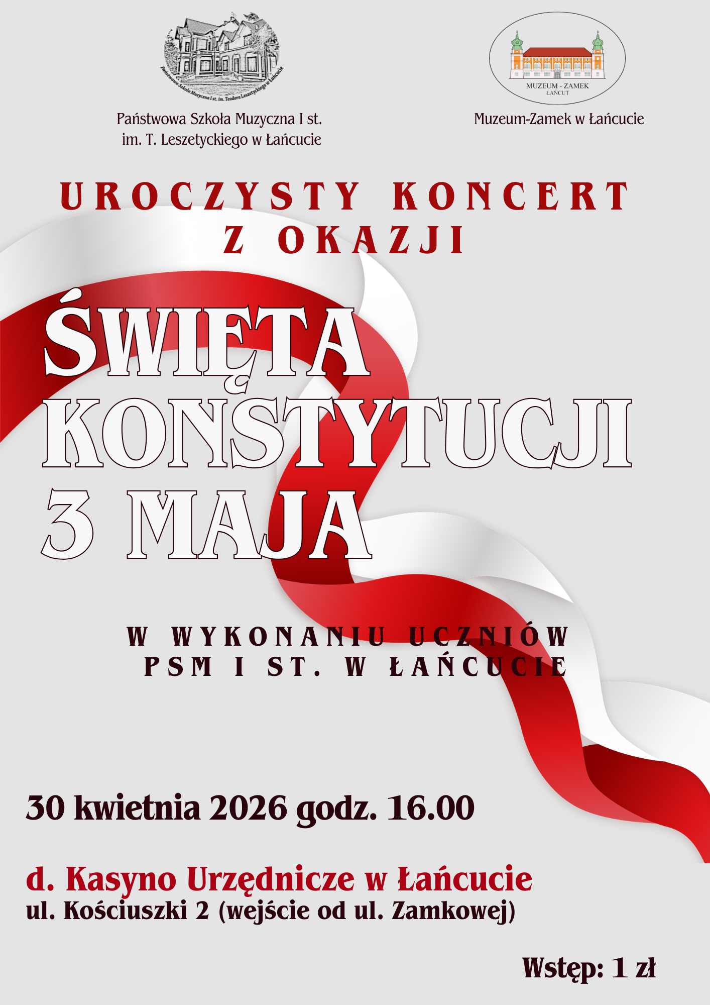 Państwowa Szkoła Muzyczna I st. im. Teodora Leszetyckiego w Łańcucie i Muzeum-Zamek w Łańcucie zapraszają na uroczysty koncert z okazji Święta 3 Maja.