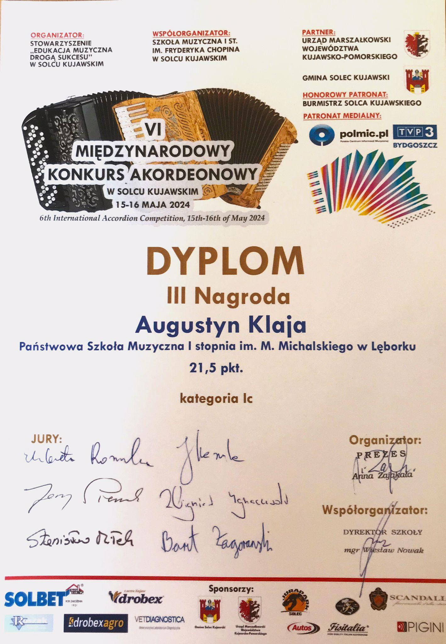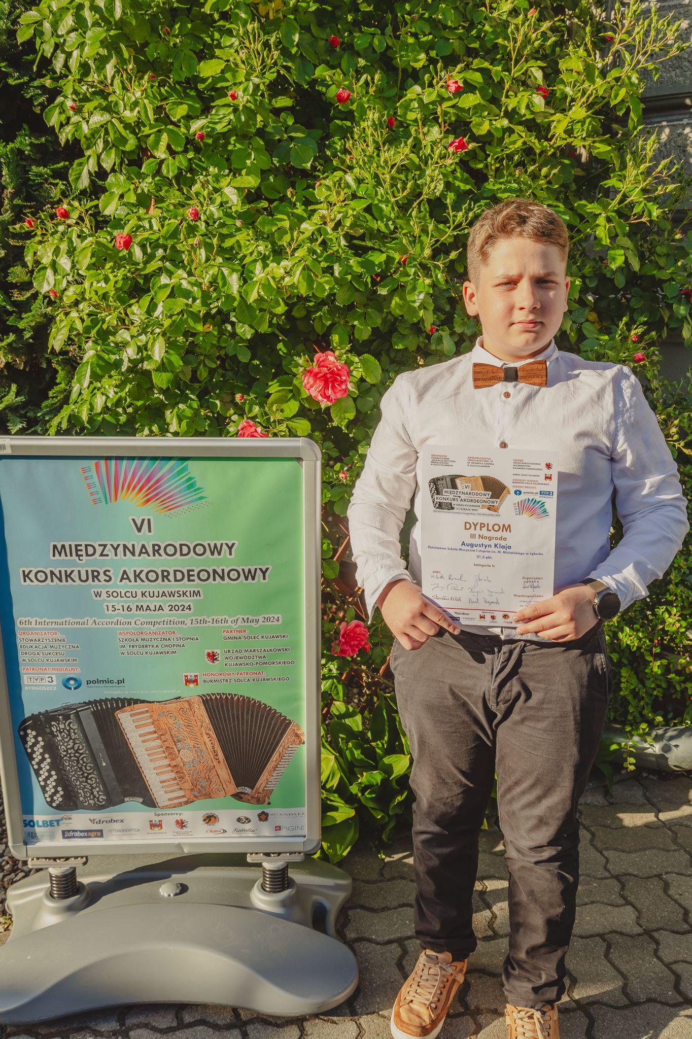 Augustyn Klaja - uczeń z klasy akordeonu Pana Marcina Wardulińskiego otrzymał III miejsce !