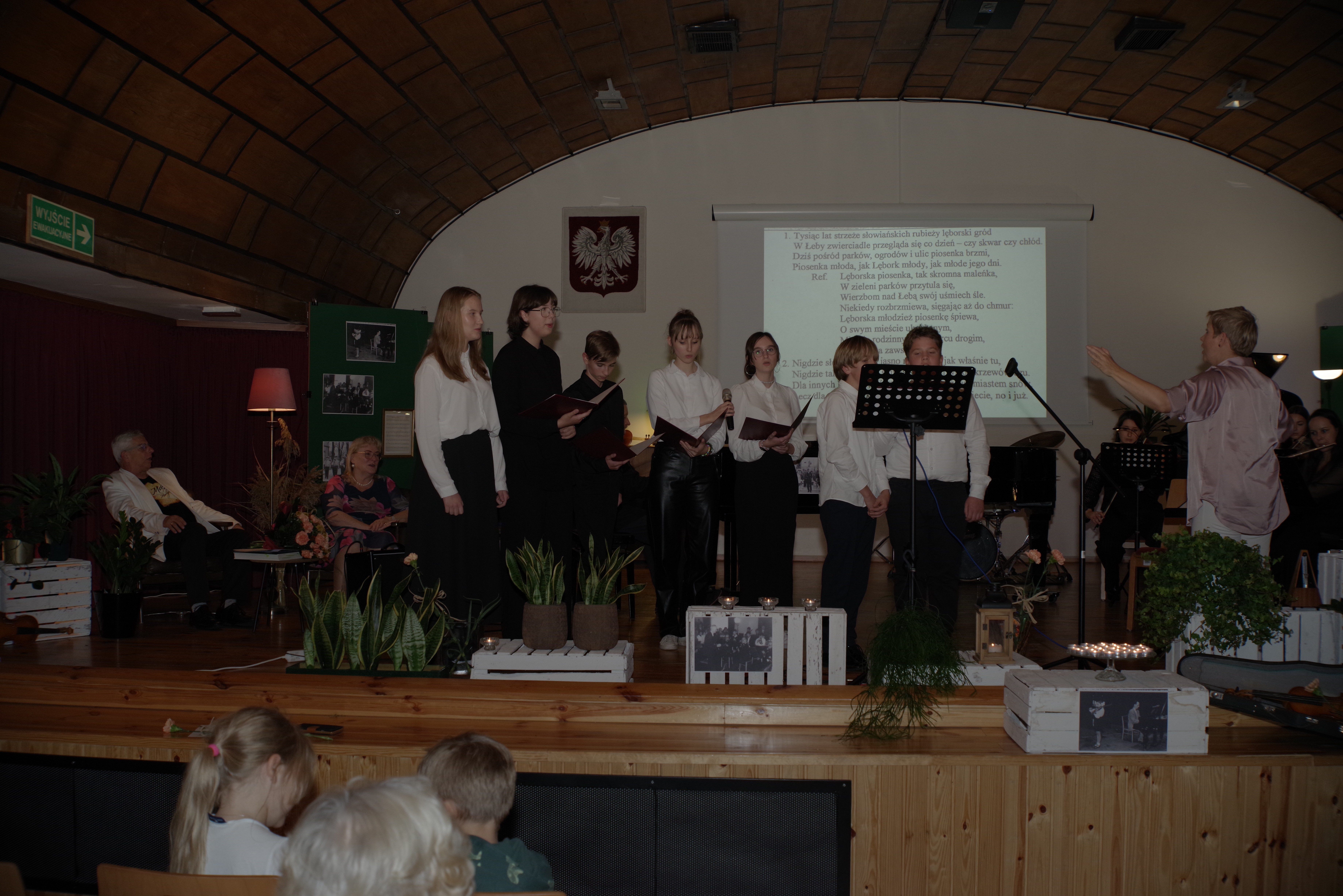 Na koniec koncertu uczniowie przygotowani przez Pana Mateusza Kempa wraz z zespołem instrumentalnym zachęcili do wspólnego śpiewania Lęborskiej Piosenki, do której muzykę napisał Mieczysław Michalski.