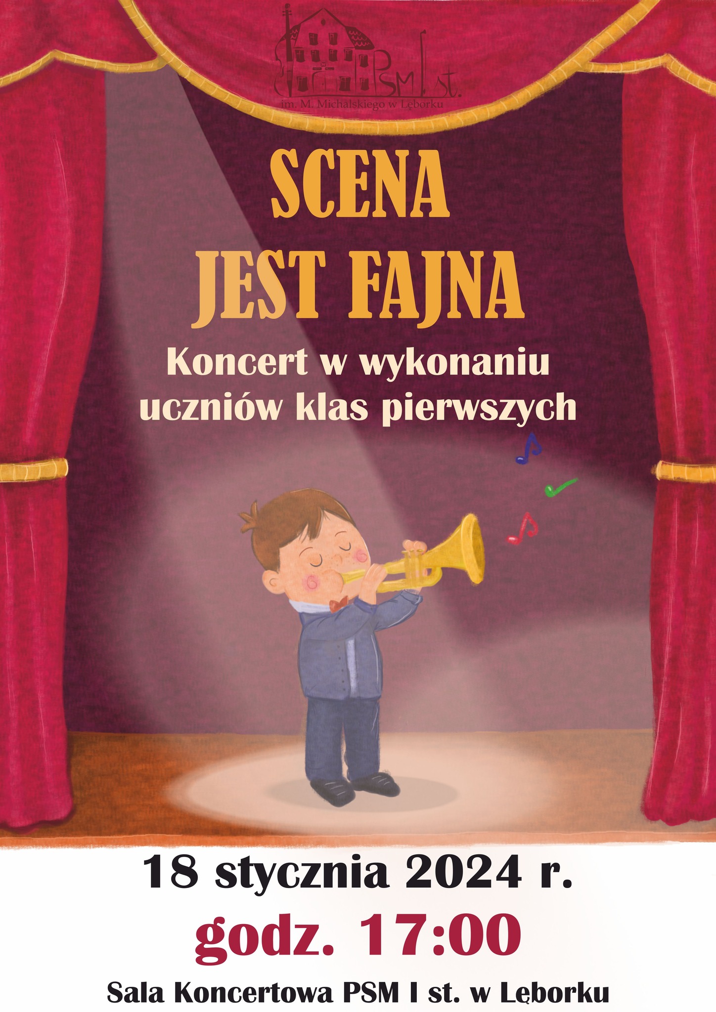 Zapraszamy serdecznie na pierwszy koncert w Nowym Roku "Scena jest fajna". 18 stycznia od godz. 17:00 na scenie PSM I st. w Lęborku po raz pierwszy zaprezentują się uczniowie klas pierwszych.